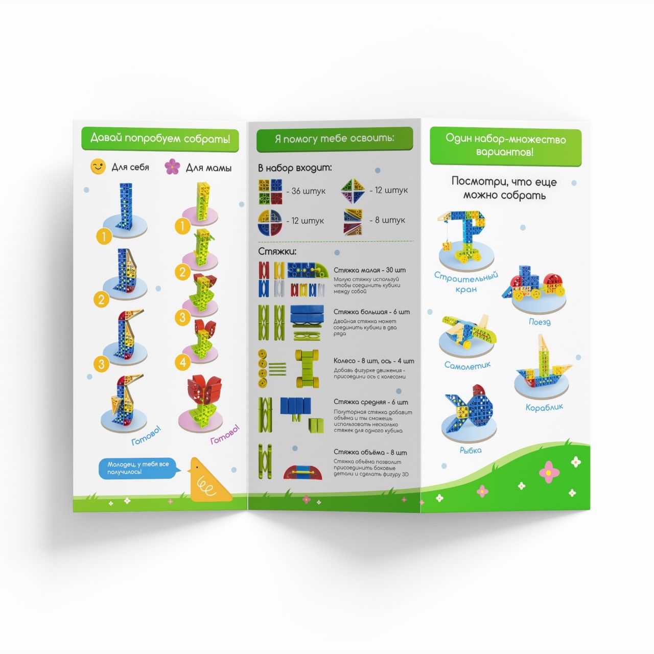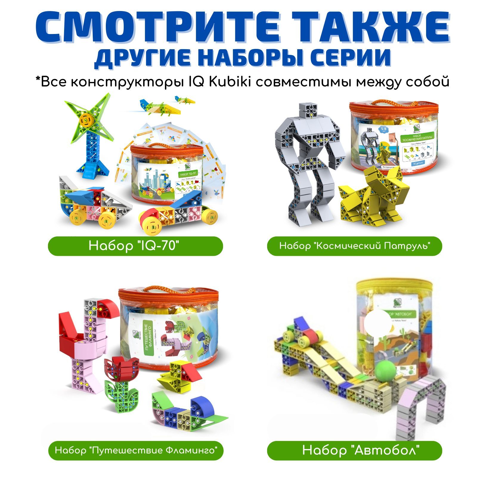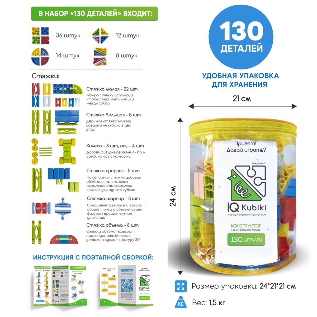 Конструктор детский IQ Kubiki - это развитие мышления и логики с малых лет.Текст при отключенной в браузере загрузке изображенийКонструктор который удобен в быту!Пожалуйста, замените этот текст Вашим собственным. Просто кликните по тексту, чтобы добавить свой текст. Настройте стиль текста в левой колонке.Текст при отключенной в браузере загрузке изображенийИнтересно будет всем!Безопасные и интересные конструкторы IQ подходят для разных возрастов и увлечений. Детские игровые наборы, разработанные брендом IQ Kubiki, направлены на пространственное, аналитическое, творческое, психическое развитие ребенка. Это увлекательный и эффективный метод обучения базовым навыкам, новым знаниям и уровням мышления!Текст при отключенной в браузере загрузке изображенийОдин набор - множество вариантов!Отсканируйте QR код на инструкции и получите доступ к схемам сборки с пошаговой инструкцией и видеороликами разных фигур от самых простых до более сложных 3D-моделей. I Q Кубики покажут, что можно собрать и расскажут как именно это сделать.Текстовое описание изображенияСмотрите также другие наборы бренда IQ Kubiki