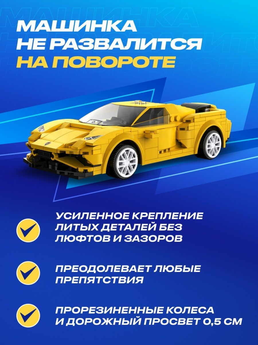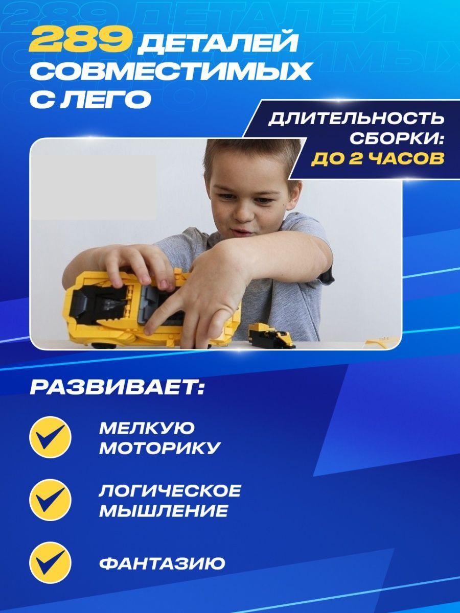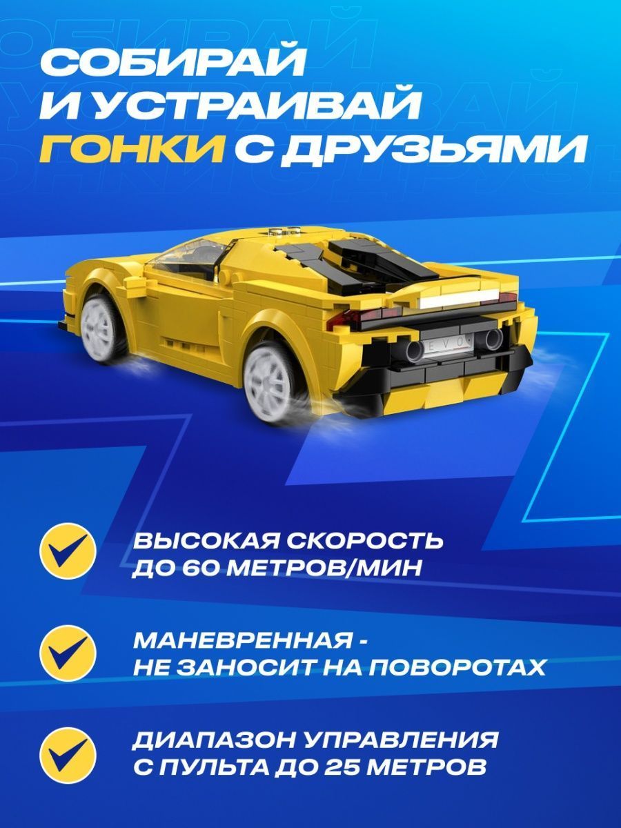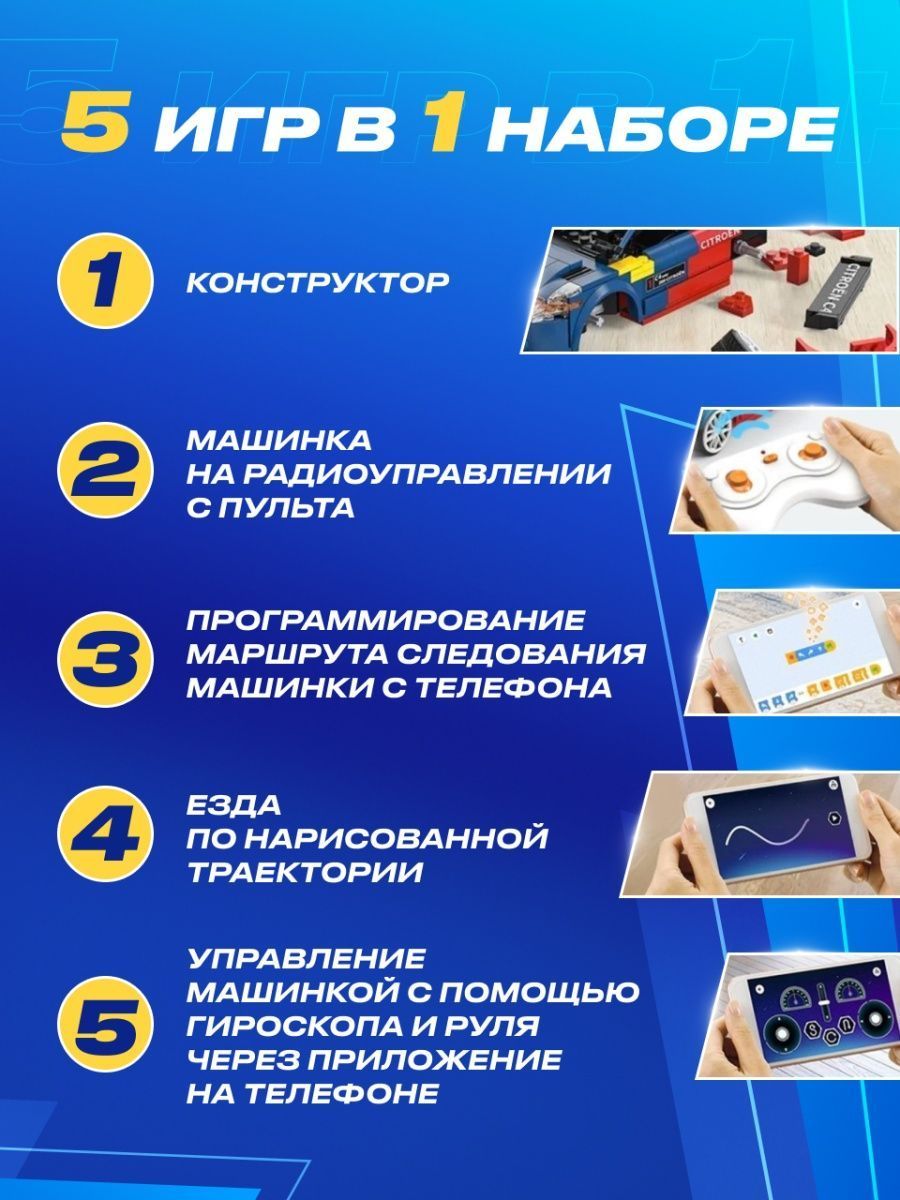 Вы сможете удивить не только маленького ребенка, но и самого взыскательного взрослого, будь то ваш друг или подруга, муж, любимый мужчина или близкий друг.Сразу 5 игр в 1 наборе Машинка электронный конструктор позволяет найти бесчисленные возможности для игры и создания собственных гоночных соревнований между взрослыми и детьми любых возрастов старше 6 лет. Благодаря увлекательным гоночным машинкам конструкторам маме и папе теперь не надо ломать голову, чем занять своих детей, чтобы выкроить пару часов свободного времени в тишине.Собирай и устраивай гонки с друзьями!Машинка электронный конструктор не оставит равнодушным никого: яркие и реалистичные детали сразу окунут всех взрослых и маленьких мальчиков и девочек в неизведанный мир скоростных супер тачек!Машинка не развалится на поворотеСобрав увлекательный 3d конструктор техник для мальчиков, вы станете счастливым обладателем радиоуправляемой машинки.