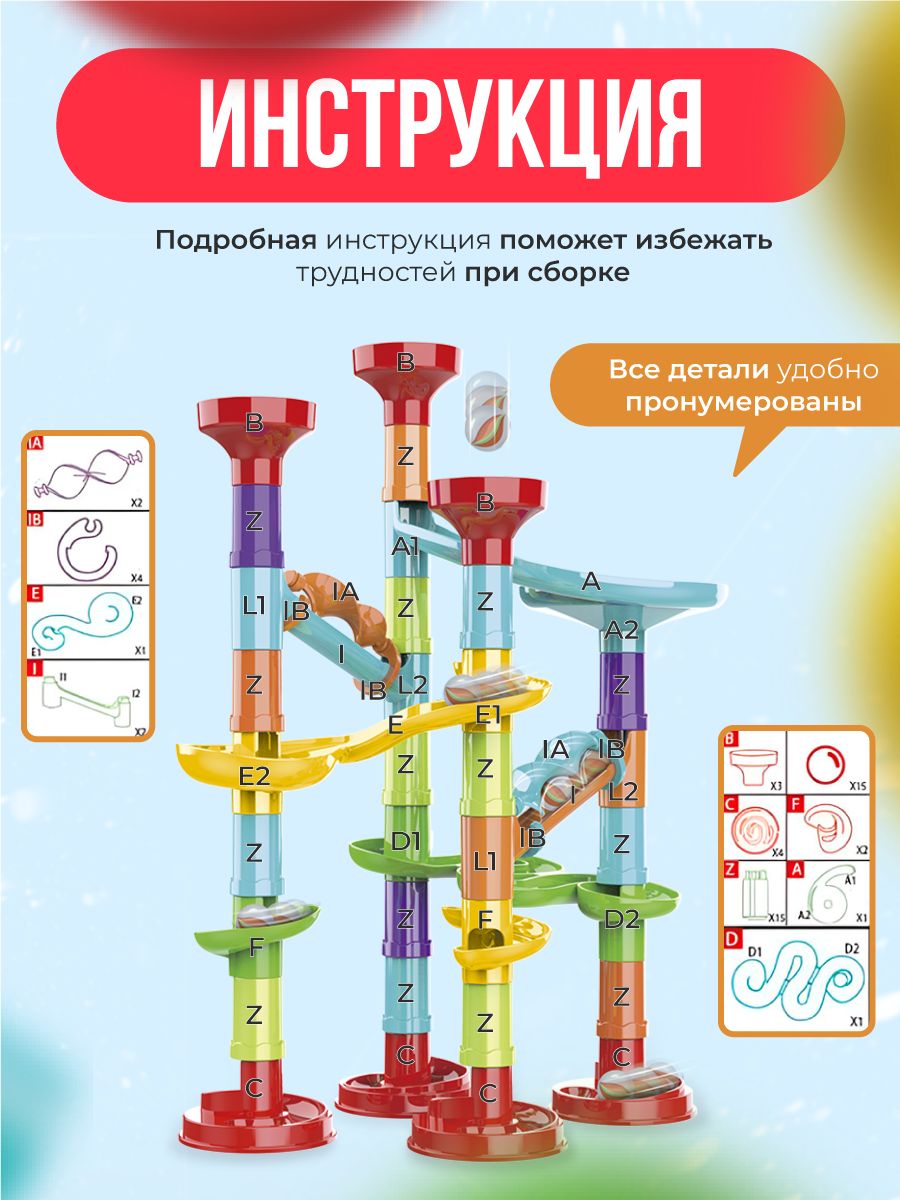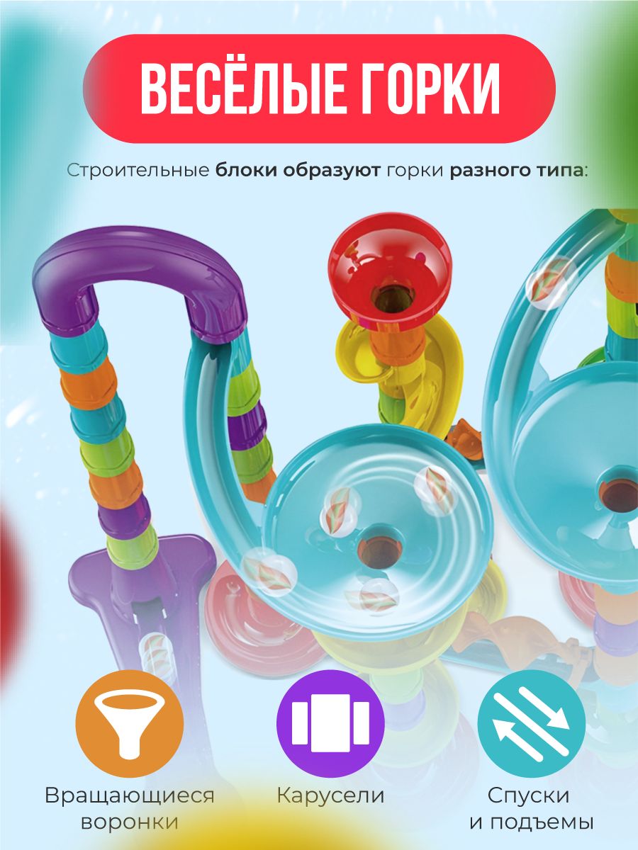 В конструкторе присутствуют s образные изгибы, Т образный перекрестки, горки, катапультные базы, несколько воронок для запуска шариков, винтовые лестницы что создаёт большое разнообразие в создании различных горок