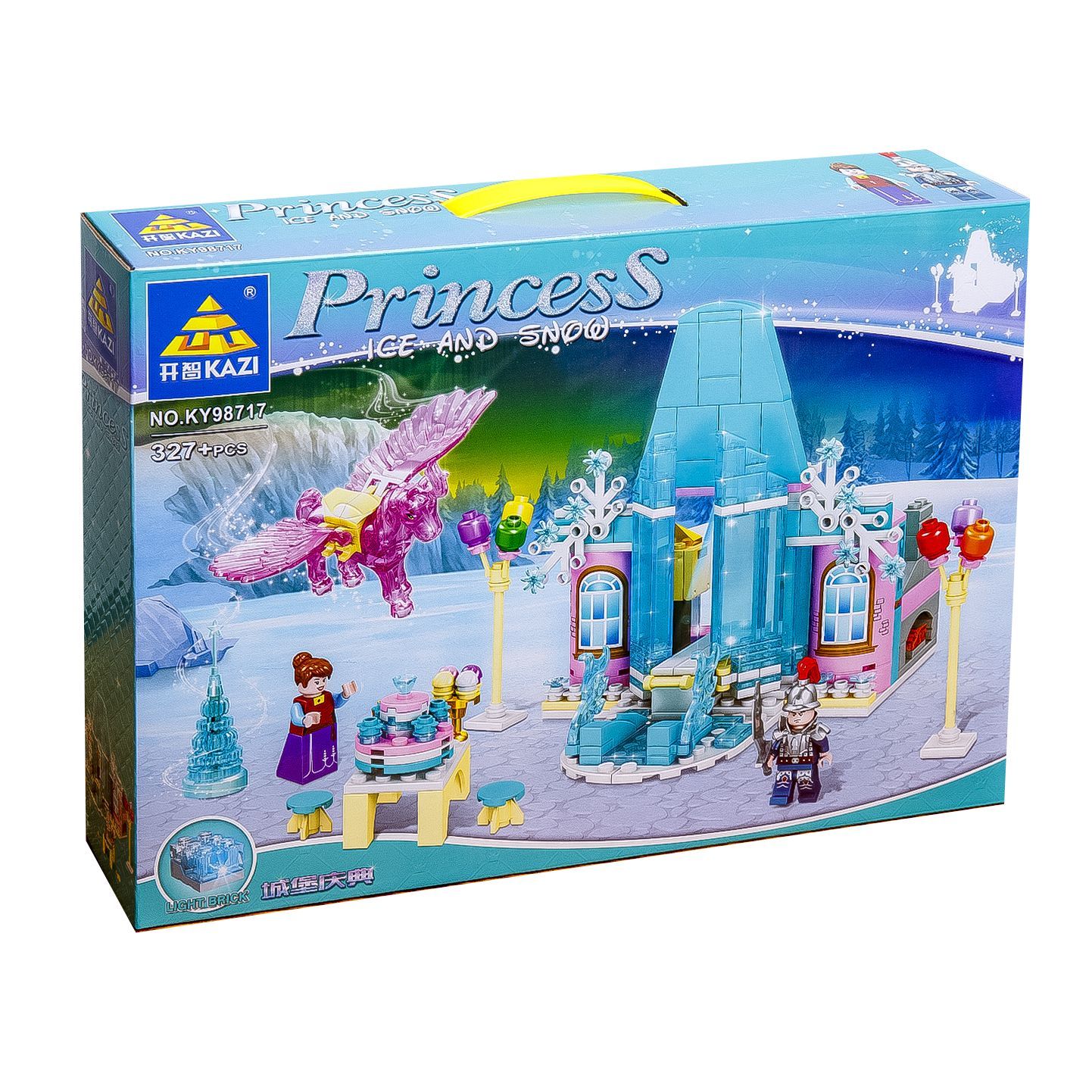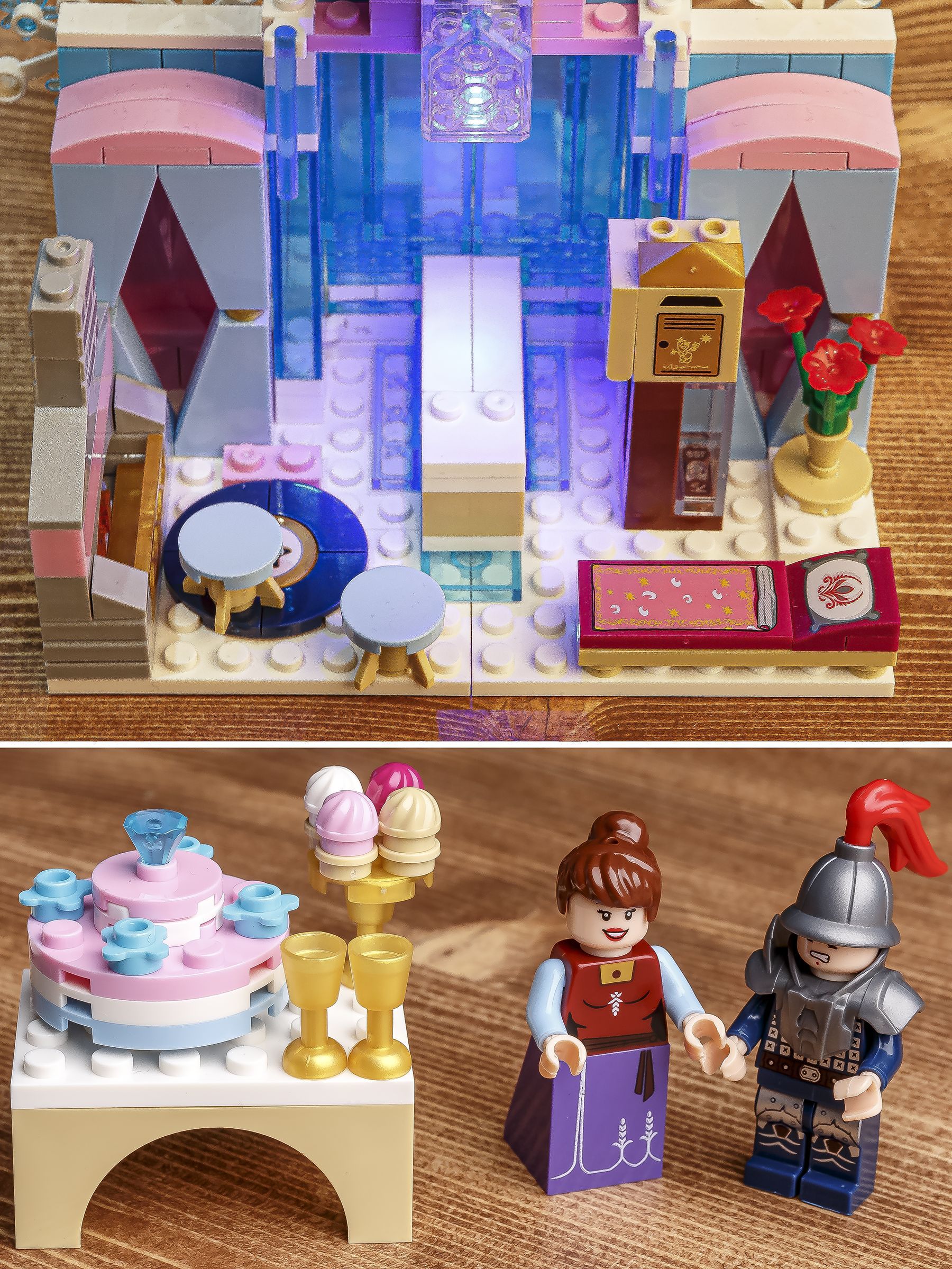 Замок принцессы украшен цветами и снежинками, а на его вершине расположен светящийся элемент, который подчеркивает его волшебность. Внутри замка есть все, что нужно для принцессы - кровать, столик со стульями, торт и бокалы, а также камин и небольшой шкаф.