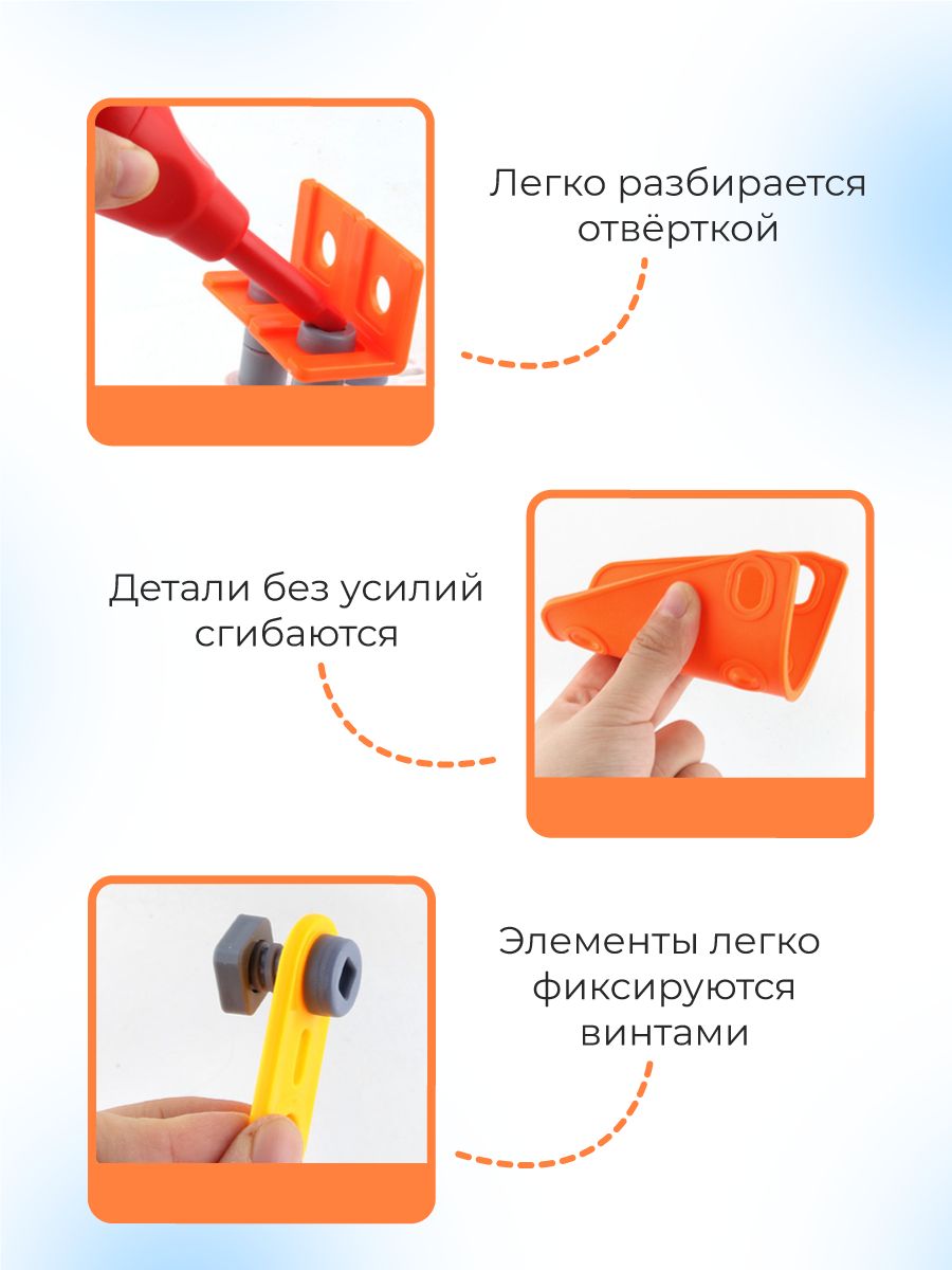 Детали конструктора гибкие и выполнены в ярких цветах из качественного материала.