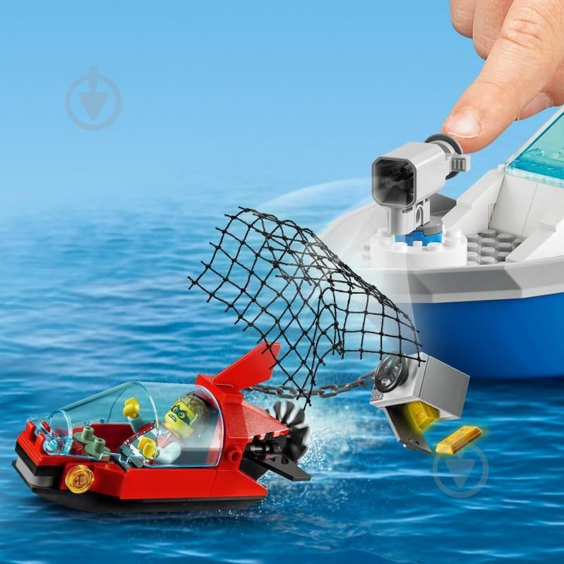В конструктор CITY входят: со стороны полиции - полицейский катер, оснащенный самым современным оружием для ловли преступников, беспилотный дрон и скоростной гидроцикл. Со стороны грабителей – подводная лодка преступника и украденный из банка сейф с золотом.  Всего 276 деталей.