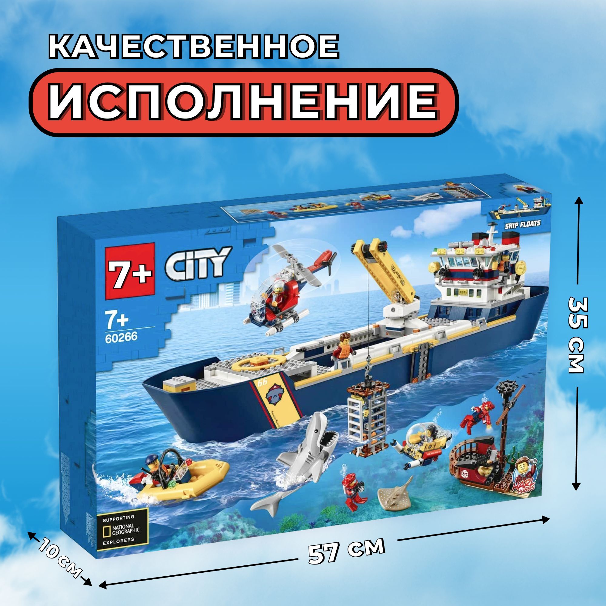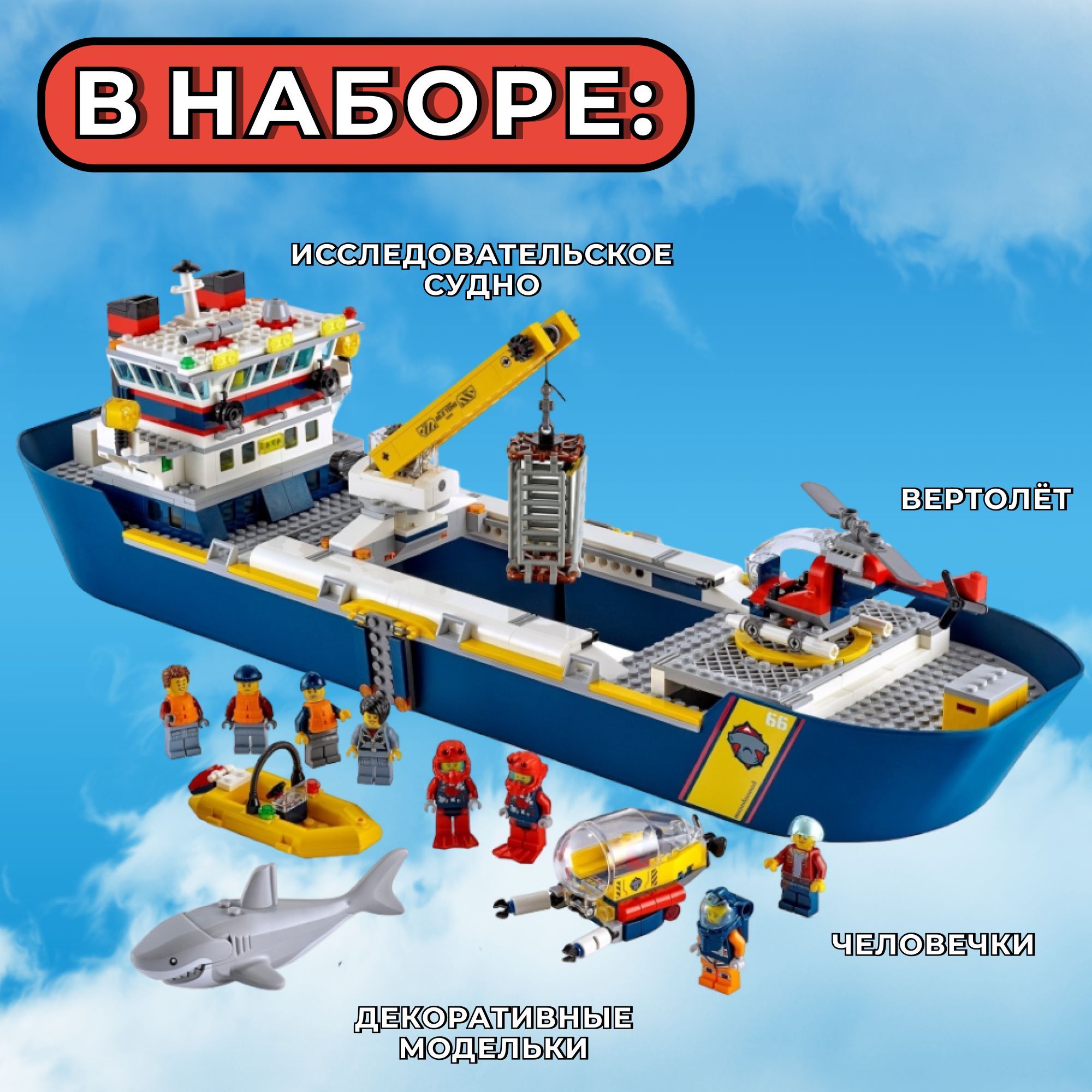 Комплектация City набор «Океан. Исследовательское судно»:- 745 деталей лего блоков;