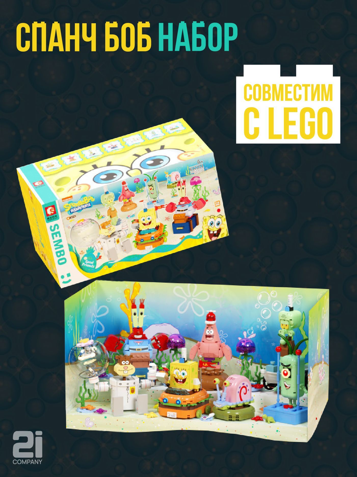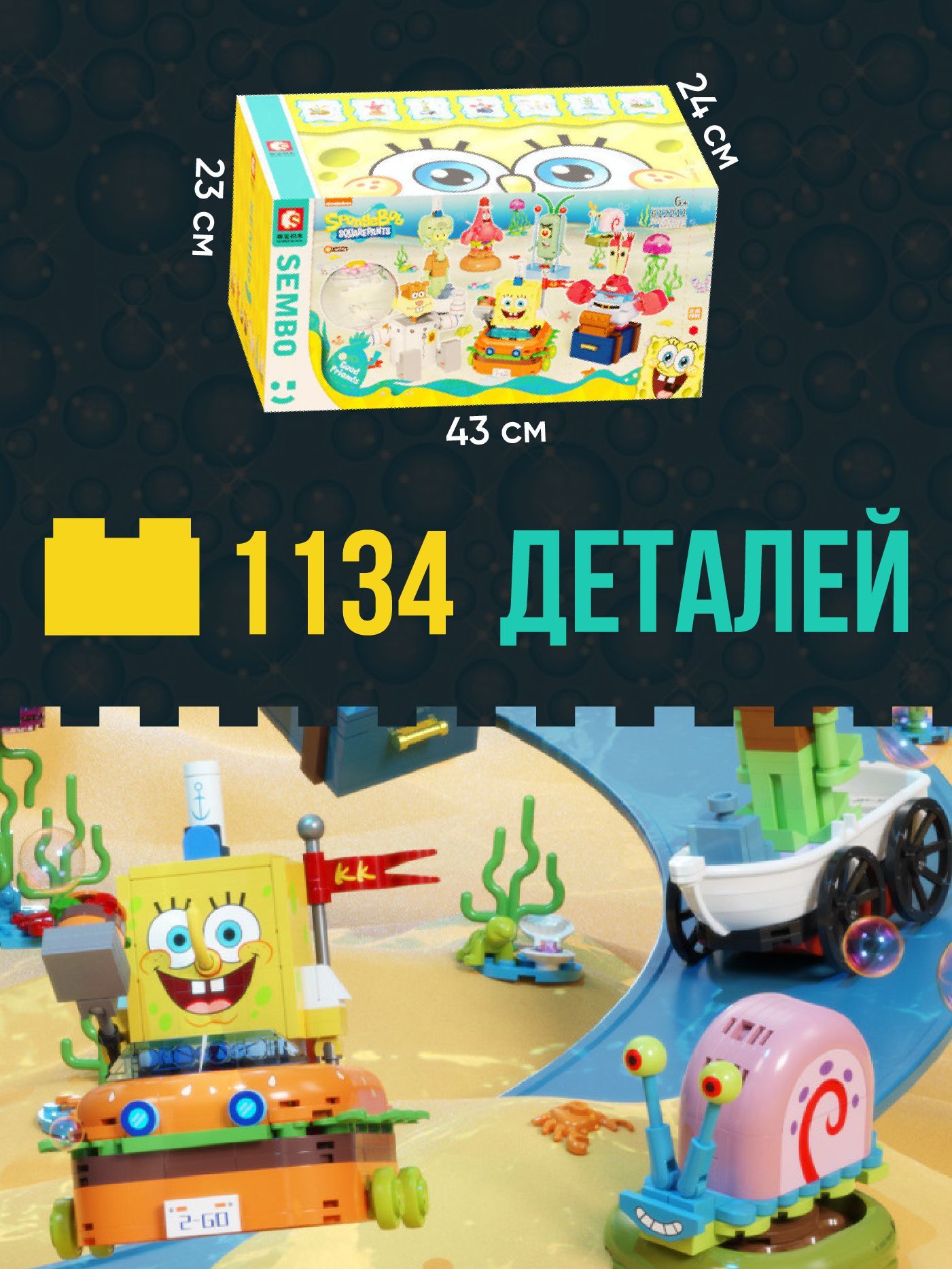 Описание: Конструктор отличного качества – 1134 детали. Герои Бикини Боттома приглашают вас в свой сумасшедший, яркий мир. Приобретая данный набор вы сможете собрать любимых и знакомых с детства персонажей. В комплекте основные герои из мультфильма «Губка Боб Квадратные Штаны». Каждый персонаж отдельно функционирует и имеет свои особенности, которые не оставят равнодушным ни одного ребенка или даже взрослого. У Планктона крутится и светится глаз, у Белки Сэнди светится шлем скафандра, а у самого Спанч боба светится машинка-бургер. Состав персонажей конструктора: Губка Боб Квадратные Штаны (Жёлтая антропоморфная морская губка). Гэри Уилсон-младший (Домашняя морская улитка Губки Боба). Патрик Стар (Розовая морская звезда, которая живёт под камнем и носит шорты с цветами). Сквидвард Тентаклс (Кальмар с большим носом, работает кассиром в ресторане «Красти Краб»). Юджин Гарольд «Мистер» Крабс (Красный краб, который живёт в доме в форме якоря со своей дочерью Перл). Сандра «Сэнди» Чикс (Белка из Техаса, которая живёт в наполненном воздухом стеклянном куполе и носит гидрокостюм, чтобы дышать под водой). Шелдон Джей Планктон (Одноглазый организм из газа).
