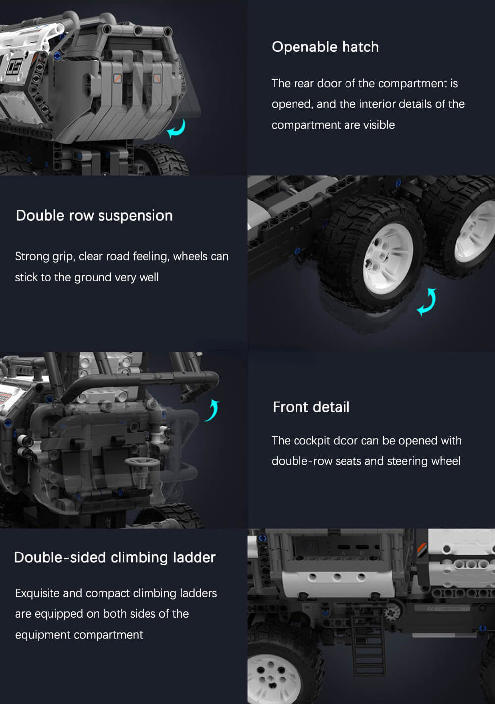 Грузовик Herdsman построен из более чем 1070 строительных блоков, оснащен 6-колесными противоскользящими шинами, 3 кабинами с различными функциями, стабильной и изысканной конструкцией шасси, и идеальное сочетание рулевого механизма и двигателя.