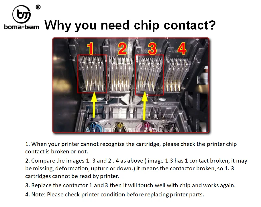 Функция подключения, контактный контакт является относительно тонким, и количество раз подключения и вставки чернильного картриджа, вероятно, приведет к повреждению контактов, ударов или вмятин, И сделать контакт чипа плохим, в результате чего машина не может распознать чип и сообщить об ошибке!