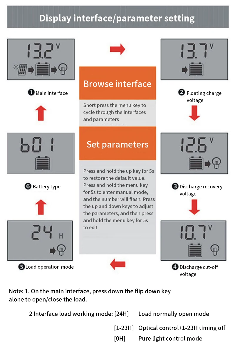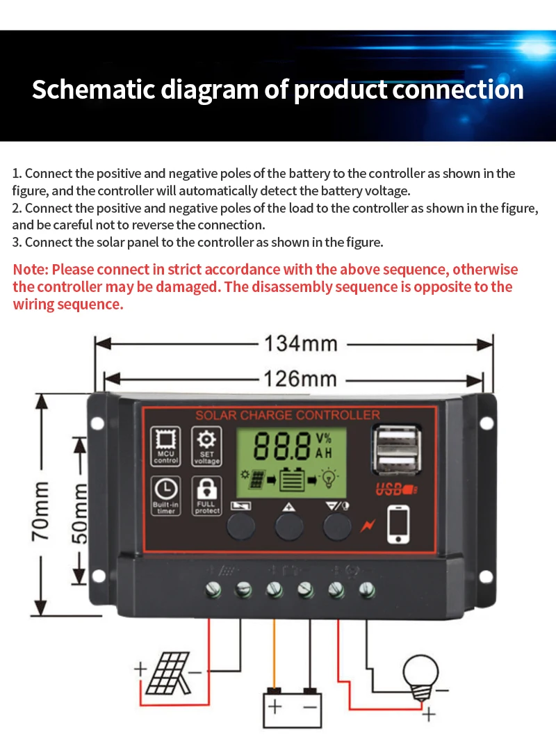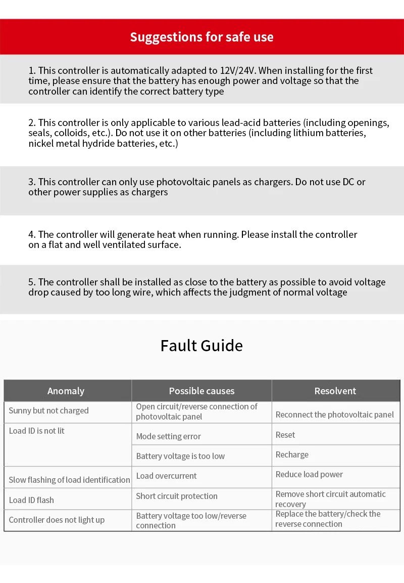5. Этот контроллер может использовать только фотоэлектрическую панель в качестве источника зарядки, не использовать постоянный ток или другой источник питания в качестве источника зарядки.