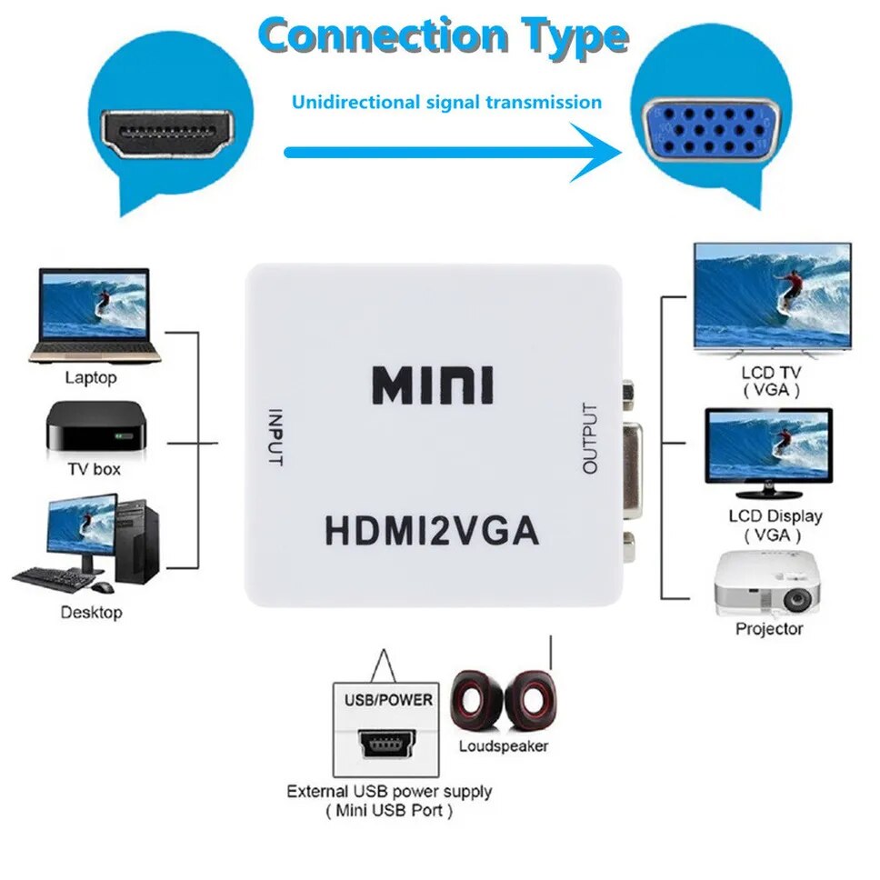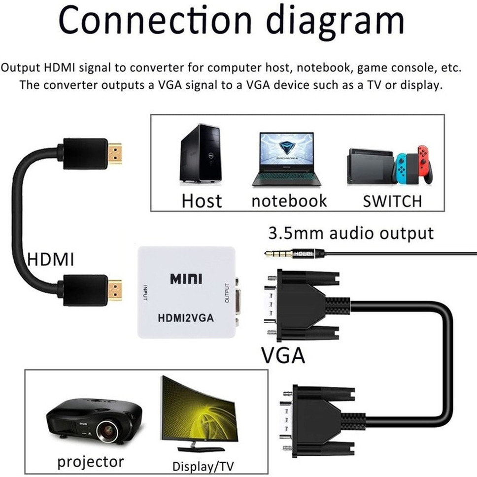 HDMI-совместимый с VGA видеоконвертер высокой четкости, который преобразует HDMI-совместимый цифровой сигнал в VGA аналоговый сигнал и аналоговый аудиосигнал. HDMI-совместимое соединение сигналов для PS3 для XBOX360, Blue-ray DVD, HD телеприставки, CRT/светодиодный дисплей и т. Д. Вы можете легко смотреть hd-видео на обычном телевизоре без интерфейса, совместимого с HDMI.
