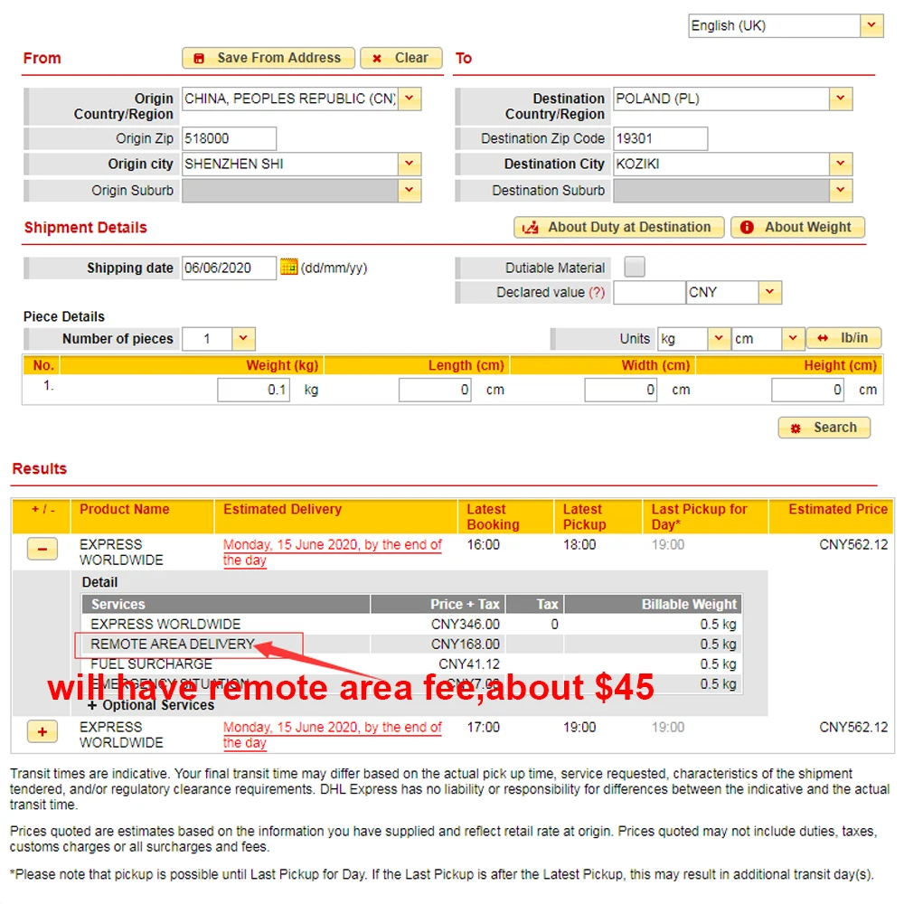 Если вы выберете DHL.UPS, вам необходимо проверить, относится ли ваш адрес доставки к удаленному району, если он относится к адресу удаленного района, вам необходимо дополнительно оплатить удаленную плату в размере 45 долларов США.