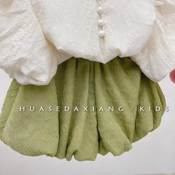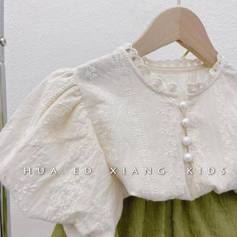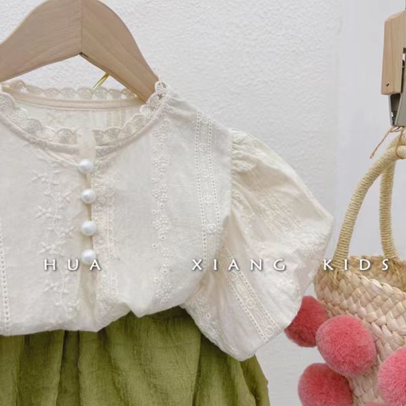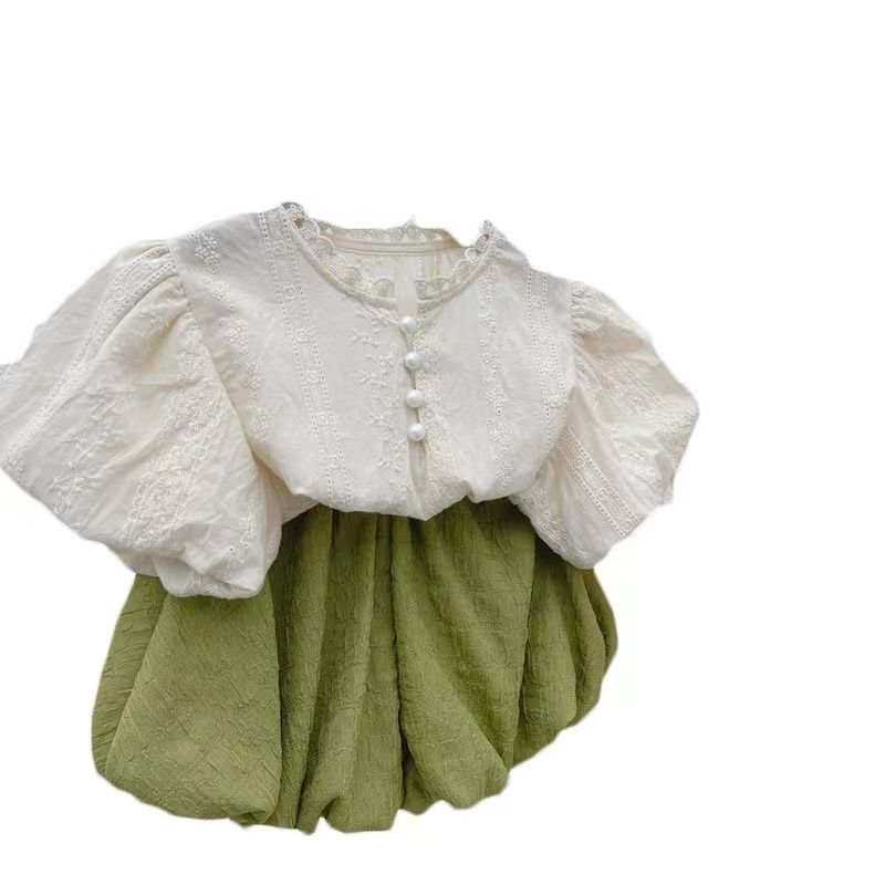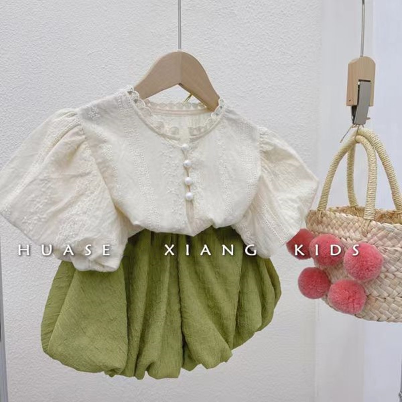 Корейская детская одежда 2023, летняя рубашка с круглым вырезом и рукавами-фонариками с вышивкой для маленьких девочек, брюки с цветочным узором, комплект из двух предметов