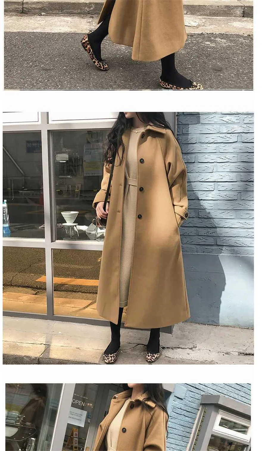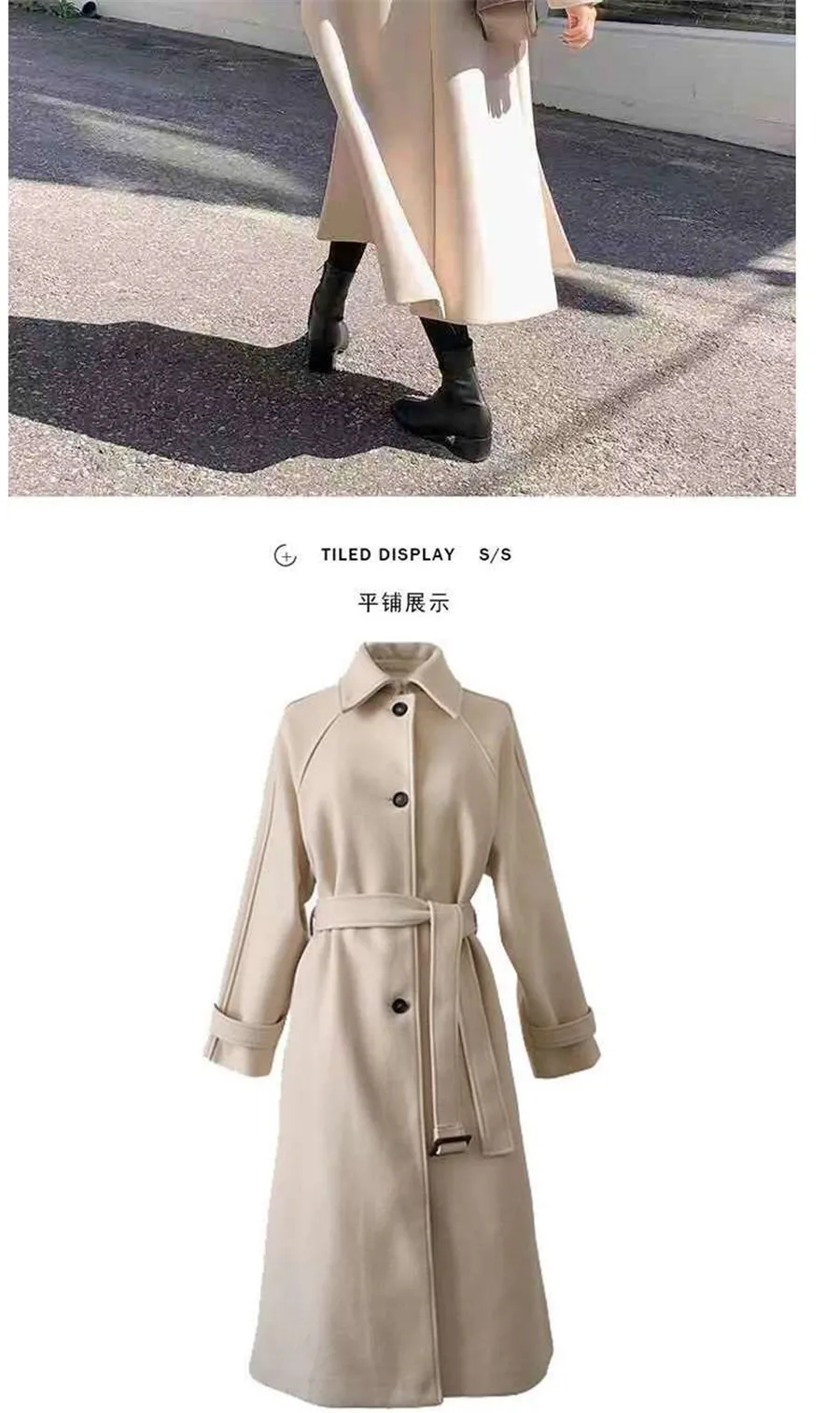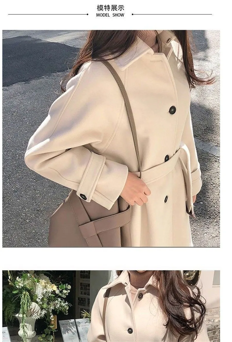 Корейская модная женская шерстяная куртка, зимнее плотное теплое длинное пальто, однотонное женское повседневное шерстяное пальто с отложным воротником и поясом