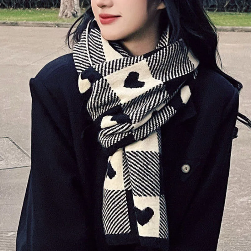 Корейские шарфы для женщин на осень и зиму, утепленный вязаный шарф с сердечками, клетчатый шарф, Длинные Теплые шарфы, подарки