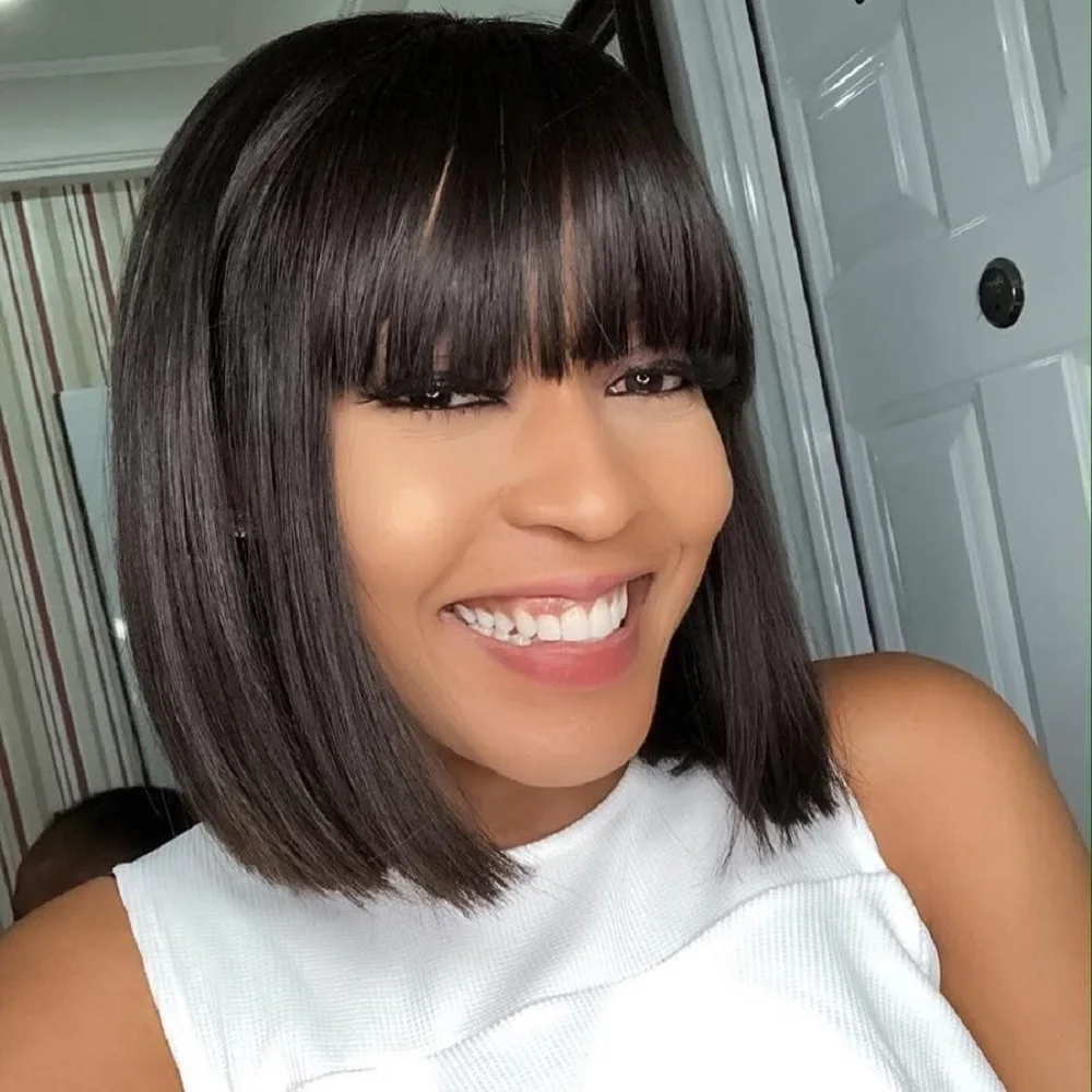 Brown Short Bob Human Hair Wig with Bangs Fringe Wig for Women Straight Remy Hair Bob Wigs With Bangs Dark Brown Hair Wig