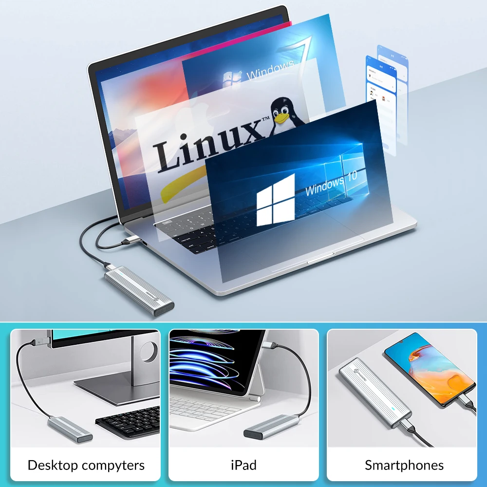 Поддержка твердотельного накопителя M Key (Протокол NVMe) / M & B Key (Протокол NVME и SATA), несовместимого с твердотельным накопителем B Key, с кабелем Type-C-Type-C длиной 30 см.