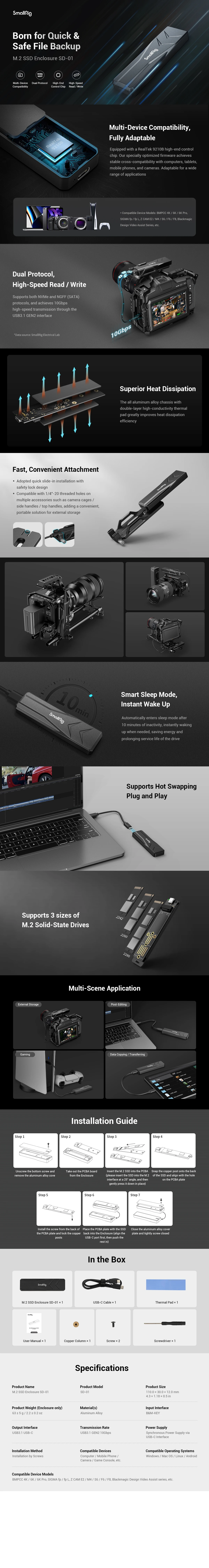 SmallRig M.2 SSD корпус SD-01С широким диапазоном применения и отличной производительностью изготовлен из алюминиевого сплава в целом, а его хорошая теплоотдача обеспечивается в дополнение к его небольшим размерам. SD-01 оснащен USB-C интерфейс с USB3.1 GEN2 10 Гбит/с скорость спецификации. M.2 твердотельный жесткий диск с тремя различными спецификациями 2242, 2260 и 2280 может быть установлен внутри, поддерживая двойной протокол NVME и NGFF (SATA). Корпус поддерживает функцию интеллектуального режима работы, которая является энергосберегающей и экологически чистой, уменьшая нагрев жесткого диска и продлевая срок службы.