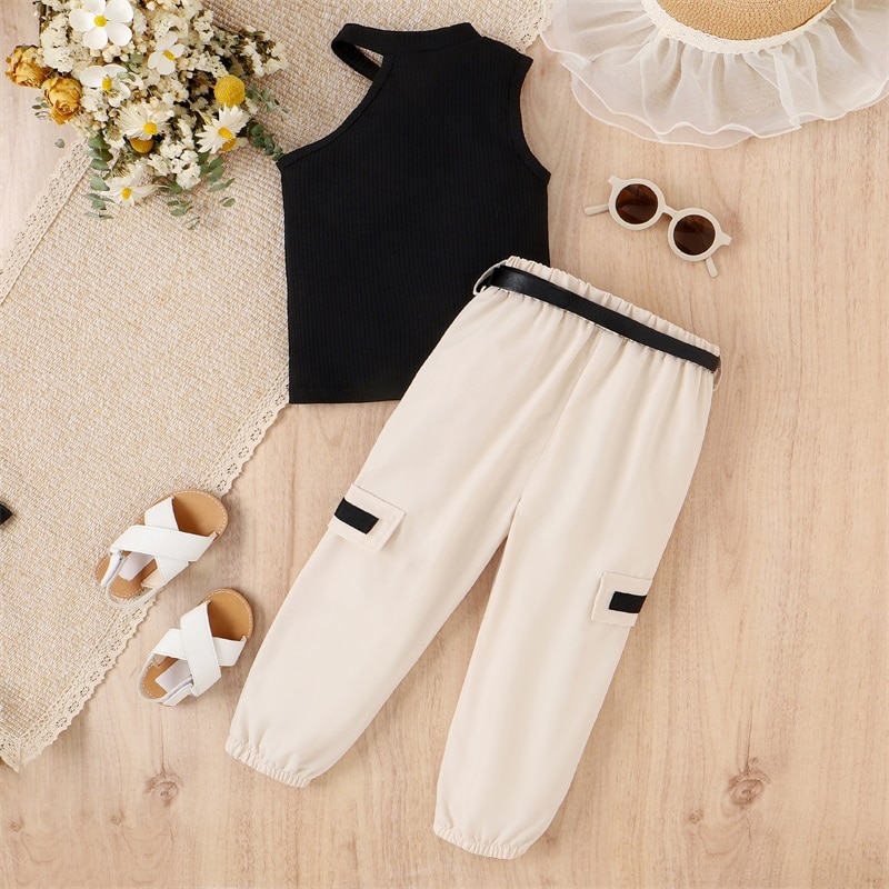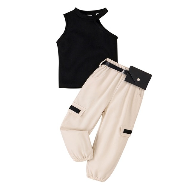 Детские костюмы для девочек, однотонные топы без рукавов на одно плечо, карманы, брюки-карго, поясная сумка, костюм из 3 предметов