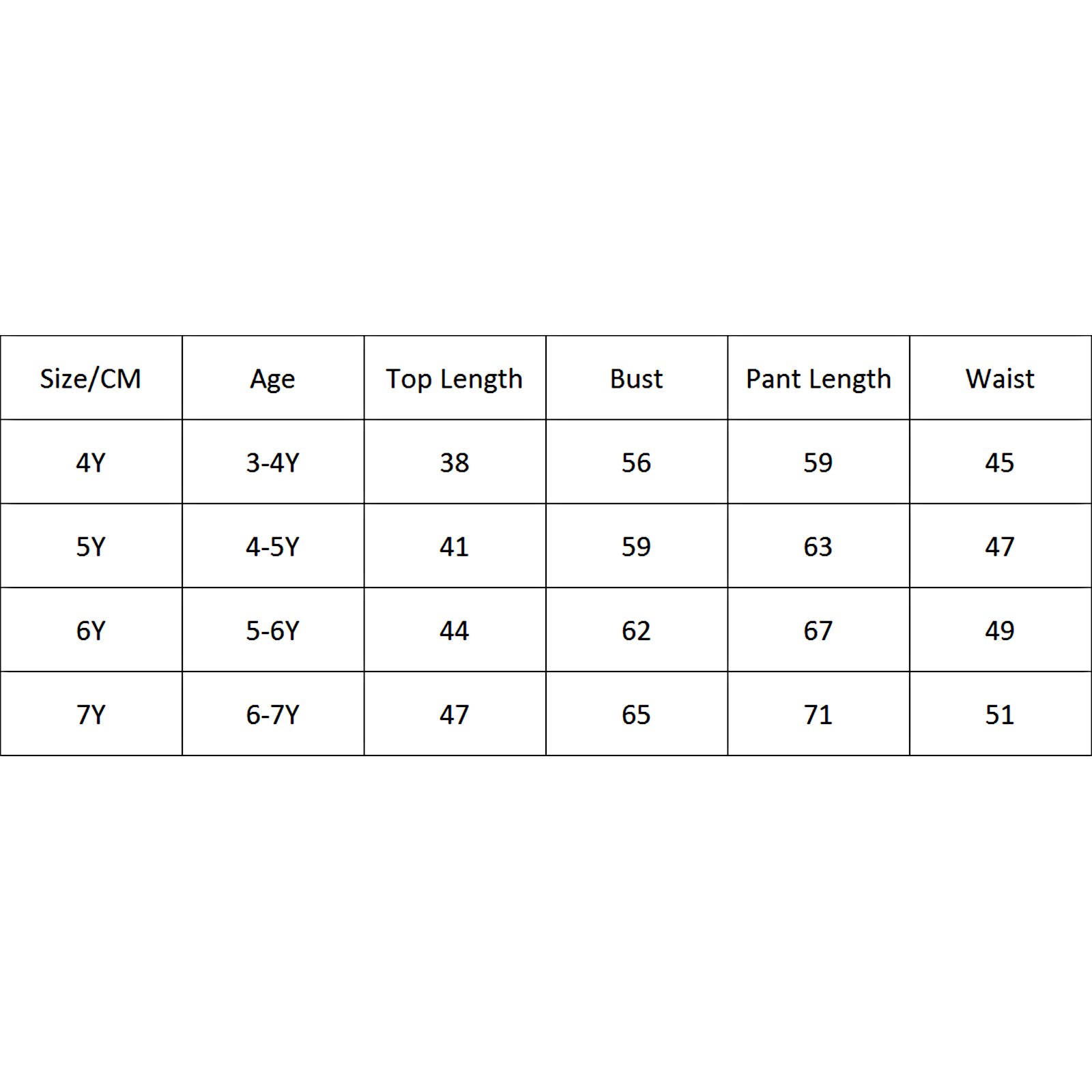 7Y Длина топа: 18,50 Бюст: 25,59 Длина брюк: 27,95 Талия: 20,08 Рекомендуемый возраст: От 6 до 7 лет