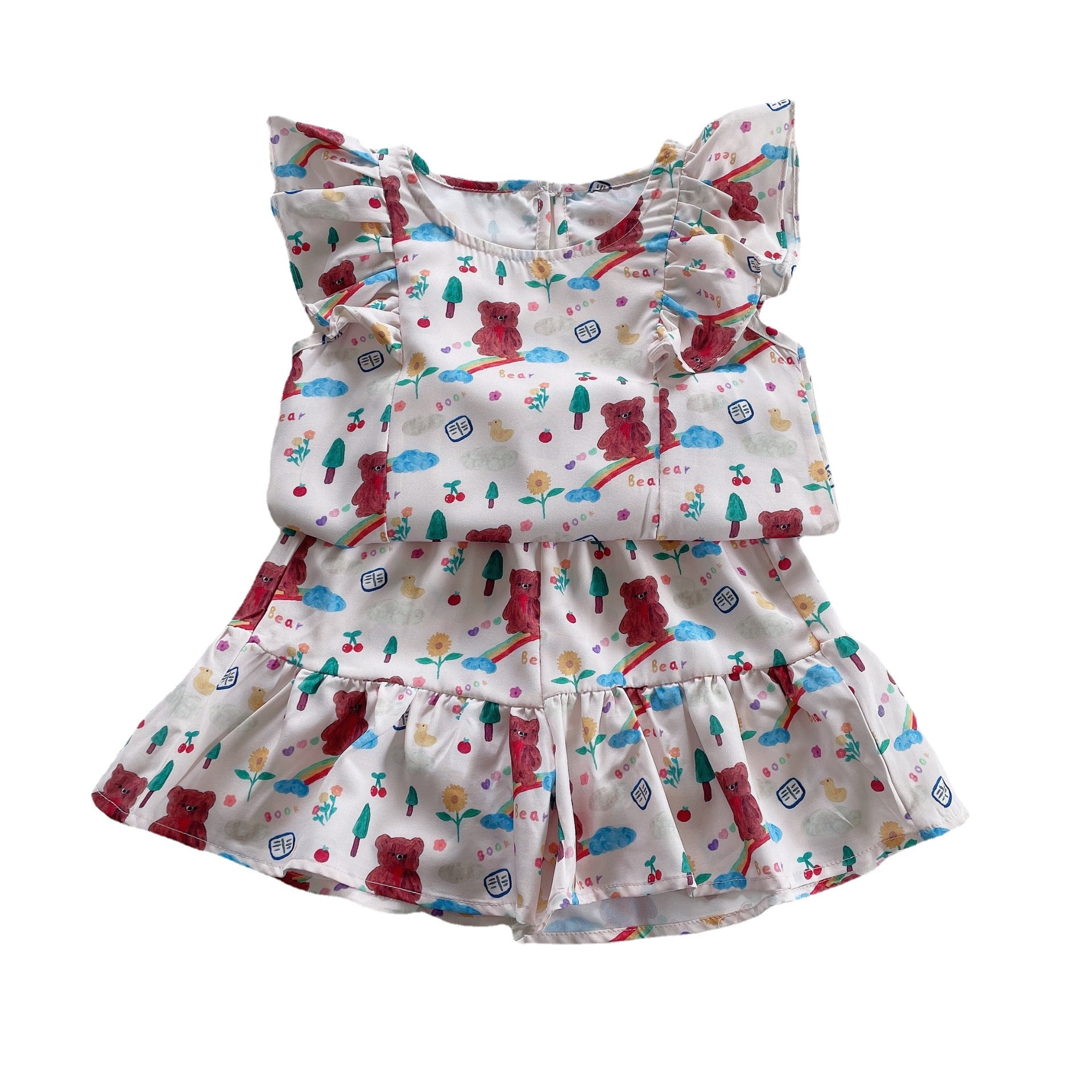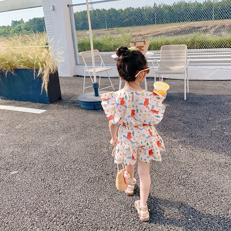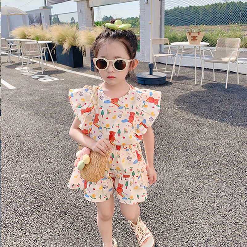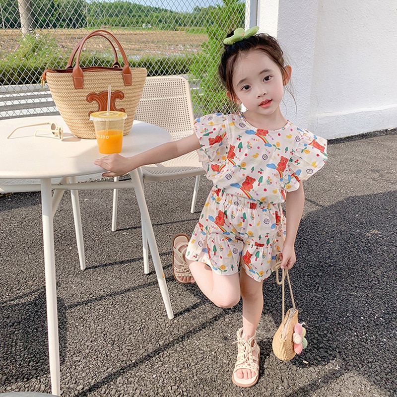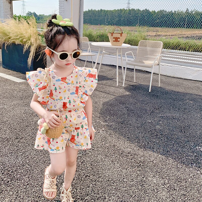 Костюм для девочек, Новинка лета 2023, корейский вариант, Топ среднего размера с мультяшным принтом и шорты для детей, комплект из двух предметов