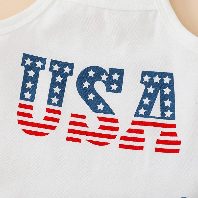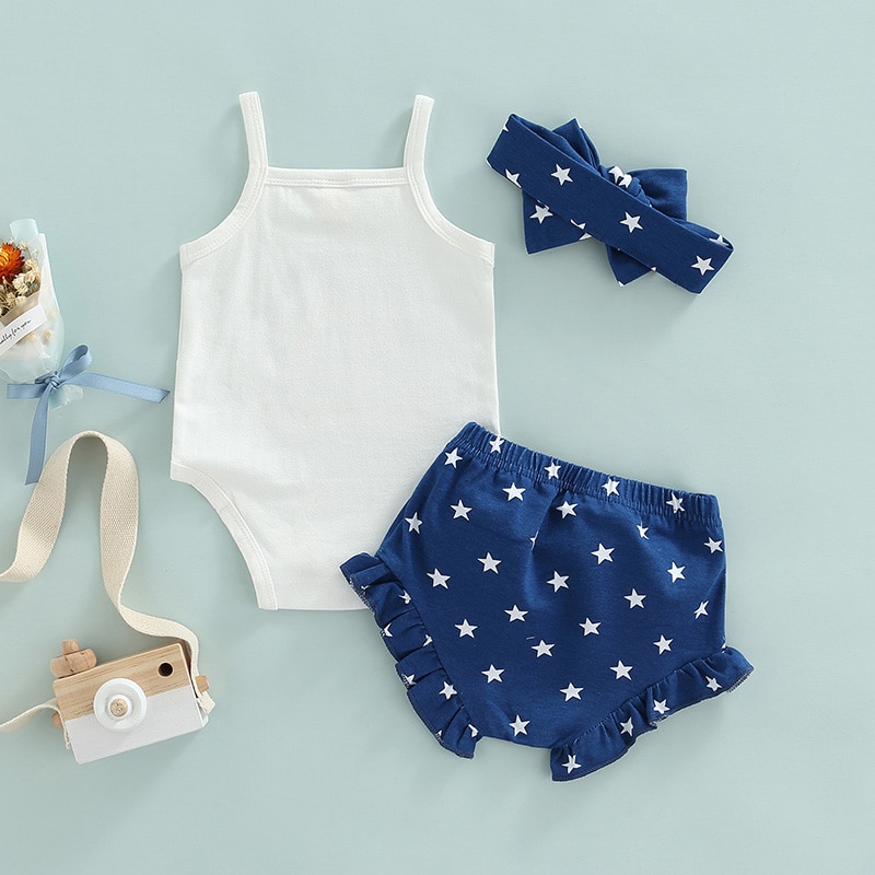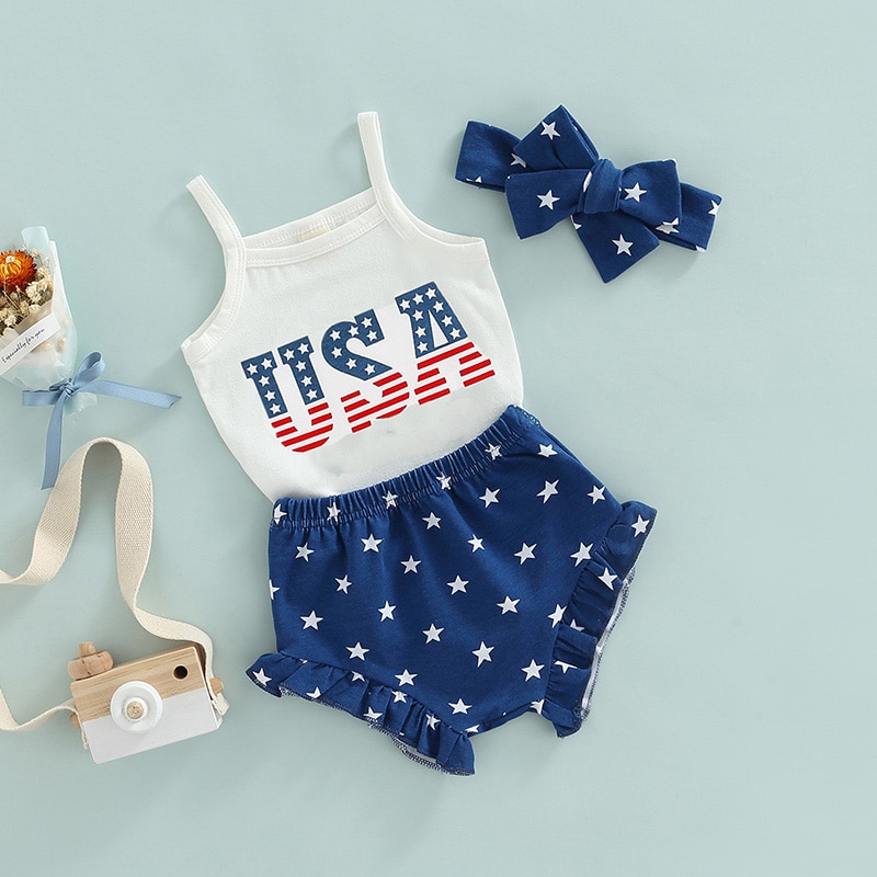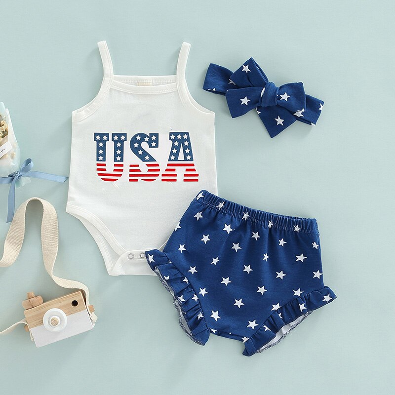 Костюм для маленьких девочек 4 июля, комбинезон без рукавов с надписью + шорты с оборками + повязка на голову
