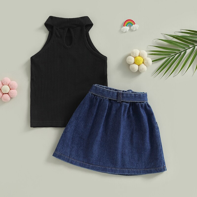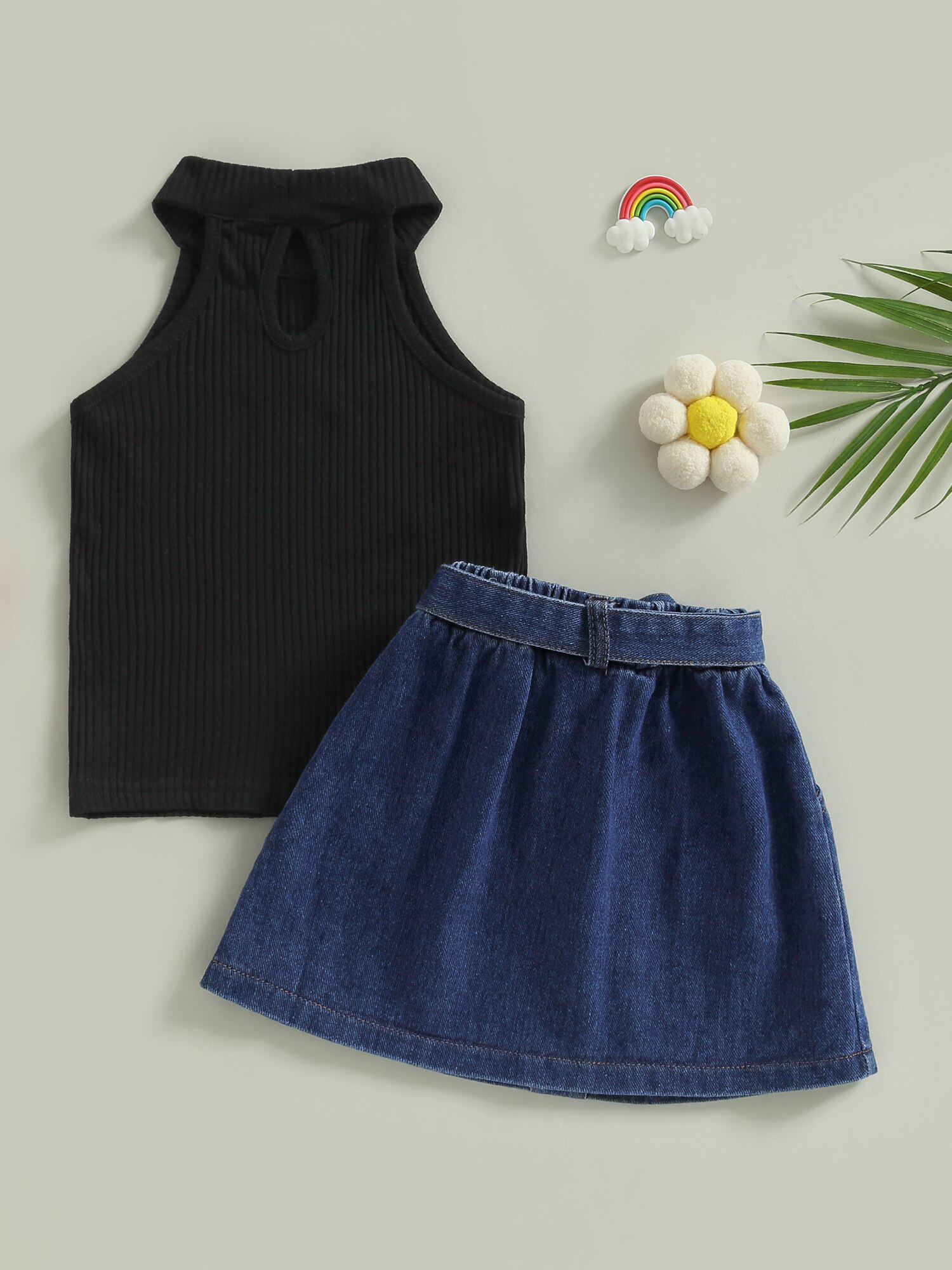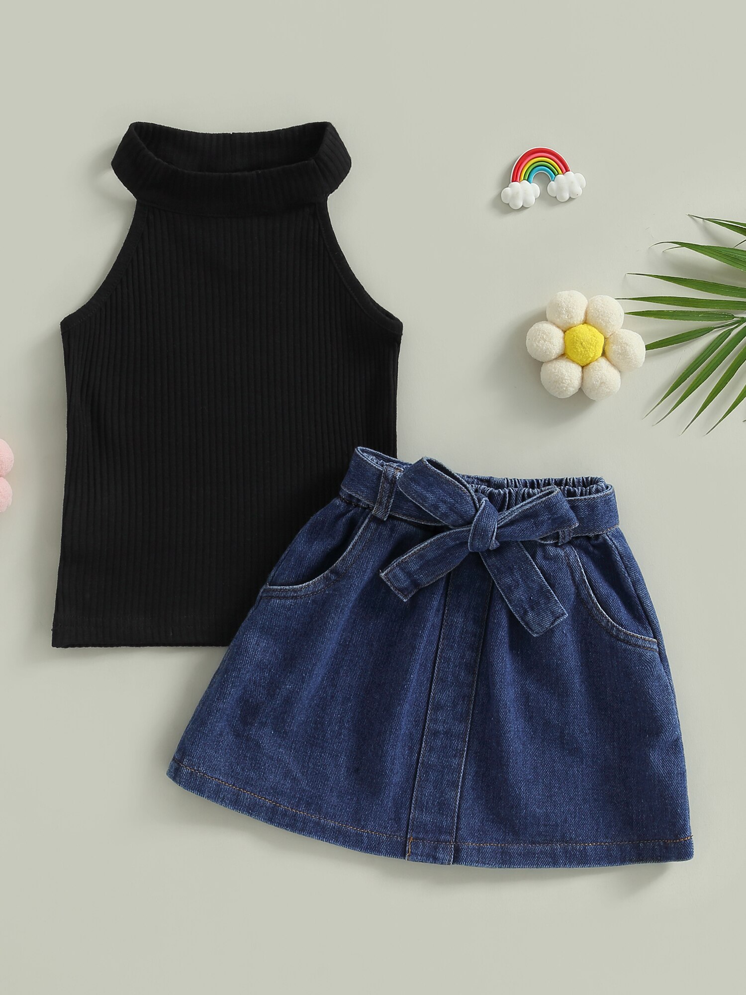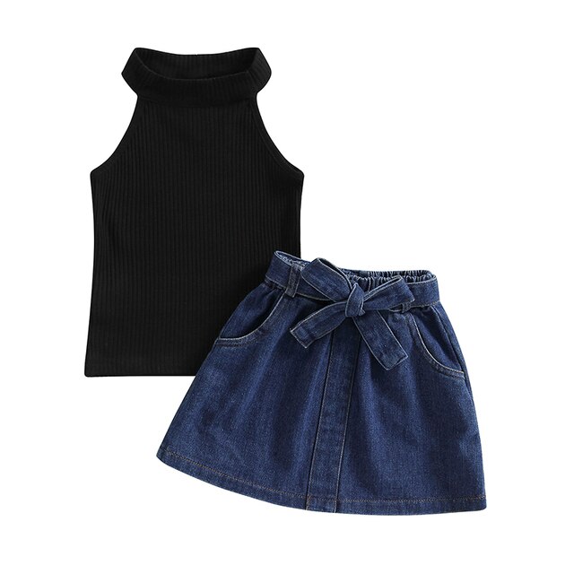 Костюм с юбкой для маленьких девочек, вязаный жилет без рукавов, топы с подкладкой, джинсовая короткая юбка с поясом на талии