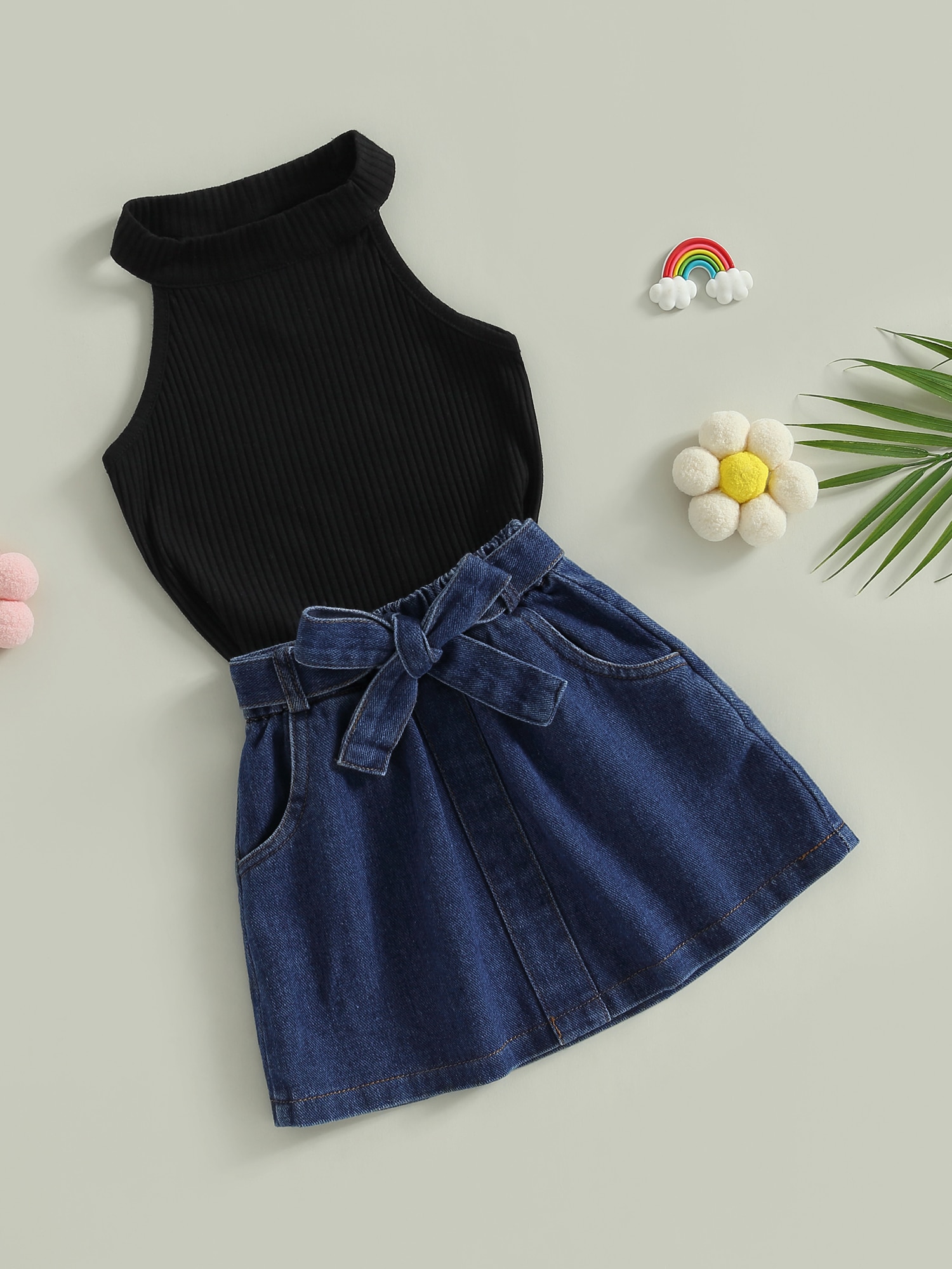 Описание: Костюм с юбкой для девочек, вязаный жилет без рукавов + джинсовая короткая юбка с A-Lined + пояс на талии