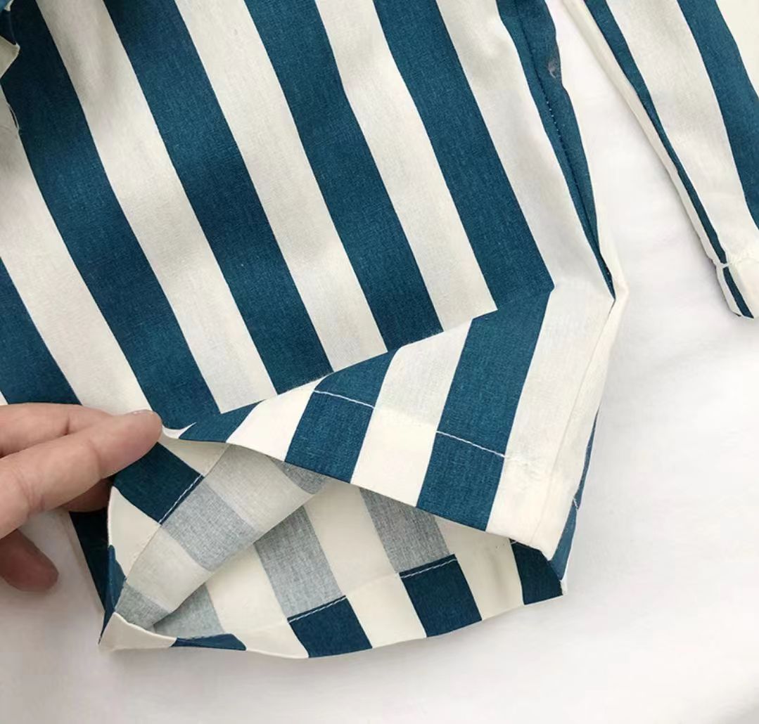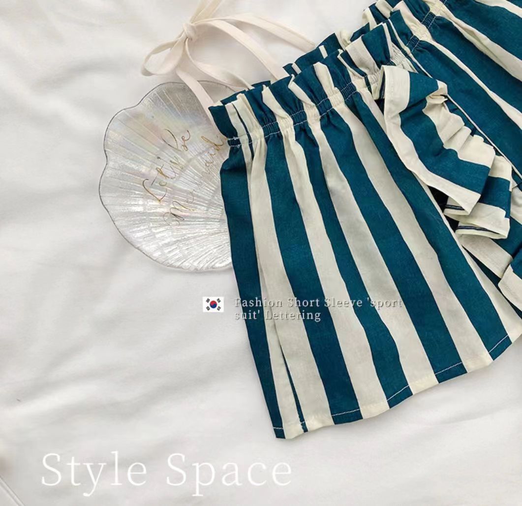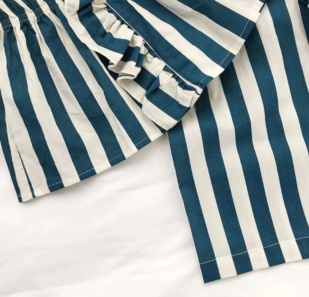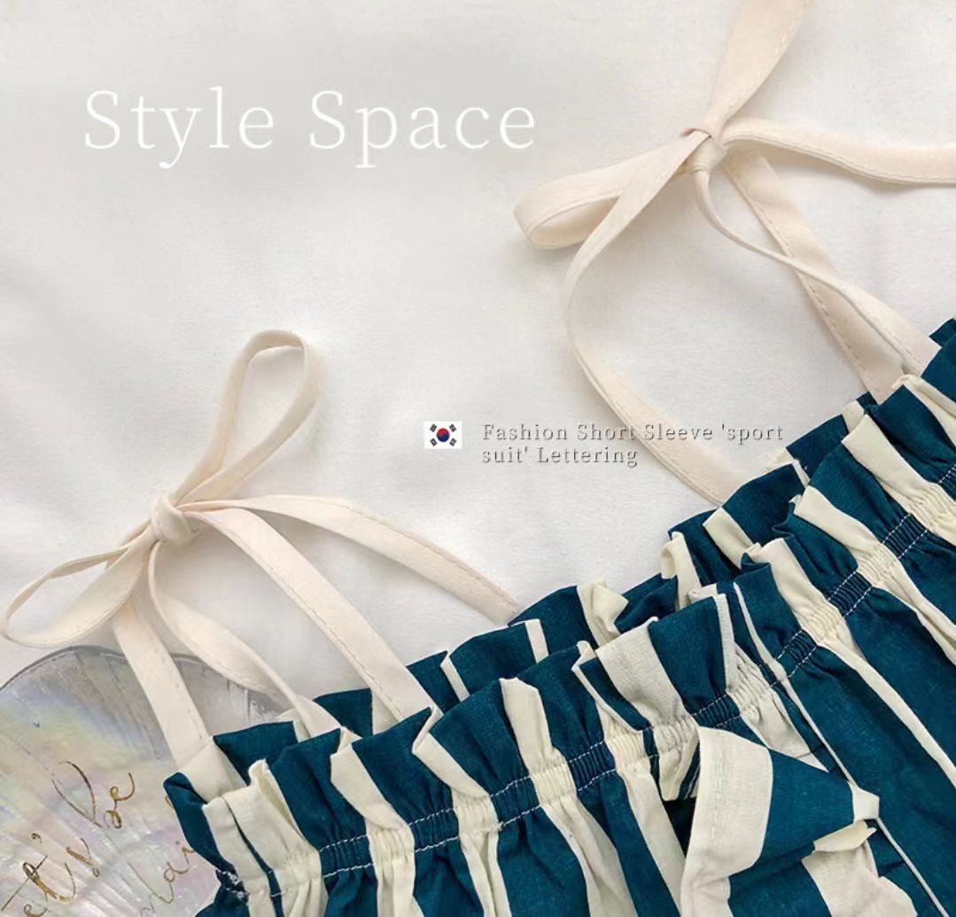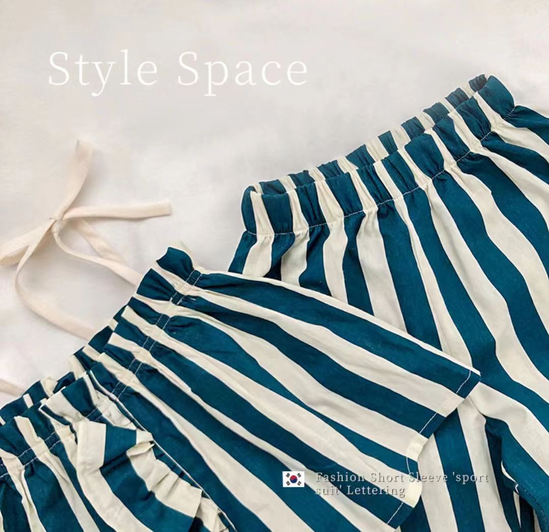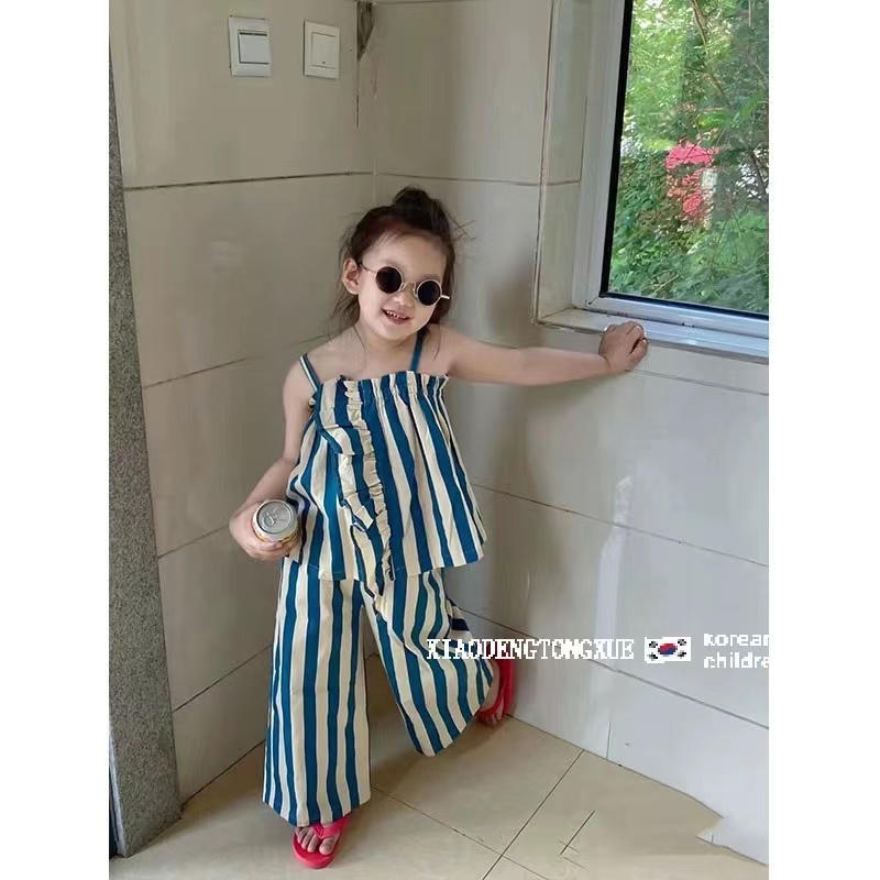 Костюм в полоску для девочек, лето 2023, детский корейский кружевной топ и хлопковые широкие брюки