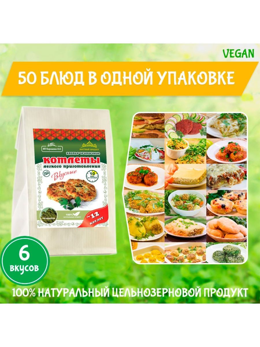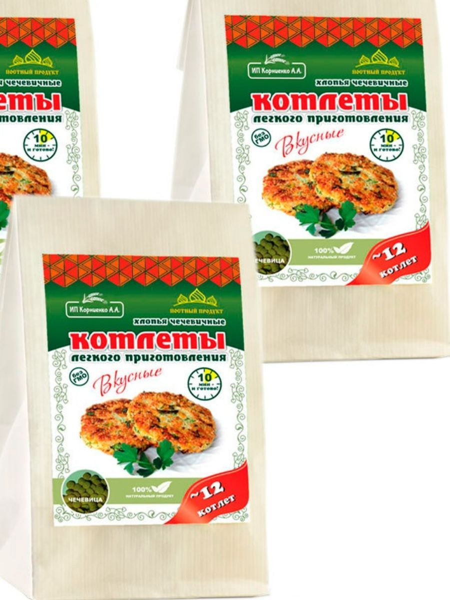 Описание: Котлеты лёгкого приготовления от ИП Корниенко — это поистине уникальный здоровый продукт. Сохранив всю пользу цельного зерна, мы сделали хлопья для котлет, которые легко приготовить в 3 этапа всего за 15 минут. Идеально подходит для постного и веганского меню. Котлеты в упаковке 500 г — отличный экономный вариант без специй и панировки. Вы можете приготовить в 3 раза больше котлет, заплатив при этом меньше. Экспериментируйте, готовя блюда с разными специями, овощами и зеленью. Постный, веганский 100% натуральный продукт. Без ГМО! Из наших любимых хлопьев для котлет можно с легкостью приготовить множество других вкусных блюд: тефтели, ёжики, запеканки, гратен, лазанья, пирожки, чебуреки, пельмени, фаршированные овощи и блины, пироги, пицца, паста, овощи и супы с фрикадельками, паштеты, и это всё — не полный список блюд.