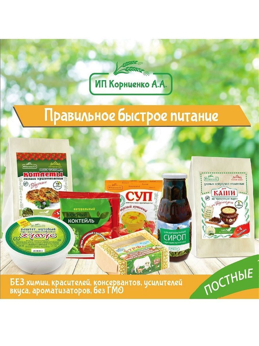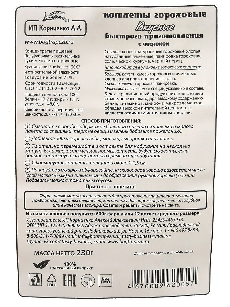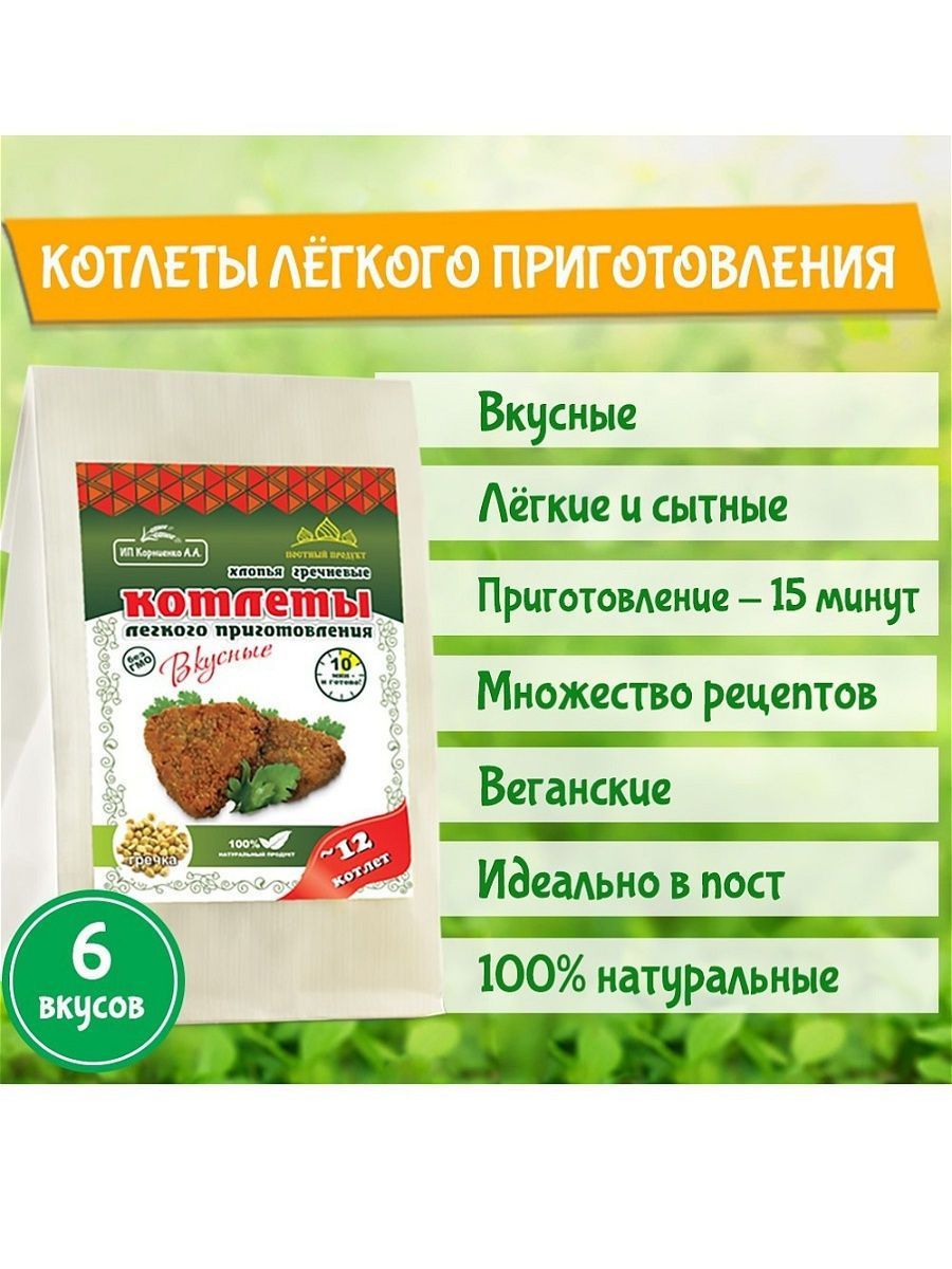 Описание: Котлеты лёгкого приготовления от ИП Корниенко — это поистине уникальный здоровый продукт. Сохранив всю пользу цельного зерна, мы сделали хлопья для котлет, которые легко приготовить в 3 этапа всего за 15 минут. Идеально подходит для постного и веганского меню. Котлеты в упаковке 500 г — отличный экономный вариант без специй и панировки. Вы можете приготовить в 3 раза больше котлет, заплатив при этом меньше. Экспериментируйте, готовя блюда с разными специями, овощами и зеленью. Постный, веганский 100% натуральный продукт. Без ГМО! Из наших любимых хлопьев для котлет можно с легкостью приготовить множество других вкусных блюд: тефтели, ёжики, запеканки, гратен, лазанья, пирожки, чебуреки, пельмени, фаршированные овощи и блины, пироги, пицца, паста, овощи и супы с фрикадельками, паштеты, и это всё — не полный список блюд.