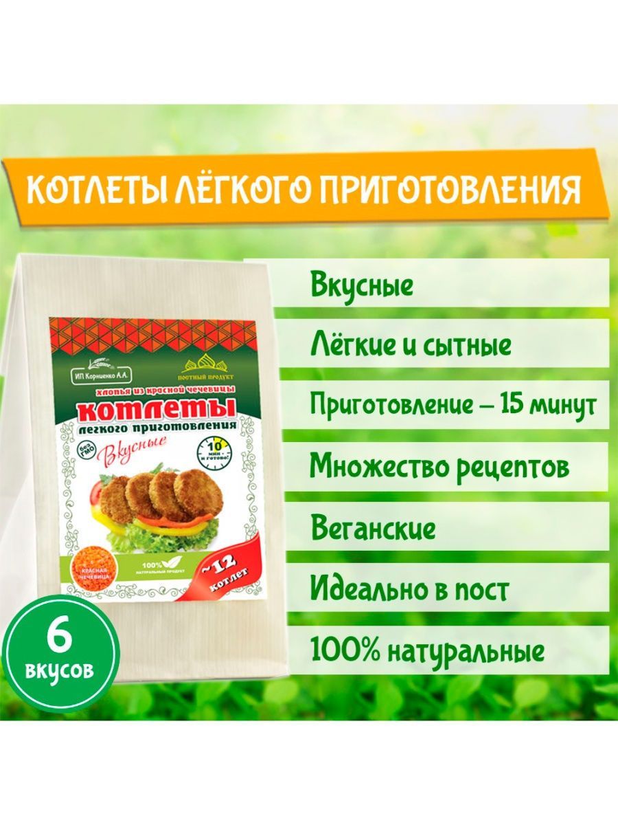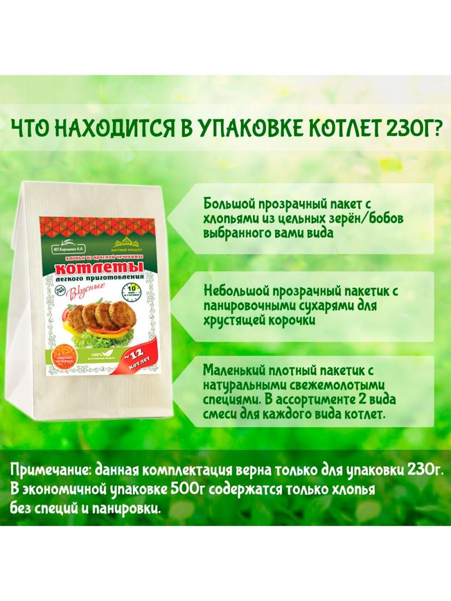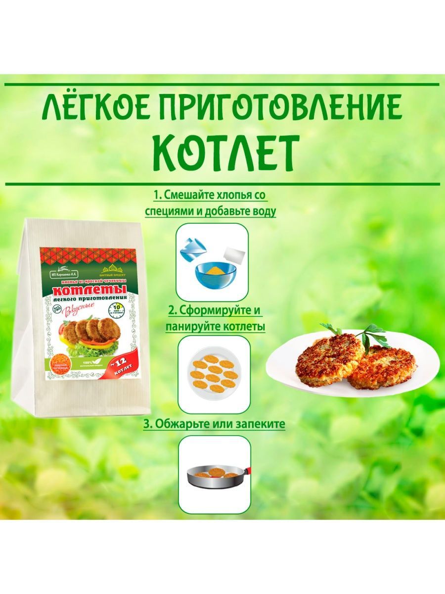 Описание: Котлеты лёгкого приготовления от ИП Корниенко — это поистине уникальный здоровый продукт. Сохранив всю пользу цельного зерна, мы сделали хлопья для котлет, которые легко приготовить в 3 этапа всего за 15 минут. Идеально подходит для постного и веганского меню. Котлеты в упаковке 500 г — отличный экономный вариант без специй и панировки. Вы можете приготовить в 3 раза больше котлет, заплатив при этом меньше. Экспериментируйте, готовя блюда с разными специями, овощами и зеленью. Постный, веганский 100% натуральный продукт. Без ГМО! Из наших любимых хлопьев для котлет можно с легкостью приготовить множество других вкусных блюд: тефтели, ёжики, запеканки, гратен, лазанья, пирожки, чебуреки, пельмени, фаршированные овощи и блины, пироги, пицца, паста, овощи и супы с фрикадельками, паштеты, и это всё — не полный список блюд.