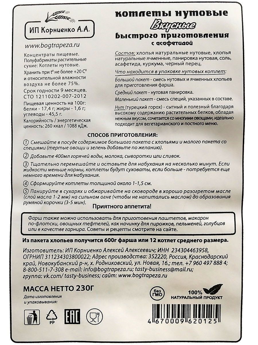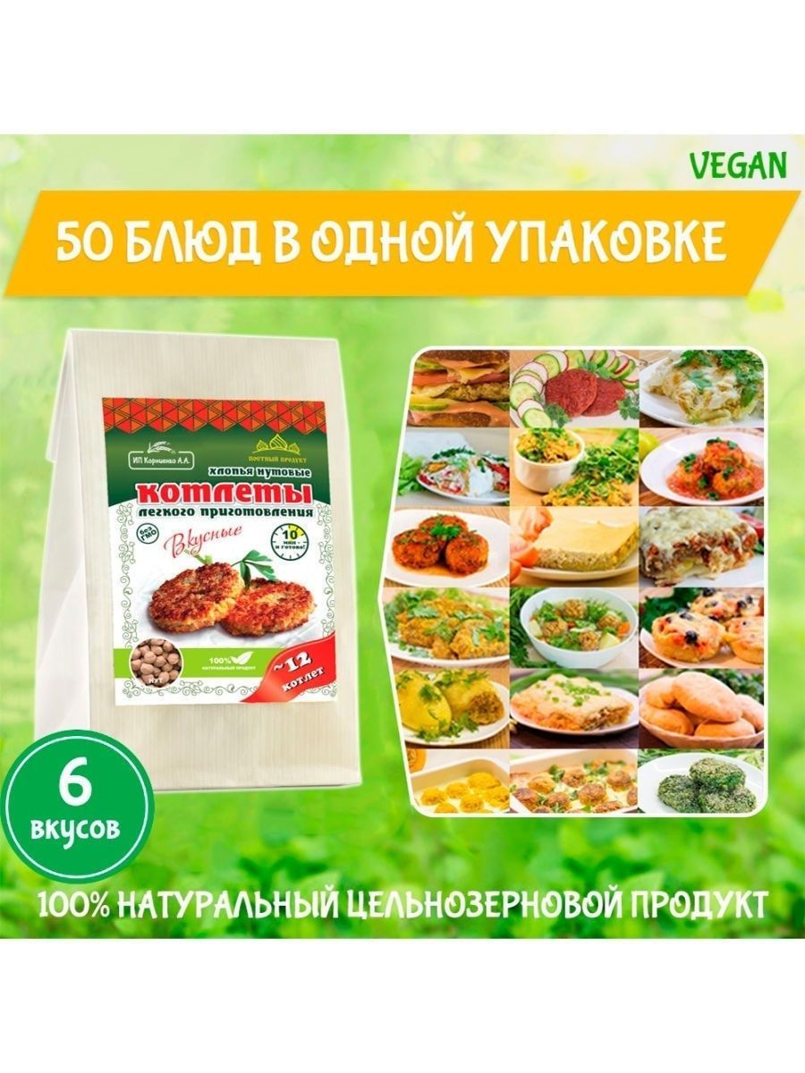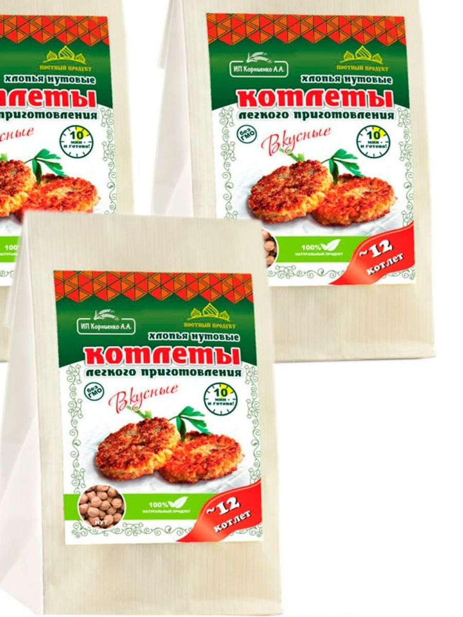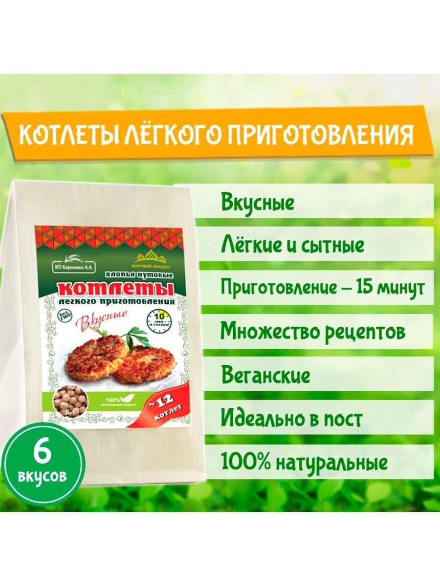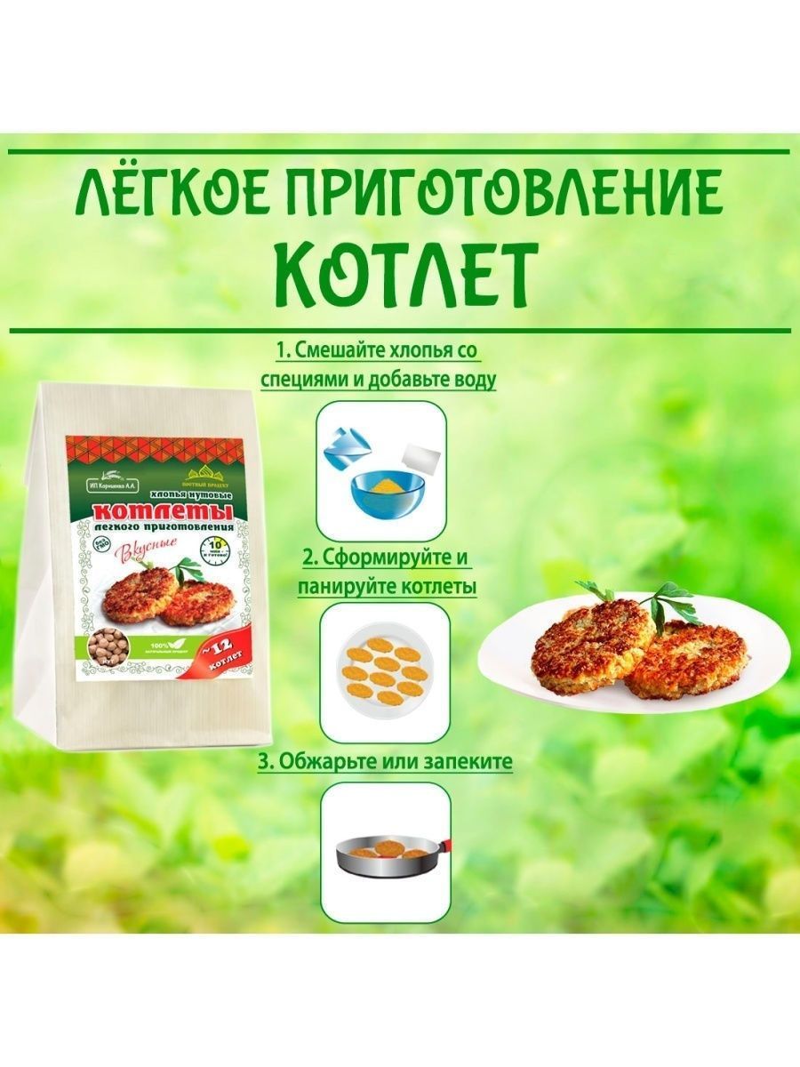 Описание: Котлеты лёгкого приготовления от ИП Корниенко — это поистине уникальный здоровый продукт. Сохранив всю пользу цельного зерна, мы сделали хлопья для котлет, которые легко приготовить в 3 этапа всего за 15 минут. Идеально подходит для постного и веганского меню. Котлеты в упаковке 500 г — отличный экономный вариант без специй и панировки. Вы можете приготовить в 3 раза больше котлет, заплатив при этом меньше. Экспериментируйте, готовя блюда с разными специями, овощами и зеленью. Постный, веганский 100% натуральный продукт. Без ГМО! Из наших любимых хлопьев для котлет можно с легкостью приготовить множество других вкусных блюд: тефтели, ёжики, запеканки, гратен, лазанья, пирожки, чебуреки, пельмени, фаршированные овощи и блины, пироги, пицца, паста, овощи и супы с фрикадельками, паштеты, и это всё — не полный список блюд.