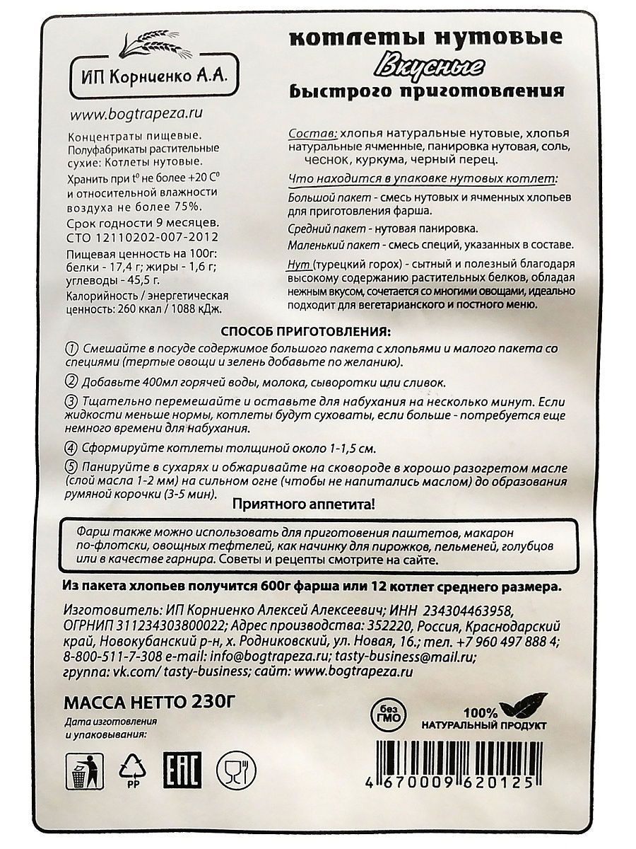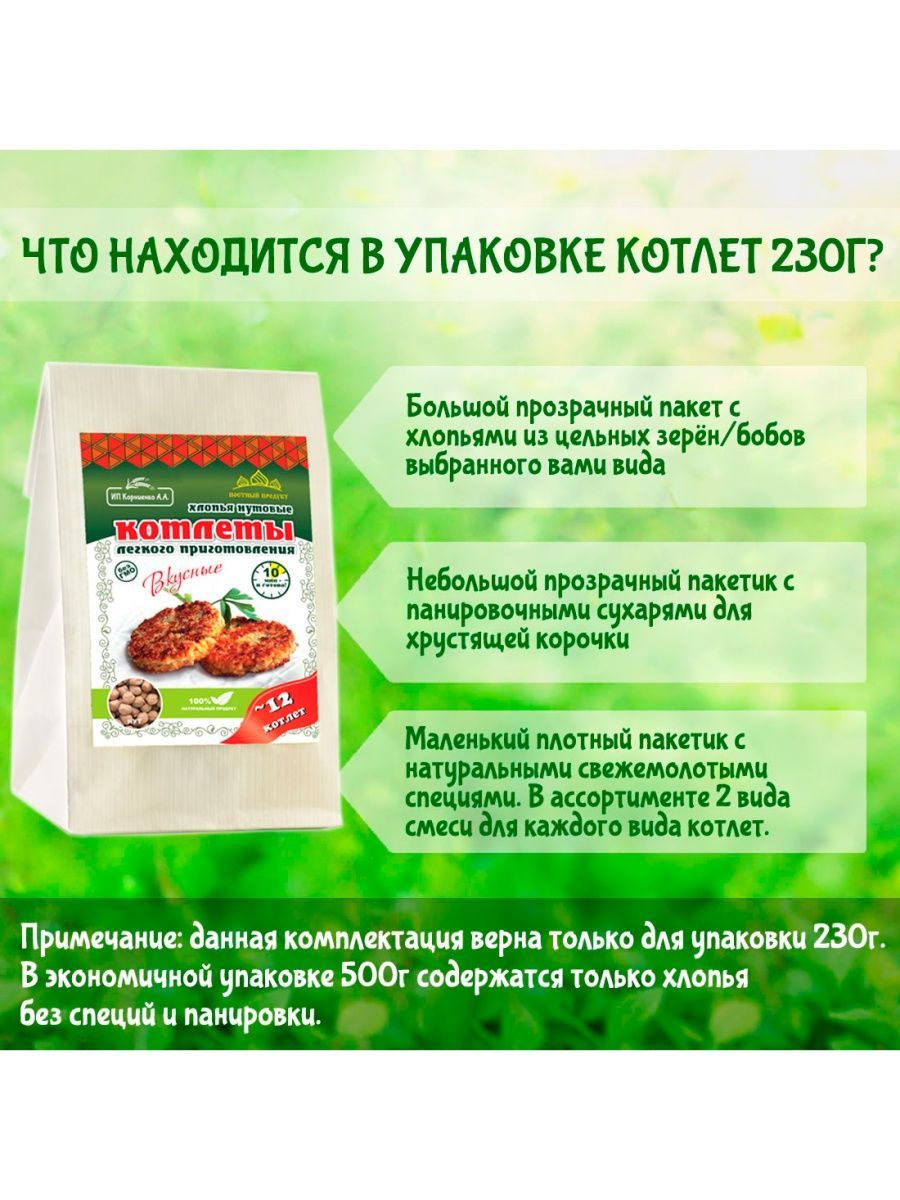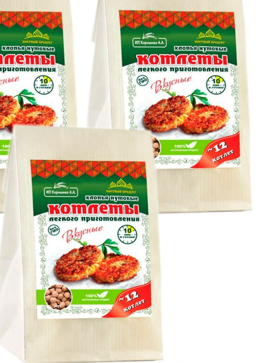Описание: Котлеты лёгкого приготовления от ИП Корниенко — это поистине уникальный здоровый продукт. Сохранив всю пользу цельного зерна, мы сделали хлопья для котлет, которые легко приготовить в 3 этапа всего за 15 минут. Идеально подходит для постного и веганского меню. Котлеты в упаковке 500 г — отличный экономный вариант без специй и панировки. Вы можете приготовить в 3 раза больше котлет, заплатив при этом меньше. Экспериментируйте, готовя блюда с разными специями, овощами и зеленью. Постный, веганский 100% натуральный продукт. Без ГМО! Из наших любимых хлопьев для котлет можно с легкостью приготовить множество других вкусных блюд: тефтели, ёжики, запеканки, гратен, лазанья, пирожки, чебуреки, пельмени, фаршированные овощи и блины, пироги, пицца, паста, овощи и супы с фрикадельками, паштеты, и это всё — не полный список блюд.