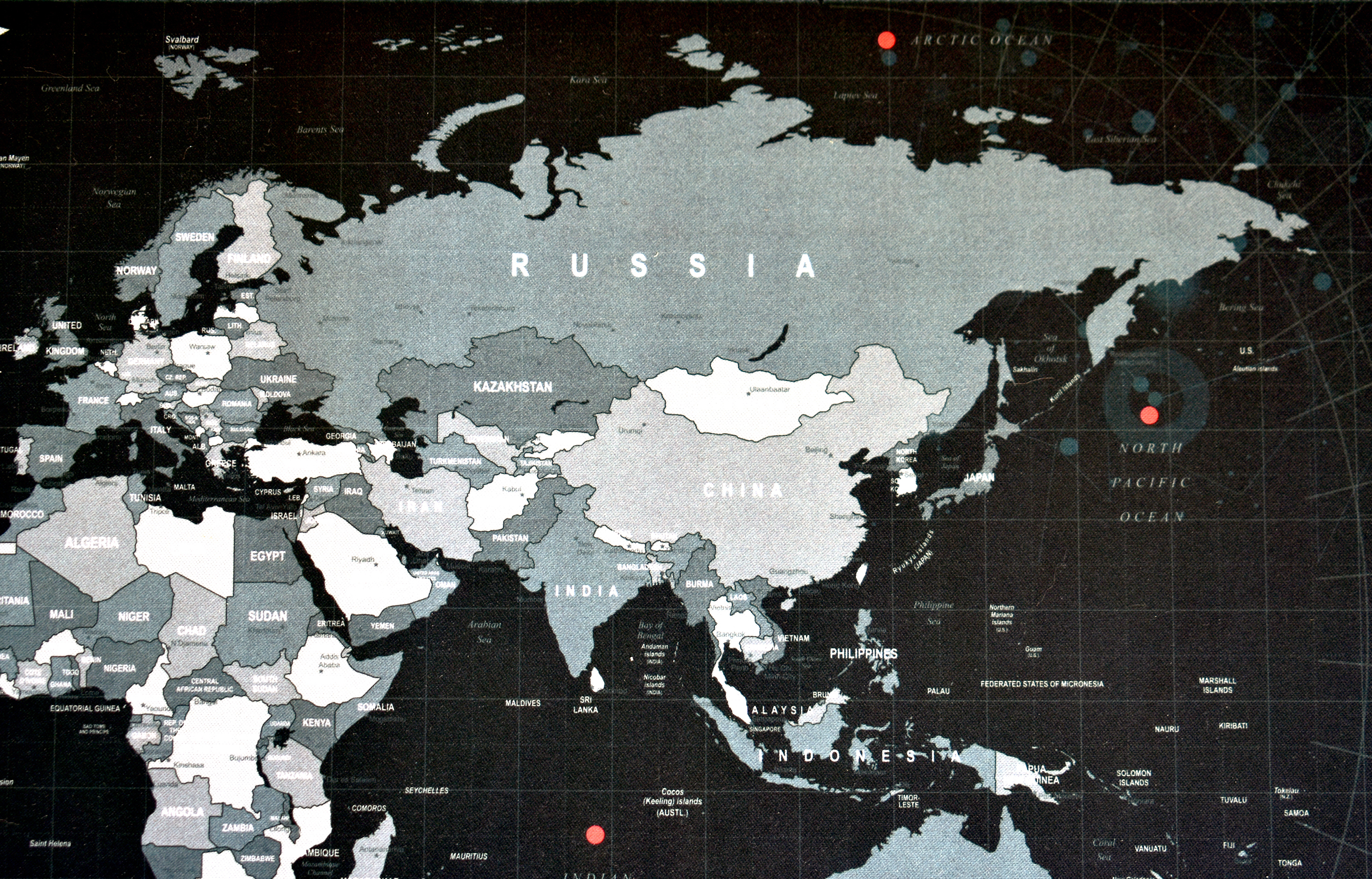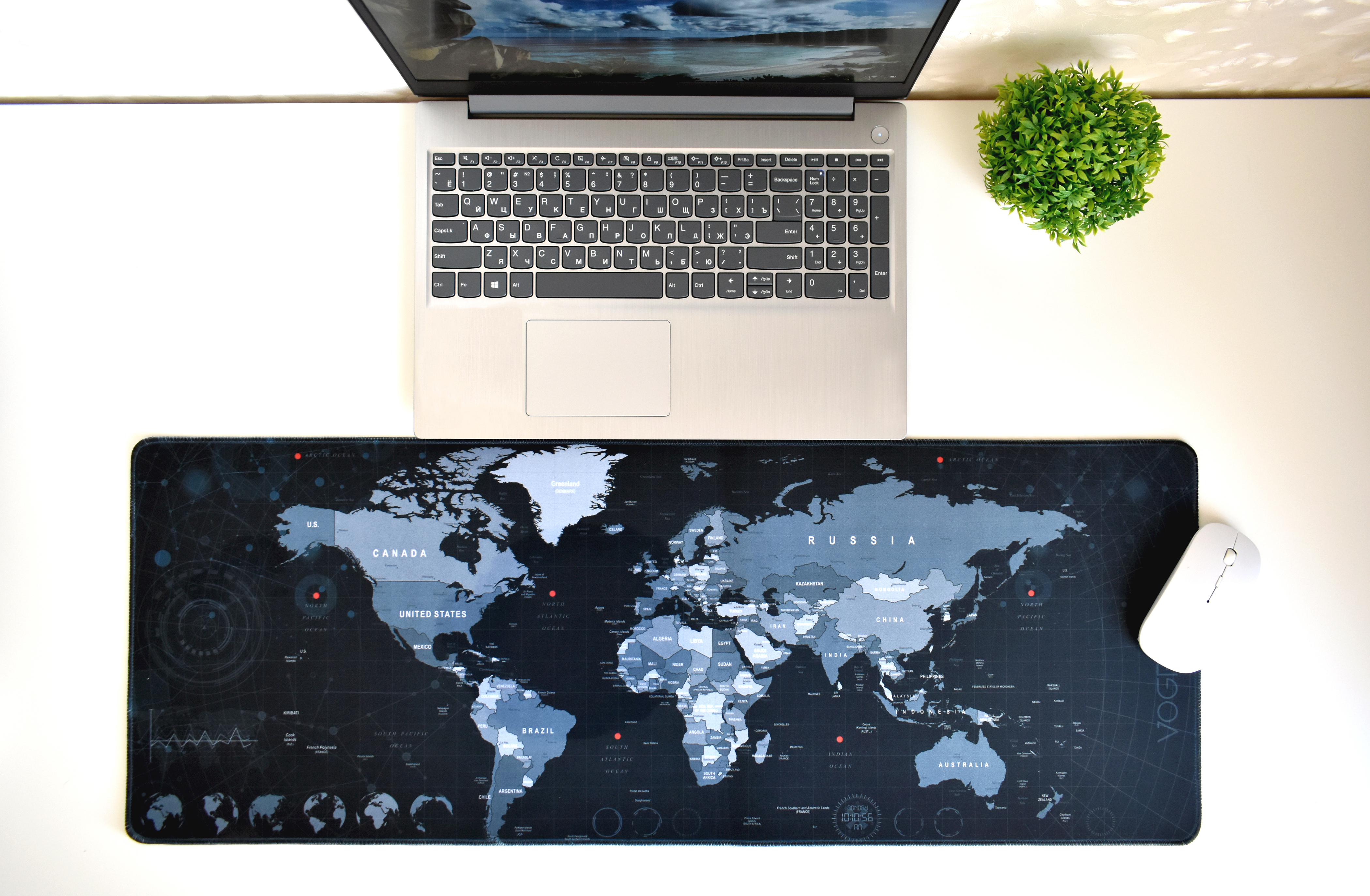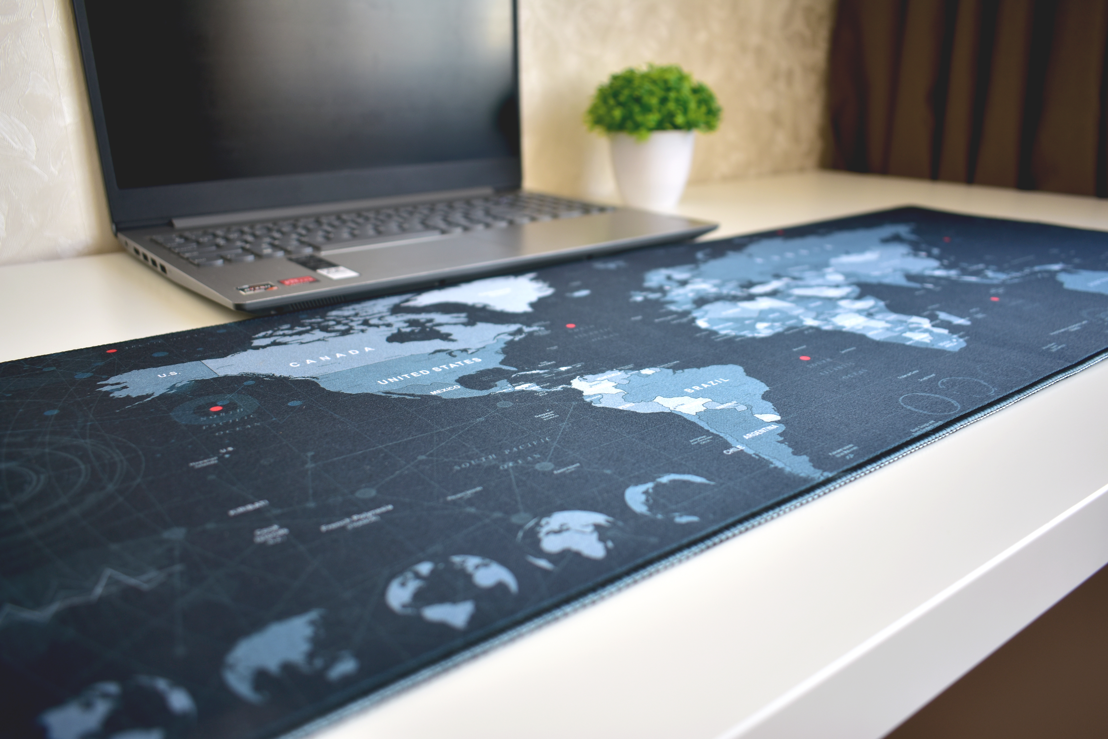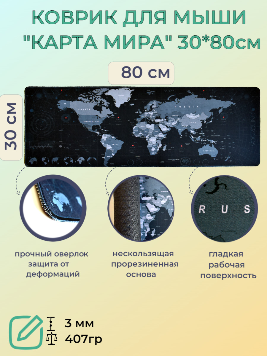 Коврик для мыши DKiSerg Игровой коврик для компьютерной мыши 800х300х3мм Карта мира Россия на прорезиненной основе, XL, черно-серый