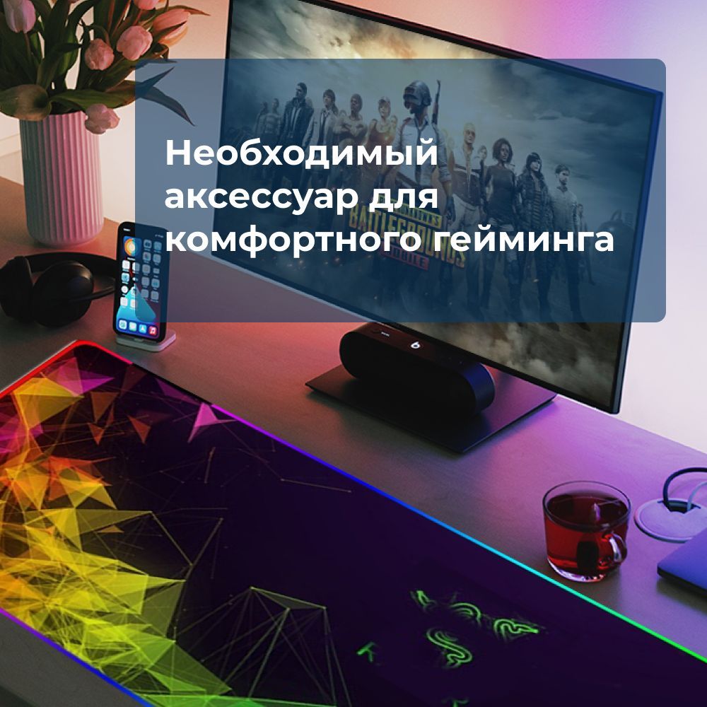 • Основное:Игровой коврик для мыши с RGB подсветкой - универсальный аксессуара для продолжительного гейминга. Тканевое покрытие прекрасно подходит оптической или лазерной мышек, обеспечивая изумительное скольжение и полный контроль. Промежуточная подложка из мягкой микрофибры обеспечивает комфортную толщину 4 мм и поддерживает форму аксессуара. Прорезиненную основа обеспечивает надежную фиксацию коврика даже на стеклянном столе.