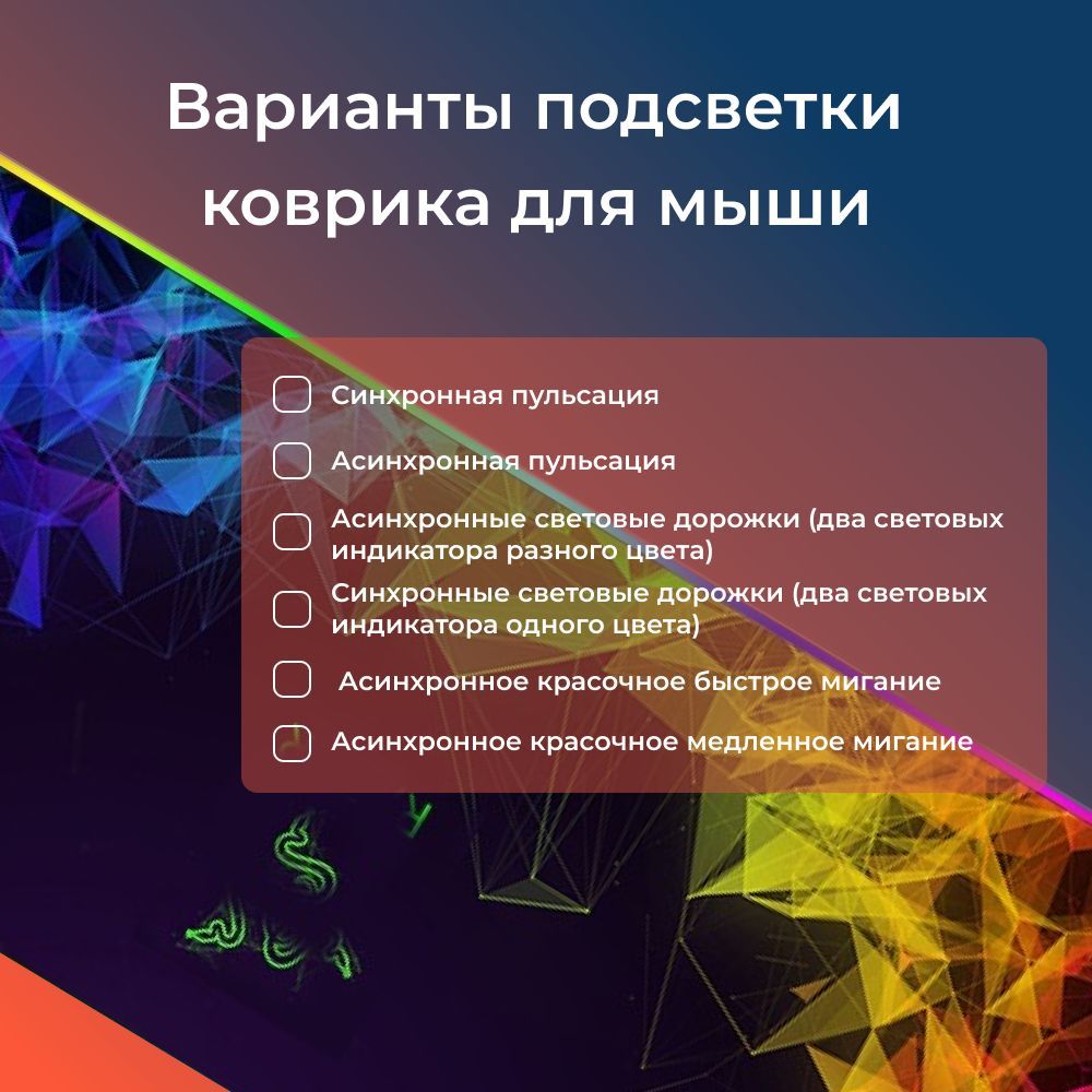 • Управление подсветкой:RGB подсветка по контуру коврика для мыши, 13 режимов / 7 цветов.
