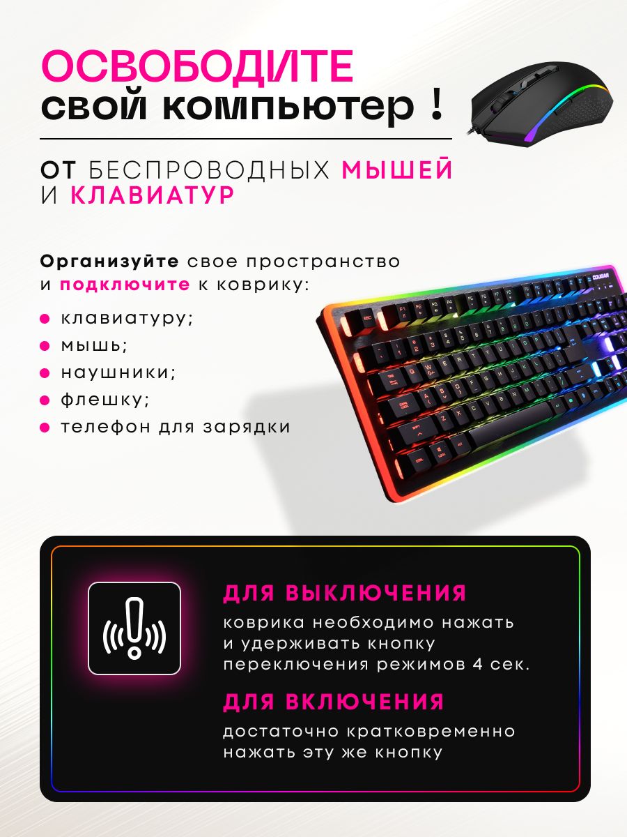 Особенности коврика: Водоотталкивающая поверхность, Держатель для кабеля, Нескользящая основа, Подсветка, Прошитые края