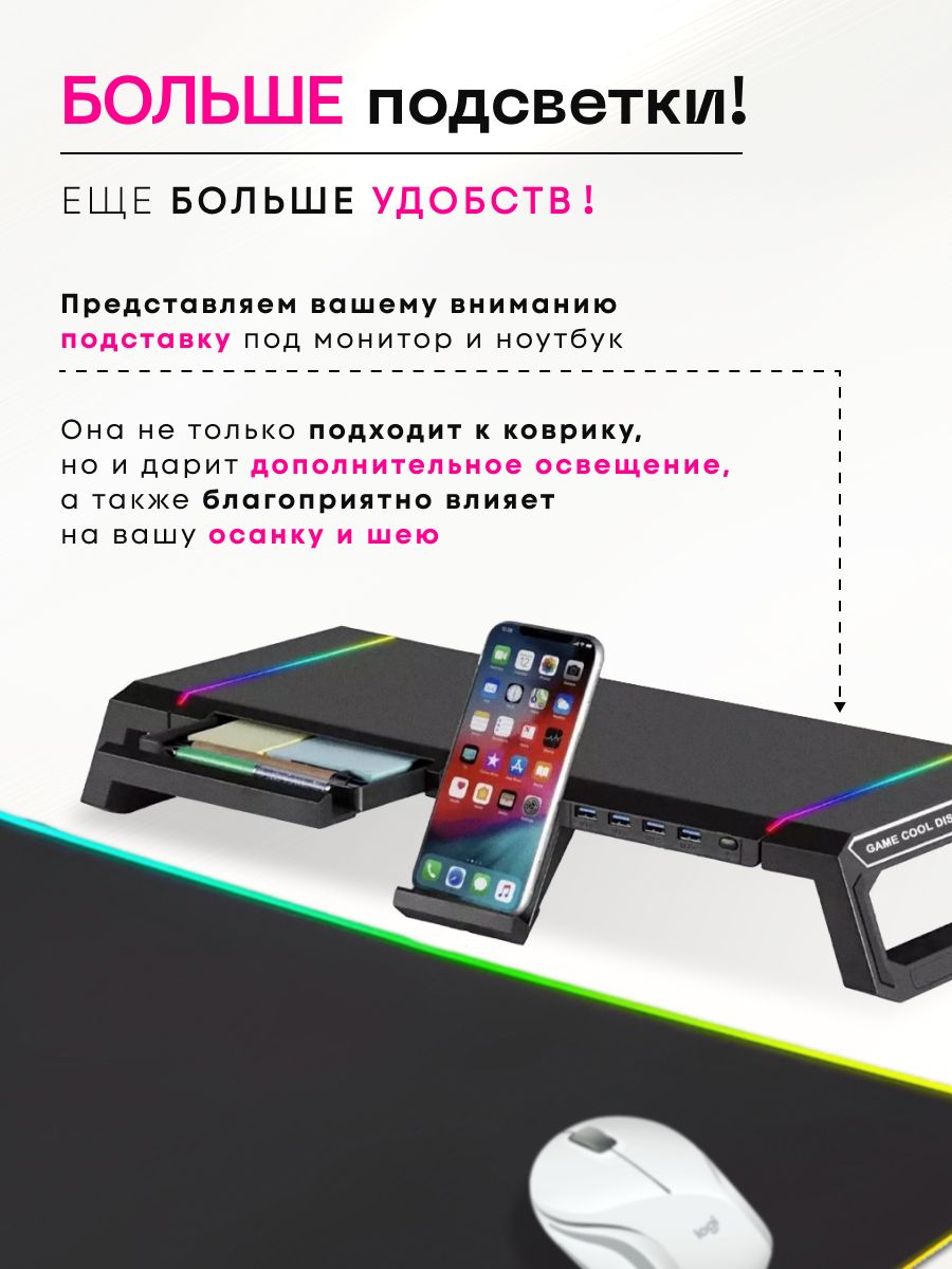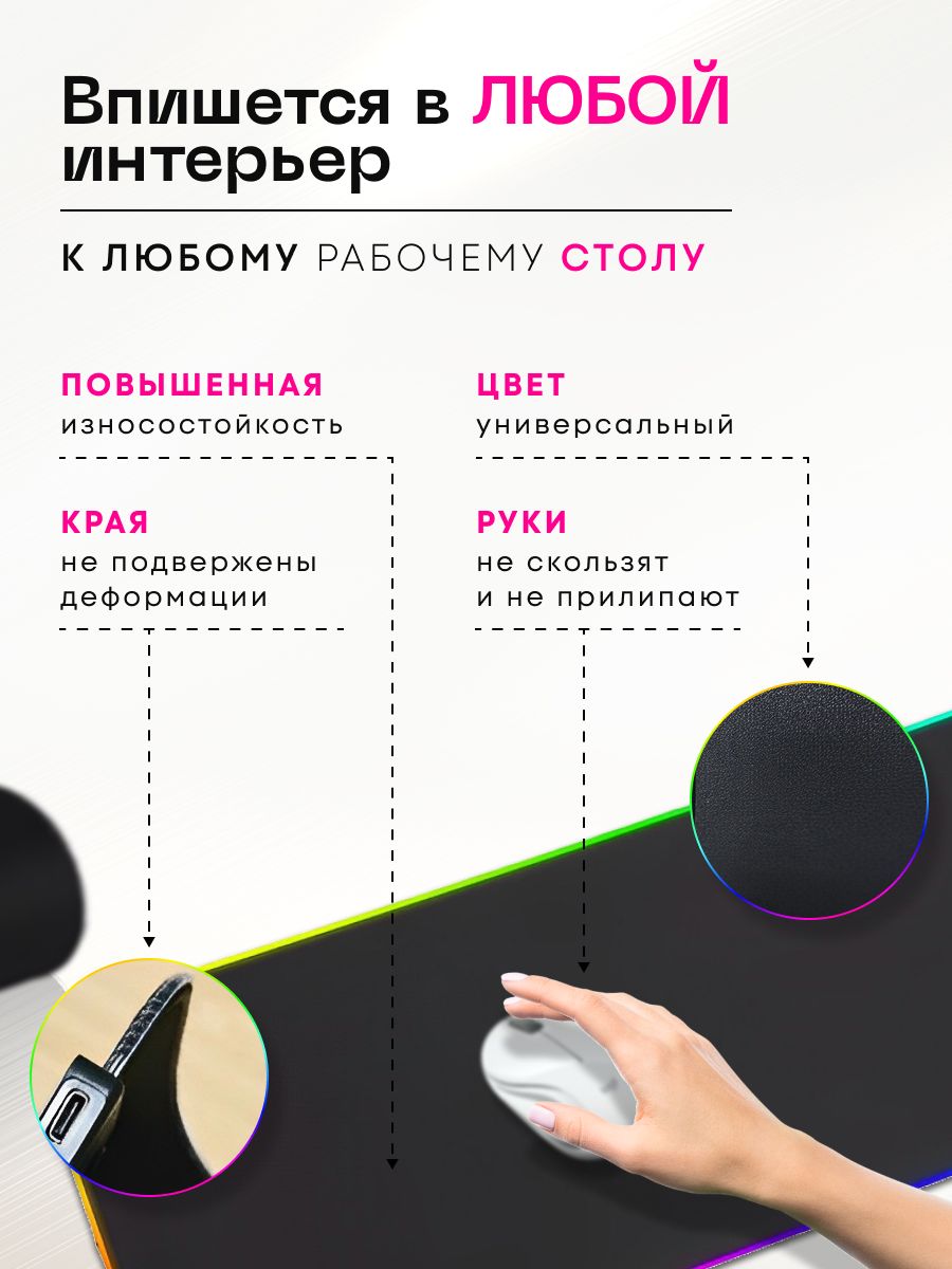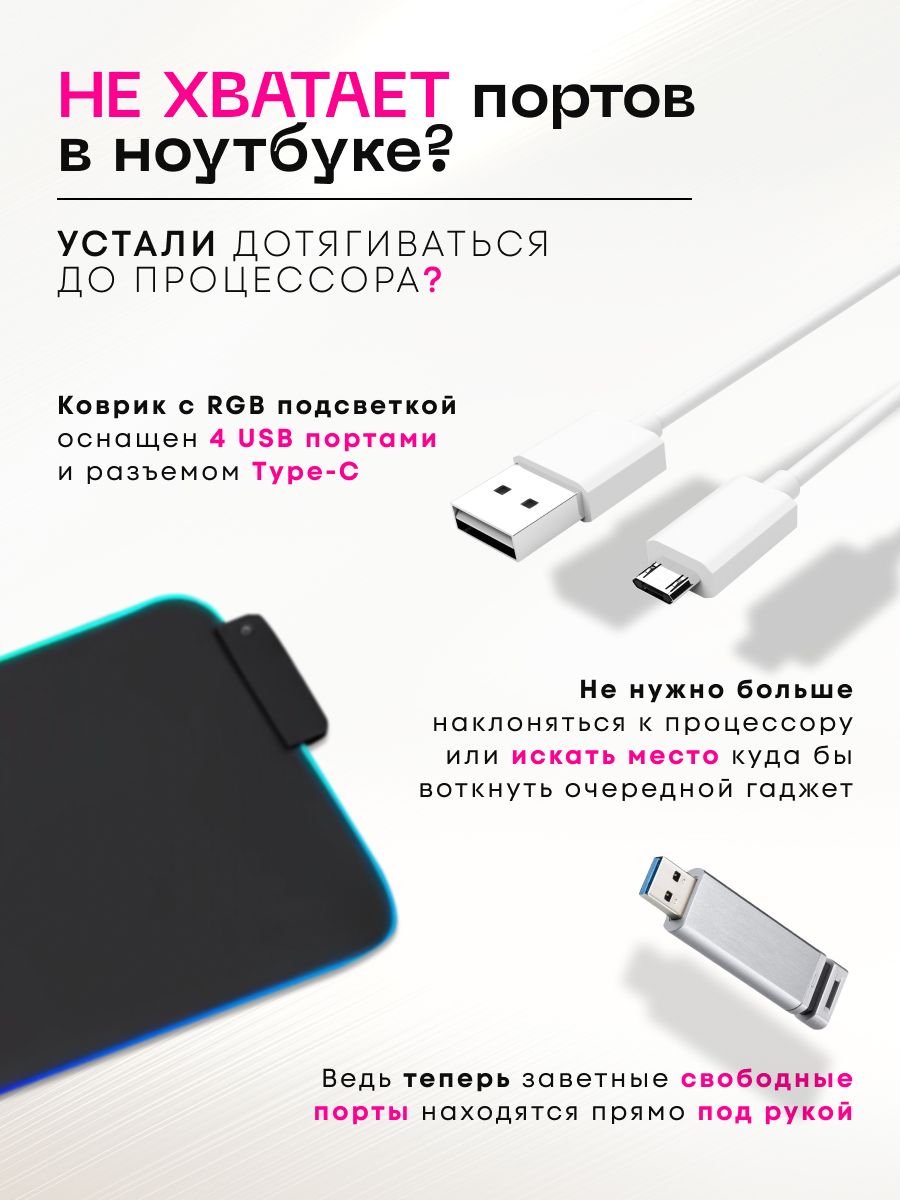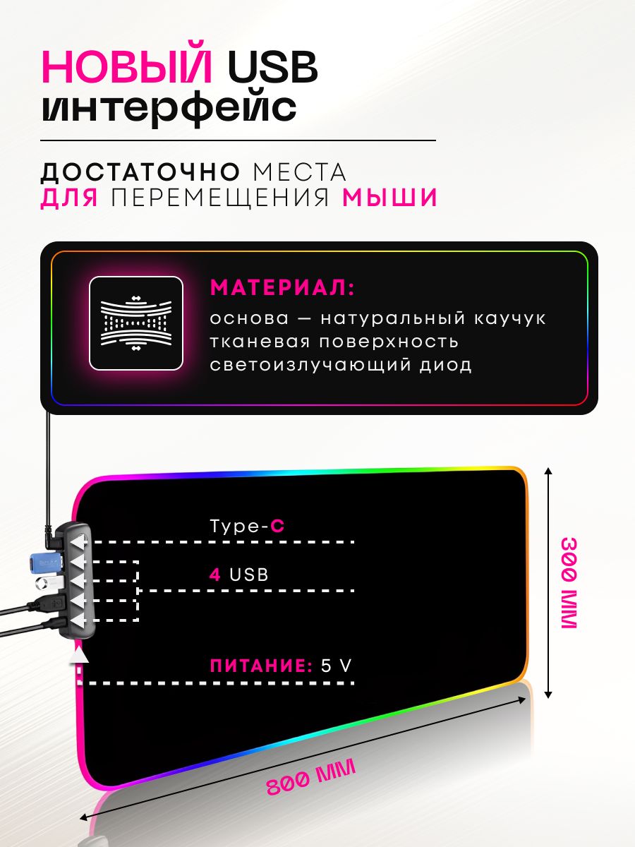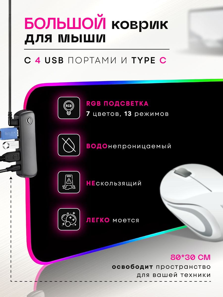Коврик имеет уникальный дизайн и станет отличным украшением вашего рабочего места и подчеркнет вашу принадлежность к игровому сообществу. Оснащен блоком переходником с 4 USB  разъемами, которые позволят подключить к Вашему компьютеру или ноутбуку большое количество переферийных устройств, не используя дополнительные гаджеты, в т.ч. беспроводную или проводную клавиатуру, мышь, наушники, флешку, телефон для зарядки. Не упустите возможность приобрести этот игровой коврик для мышки RGB с USB TYPE-C подключением по выгодной цене. Он станет надежным помощником в достижении ваших игровых целей и добавит комфорта в вашу игровую сессию. Закажите его прямо сейчас и погрузитесь в мир игр вместе с нами! Отличный новогодний подарок брату, сестре, парню, девушке, мужу, папе, жене, другу, внуку, детям, подростку, внучке, подруге, любимому человеку, маме, коллеге, деловому человеку на день рождения, Новый год, Рождество, новоселье, именины, 8 марта, 14 февраля, 23 февраля, свадьба, юбилей, годовщина, любой праздник, без повода, просто так, для тех, кого вы цените и любите, для тех, кто увлекается играми и является фанатом новых футуристических технологий.