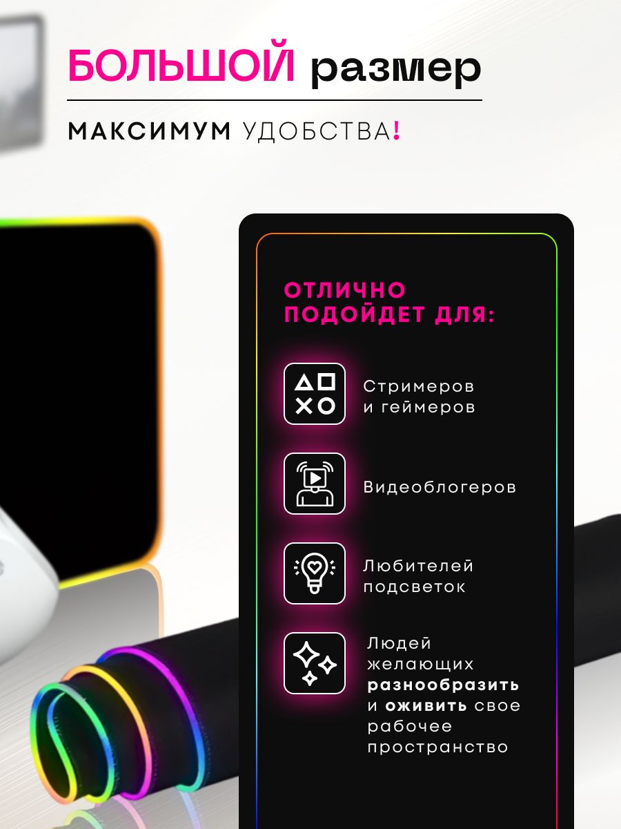 Наш игровой коврик имеет ряд преимуществ, которые делают его незаменимым аксессуаром для вашего компьютера. Во-первых, он большой и мягкий, что обеспечивает комфортное и плавное движение мышки. Вы забудете о неудобстве и затруднении при выполнении сложных игровых маневров. Коврик имеет резиновое противоскользящее покрытие, которое обеспечивает стабильность и надежность во время игры. Вы можете быть уверены, что коврик не сдвинется с места в самый ответственный момент. Особенностью этого коврика является подсветка RGB. Вы можете выбрать любой цвет подсветки, который соответствует вашему настроению или дополняет цветовую гамму вашего компьютера. Подсветка создает атмосферу игры и позволяет вам полностью погрузиться в игровой мир. Коврик изготовлен из прочного и долговечного материала - ПВХ. Он легко моется и не теряет своих свойств даже после многократной стирки. Коврик также устойчив к истиранию и сохраняет свою эстетичность на протяжении долгого времени. Повышенная износостойкость. Края, усиленные оплеткой, не подвержены деформации, делают коврик для мыши долговечным и качественным. Наш игровой коврик совместим с любыми компьютерами, ноутбуками и телефонами, что делает его универсальным аксессуаром для любого геймера. Вы можете использовать его как на рабочем столе, так и на столике для игр. Подходит для оптических и лазерных мышей с любой чувствительностью и любым типом сенсора.
