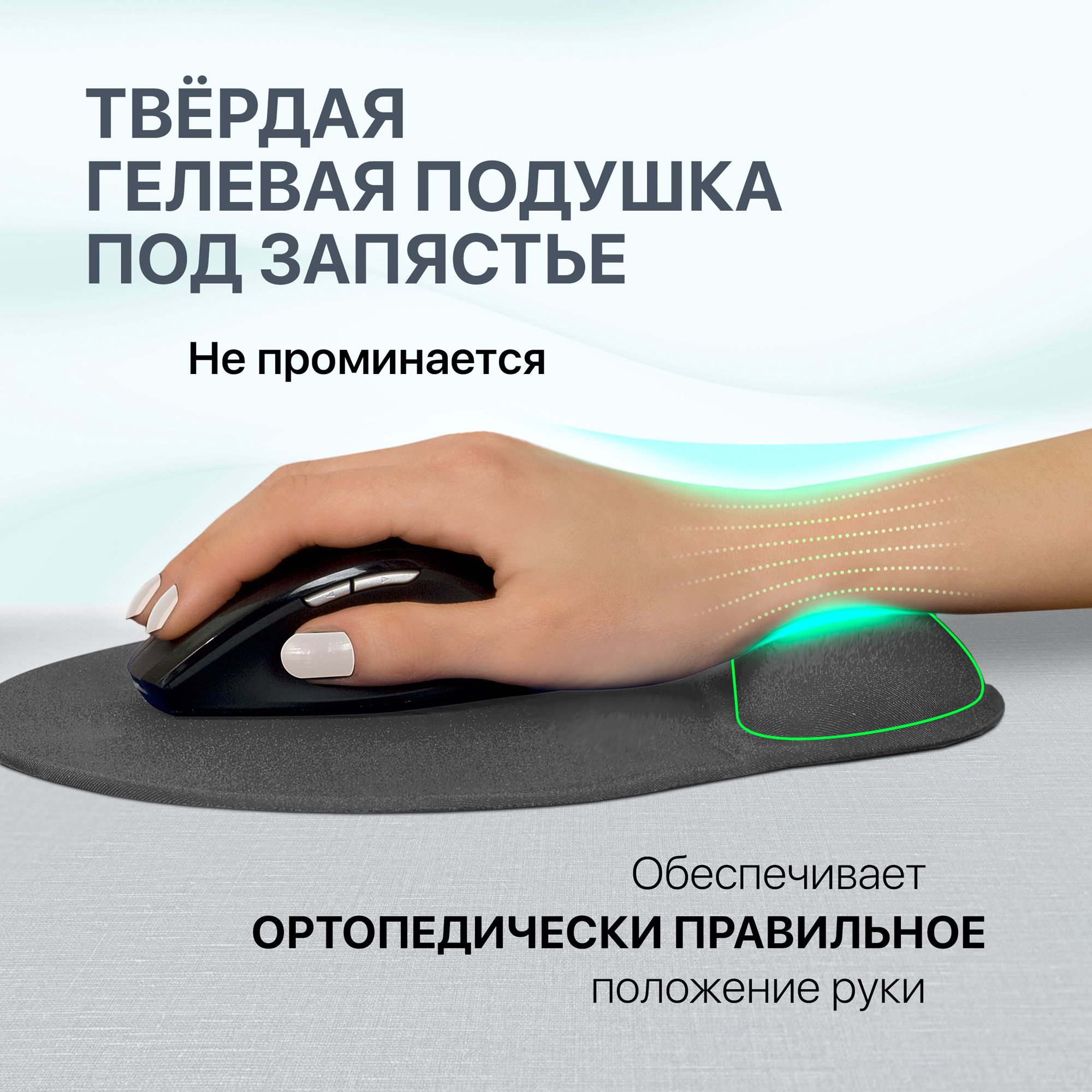 • Эргономичный дизайн со специальной гелевой подушкой под запястье снимает напряжение в руке и предотвращает развитие туннельного синдрома;