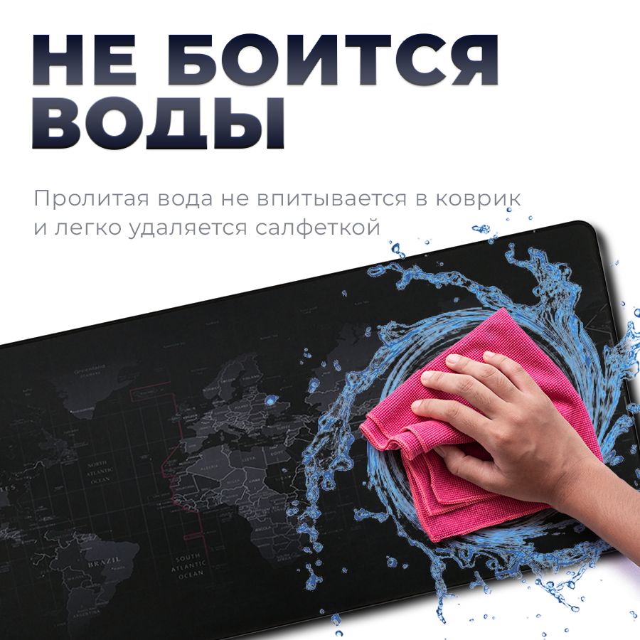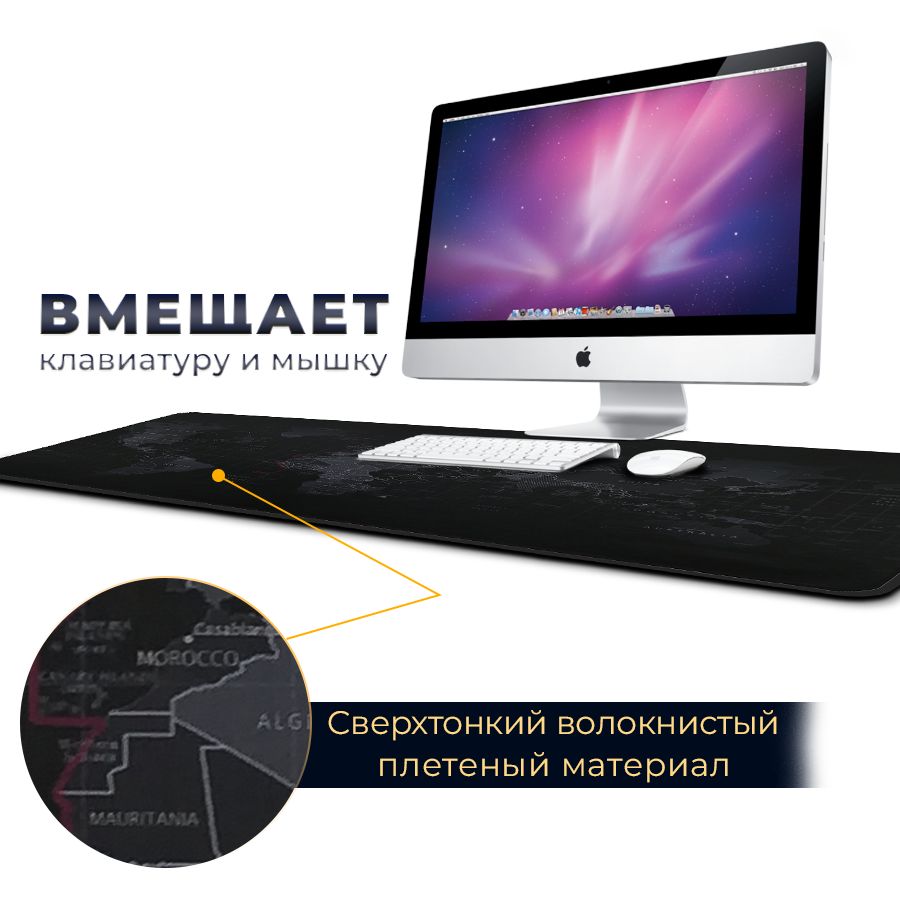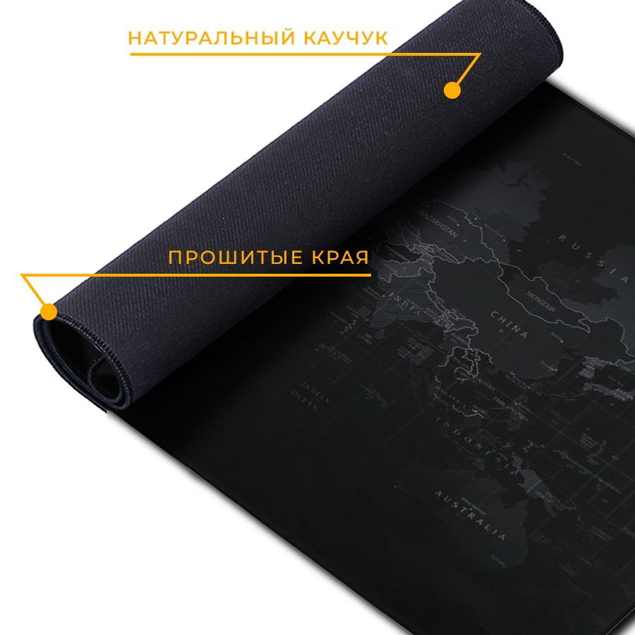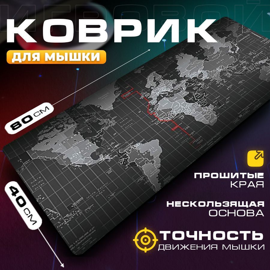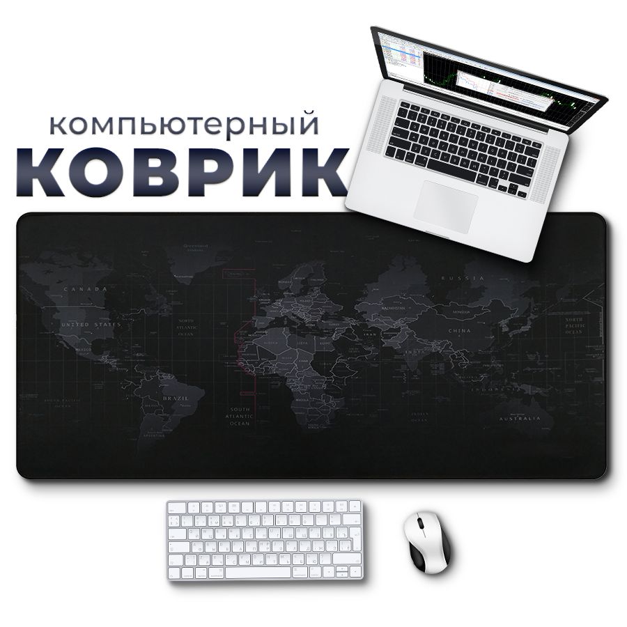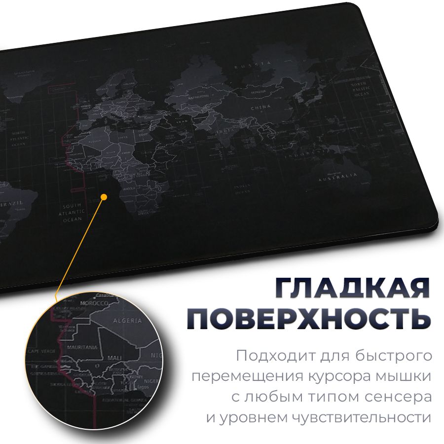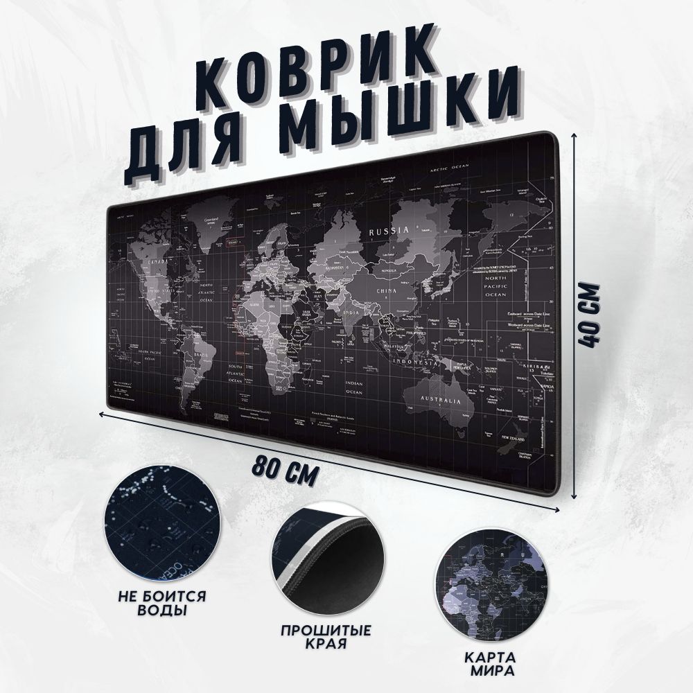 Коврик для мышки компьютерный большой игровой для ПК, карта мира, 80x40 см, Zerty черный
