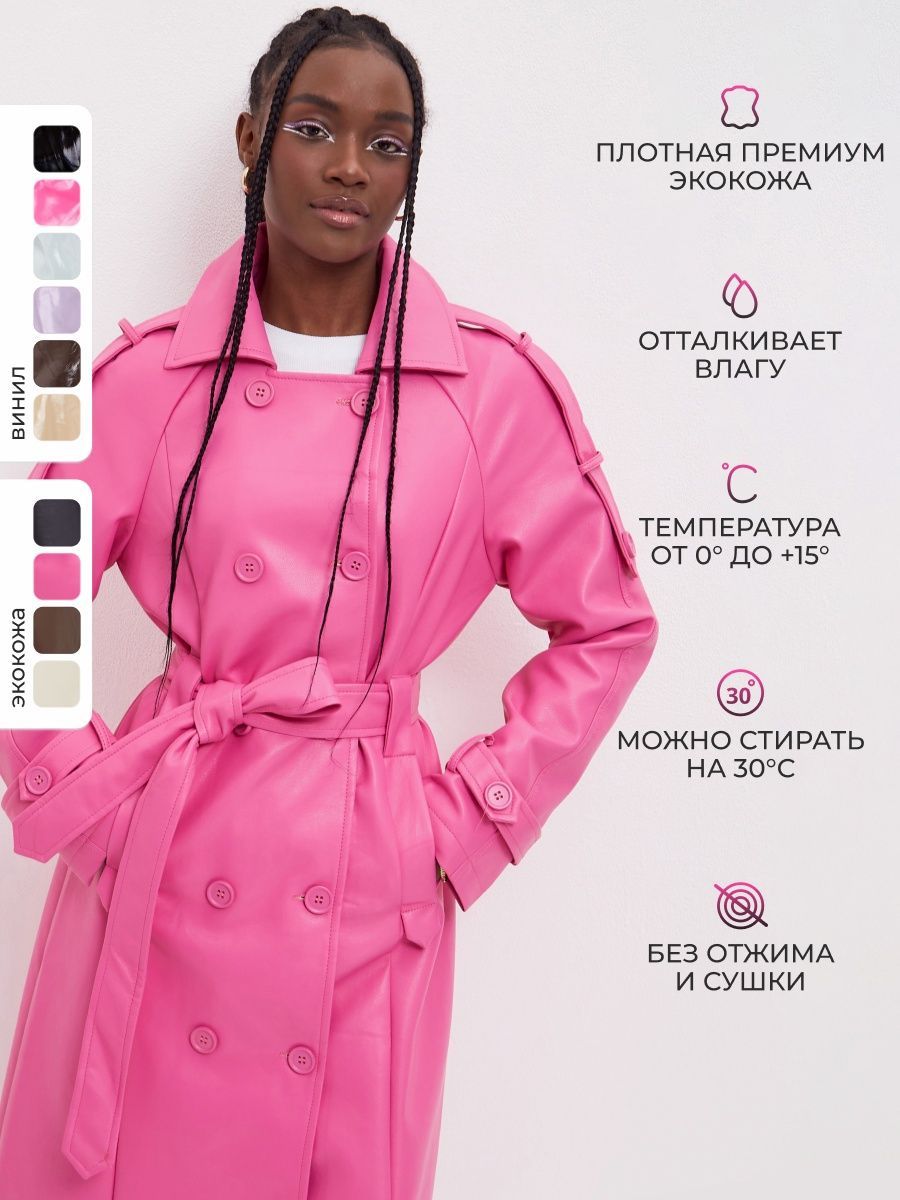 Описание: РЕКОМЕНДУЕМ отпарить плащ и дать ему отвисеться, так как при транспортировке он мнется. Как разгладить тренчкот: 1. Перед отпариванием тренч нужно повесить на плечики, застегнуть пуговицы, отвернуть воротник и манжеты, расправить внутренние карманы. 2. На расстоянии в 10–15 см «пройтись» по проблемным местам, нажимая кнопку выброса пара. 3. Дать плащу полностью остыть и высохнуть, желательно – с небольшим отягощением по низу изделия. 4. Также плащ можно постирать в стиральной машине на режиме деликатной стирки не более 30 градусов, без отжима и сушки. Тренч женский - основа базового гардероба современной девушки, а также кожаный плащ черный в стиле 90-е - тренд сезона. Пальто оверсайз поможет создать невероятный образ к 8 марта. Тренч подойдет на любой случай жизни. Ваша рука всегда потянется именно к плащу из всех вариантов одежды, потому что плащ женский выглядит актуально, стильно, при этом плащ женский осень защитит от дождя и ветра. А кожаный плащ сделает это еще лучше, потому что эко кожа не пропускает холод, поэтому можно считать, что плащ женский утепленный. Кожаный тренч также не покидает модных подиумов уже не одно десятилетие. А сейчас он особенно актуален, потому что 90-е одежда снова в моде. Тренчкот из экокожи универсален для всех. Плащ женский тренчкот длины миди сядет на девушку высокого, среднего и низкого роста. Демисезонный плащ, двубортный классический тренч на пуговицах. Женский плащ из искусственной кожи оснащен ремнем. Исполнен тренчкот в свободном крое тренч оверсайз, поэтому свободный плащ подойдёт на любую фигуру. Также его можно носить как плащ для беременных. Плащ утеплённый женский демисезонный выполнен с подкладом. Плащ кожанный без капюшона. Непромокаемая экокожа позволит использовать трэнч как плащ от дождя. Трендовая модель пальто также украшена акцентными деталями на плечах и карманах. Тренч кожаный прекрасно подойдет к любому вашему образу. Плащ кожаный можно надеть с платьями, юбками, джинсами, брюками. Кожаный плащ женский сочетается с любой обувью – и тяжелыми ботинками, и сапогами, и изящными туфлями. Плащ женский тренчкот уместно будет выглядеть по любому поводу. Тренчкот женский поможет вам составить стильные образы для социальных сетей, черный плащ органично дополнит ваши рабочие луки, тренчкот отлично подойдет для прогулки, плащ кожаный женский можно надеть в офис, университет и даже в театр или музей. Плащ кожзам - прекрасная, более модная альтернатива косухам. Также если вы являетесь фанатом фильма Матрица и образа Тринити, то плащ женский кожаный бренда Tiara dress - ваш лучший выбор. Плащ женский кожаный можно носить почти в любое время года. Плащь подойдет для весны, осени, холодного лета и теплой зимы – если вы наденете его с теплым свитером. Плащ женский длинный выгодно корректирует фигуру, делая вас визуально выше и стройнее. Кожаный плащ подойдет женщинам любого возраста. Женский плащ будет идеально смотреться как с контрастными образами, вечерними, так и с повседневными. Также вы всегда можете его использовать в стилизации 90-е одежда женская, сочетая с кожаными брюками. Плащ черный нужен любому гардеробу, но, если он у вас уже есть, вы всегда можете разнообразить луки кожаный тренчем других цветов - коричневый, розовый винил, черный винил. Тренчкоты и плащи женские всех этих цве