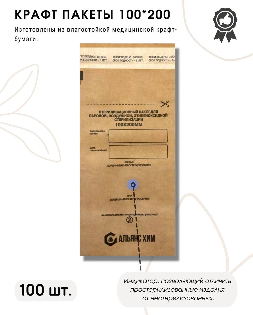 Крафт пакеты, бумажные, одноразовые для паровой, воздушной стерилизации инструментов маникюра. Большие пакетики АЛЬЯНС ХИМ коричневые 100x200, 100штук