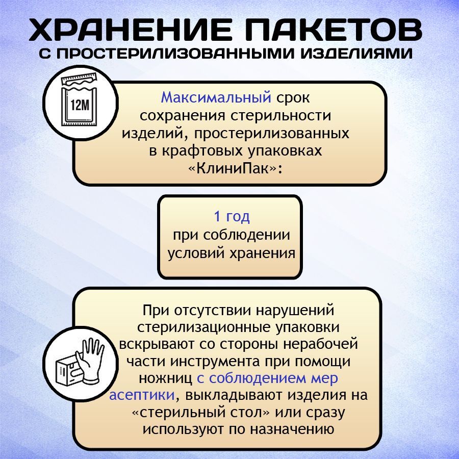 У пакетов КлиниПак ширина швов 7 мм, что оставляет больше полезного места для предметов внутри упаковки, а прозрачная пленка позволяет видеть содержимое без вскрытия. Храните запечатанный простерилизованный инструмент в темном сухом месте без скопления пыли при температуре от +10 до 30гр.С и влажности не более 50%.