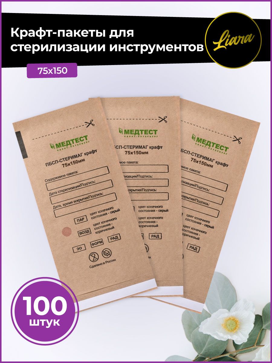 Крафт пакеты МедТест 75*150 мм для стерилизации инструментов, дезинфекции, хранения с клеевым клапаном бумажные Liara 100шт