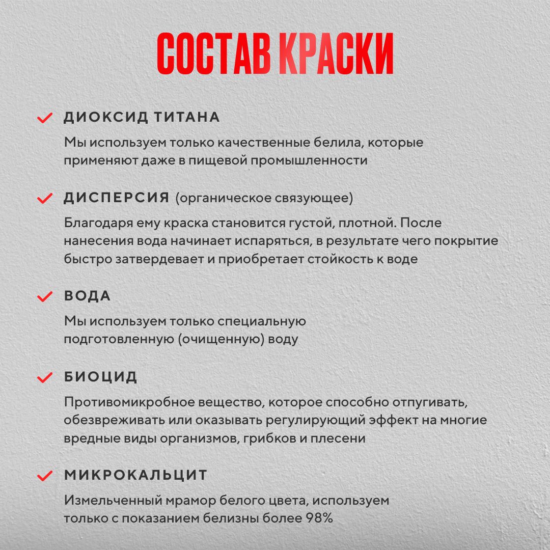 Текст при отключенной в браузере загрузке изображенийИспользуем только качественные белила (диоксид титана) применение которого используют даже в пищевой промышленностиТекст при отключенной в браузере загрузке изображенийТак как краска акриловая это значит, что в составе есть вода, по этому она безвредная и