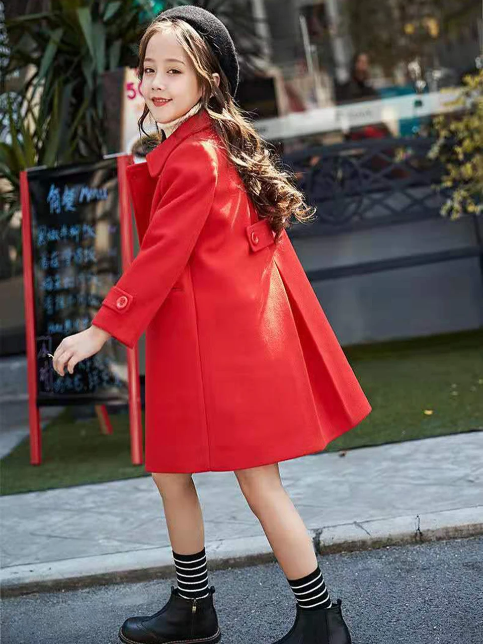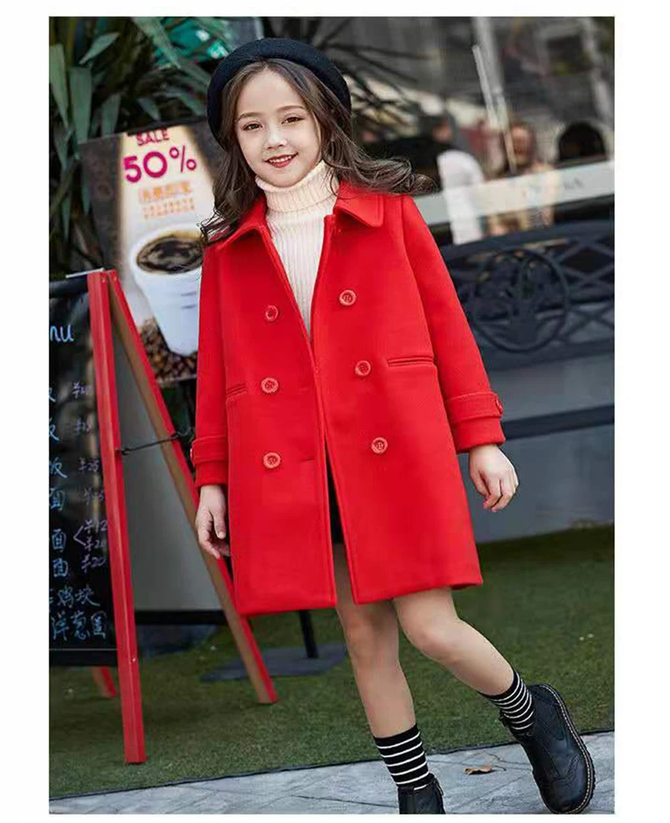 Красное шерстяное пальто для маленьких девочек, осенне-зимняя пуховая куртка 2023, детская одежда для девочек, Детское пальто с длинным рукавом, размер 120-160 см