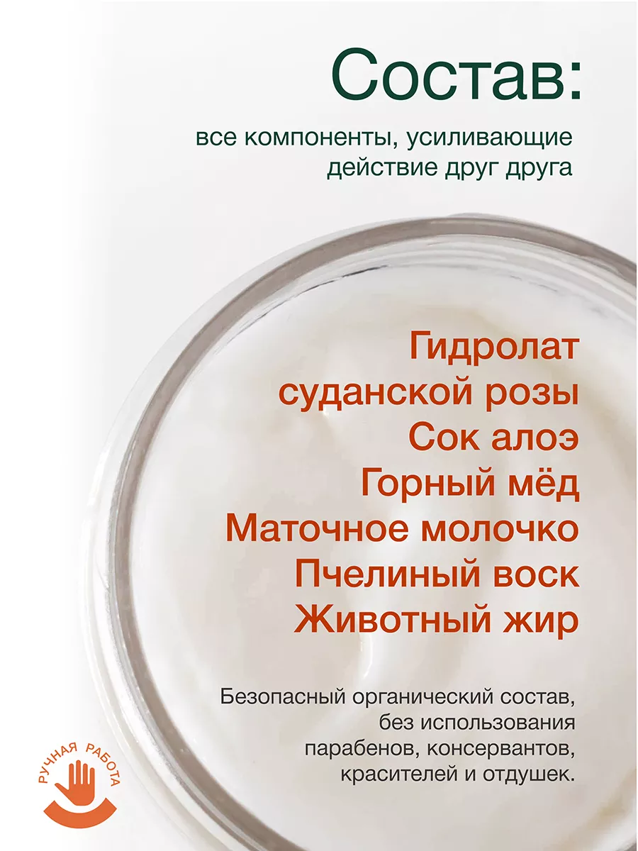 Артикул 62873225 Состав розы гидролат; алоэ; мед; маточное молочко; воск; животные жиры; кедровое масло