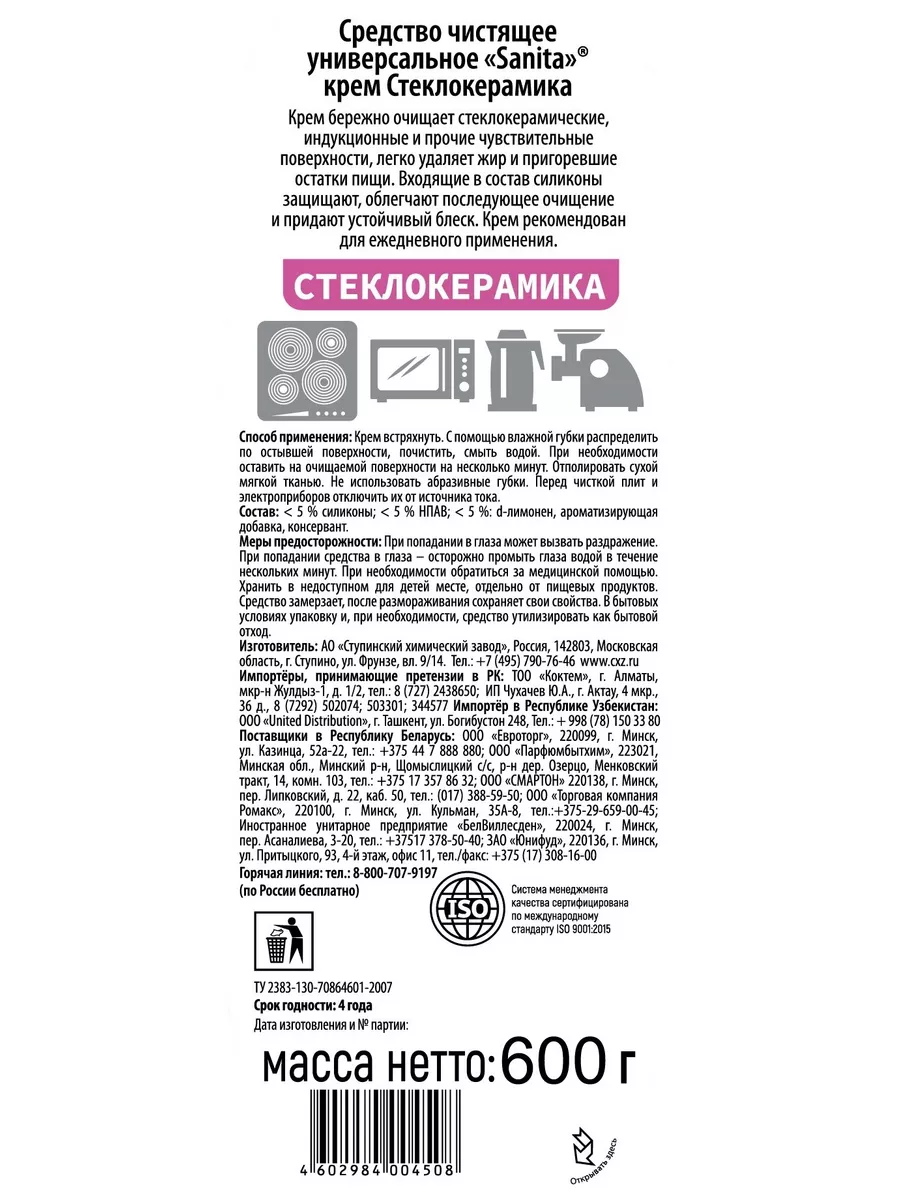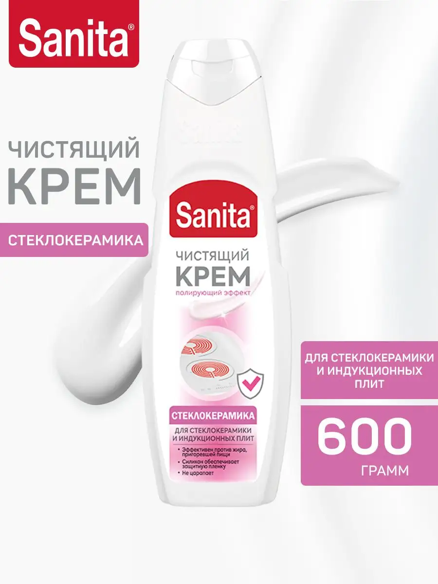 Описание: Крем для стеклокерамики Sanita полирующий эффект - это профессиональный помощник в борьбе с загрязнениями в вашем доме. Активная формула проникает в пригоревший жир, отделяет его от поверхности, превращаясь в мыльный раствор, который легко смывается водой. Чистящая жидкость идеально подходит для бережной очистки деликатных стеклокерамических и индукционных поверхностей не оставляя разводов после высыхания. Он эффективно удаляет пятна и загрязнения на поверхности грилей, мангалов, барбекю. Благодаря специальной составу, содержащемуся в креме, очиститель Санита проникает глубоко в поры материалов, освежает и восстанавливает их первоначальный вид. Бытовая химия также прекрасно справляется с очисткой кухонных столешниц, духовых шкафов, плит, фритюрниц, вытяжек, сковородок, противней, кастрюлей. Он удаляет жир, налет и пятна, обеспечивая безупречную чистоту и придает приятный свежий аромат, нейтрализуя неприятные запахи. Густая консистенция этого хозяйственного товара позволяет экономно расходовать продукт. Достаточно просто встряхнуть крем, нанести его влажной губкой и смыть водой. После этого отполировать поверхность сухой мягкой тканью. Уважаемые покупатели, у данного товара произошло изменение дизайна. Средство в новом или старом дизайне будет приходить к вам в зависимости от остатков на складе.