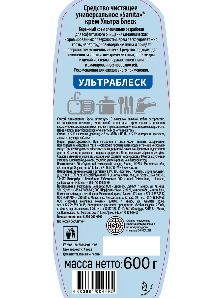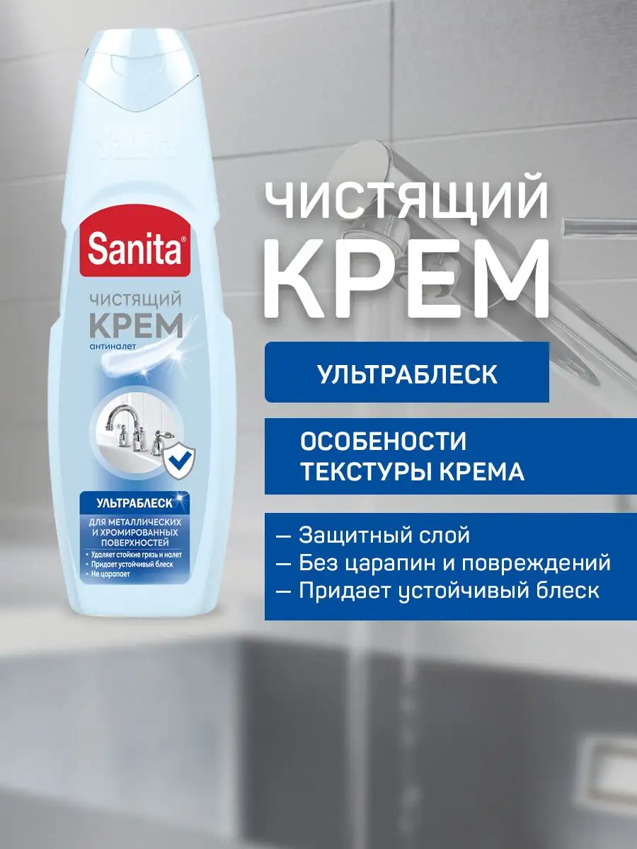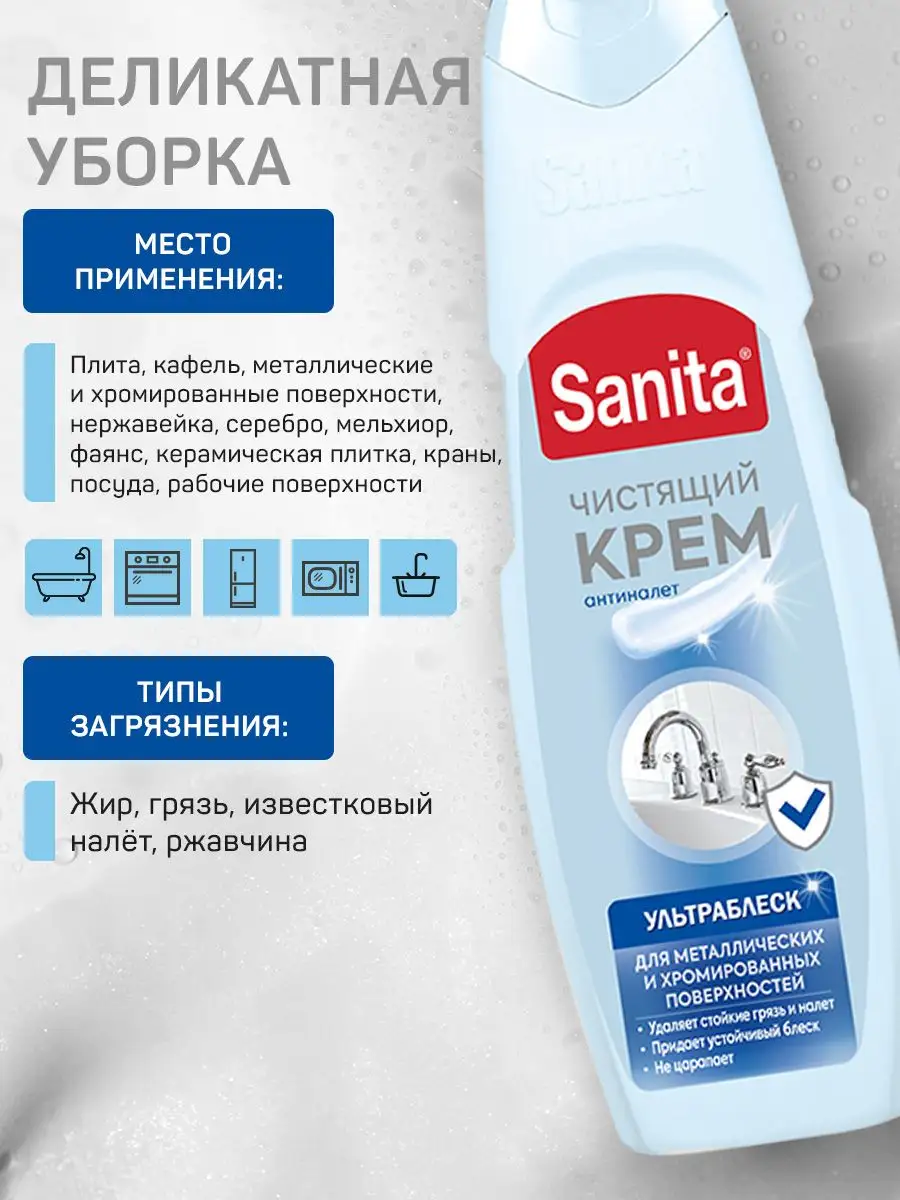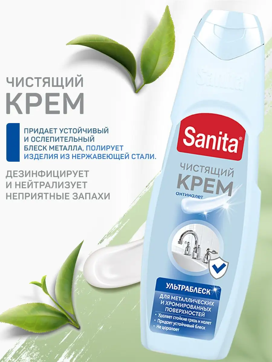 Описание: Крем Sanita Ультраблеск - это универсальное средство, которое превосходно справляется с уборкой в вашем доме. Будь то кухня, ванна или рабочие поверхности, он обеспечивает эффективное удаление загрязнений. Продукт специально разработан для металлических и хромированных поверхностей и отлично подходит для керамики, кафеля, в том числе фаянса, эмалированных поверхностей, придает устойчивый блеск и полирует посуду из нержавеющей стали, плиты и раковины, краны. Данный продукт удаляет жир, налет, нагар и пятна, не оставляя разводов. Благодаря своей консистенции в виде крема, он обеспечивает простоту нанесения и равномерное распределение, что позволяет легко и быстро очищать. Не требуя больших усилий, моющая жидкость мягко удаляет даже самые стойкие загрязнения, сохраняя чистоту и идеальный вид, устраняя неприятные запахи. Бытовая химия Санита - это чистящие хозяйственные товары, которые позволят вам с легкостью поддерживать чистоту и свежесть вашего дома. Уважаемые покупатели, у данного товара произошло изменение дизайна, будет приходить к вам в новом или старом дизайне в зависимости от остатков на складе.