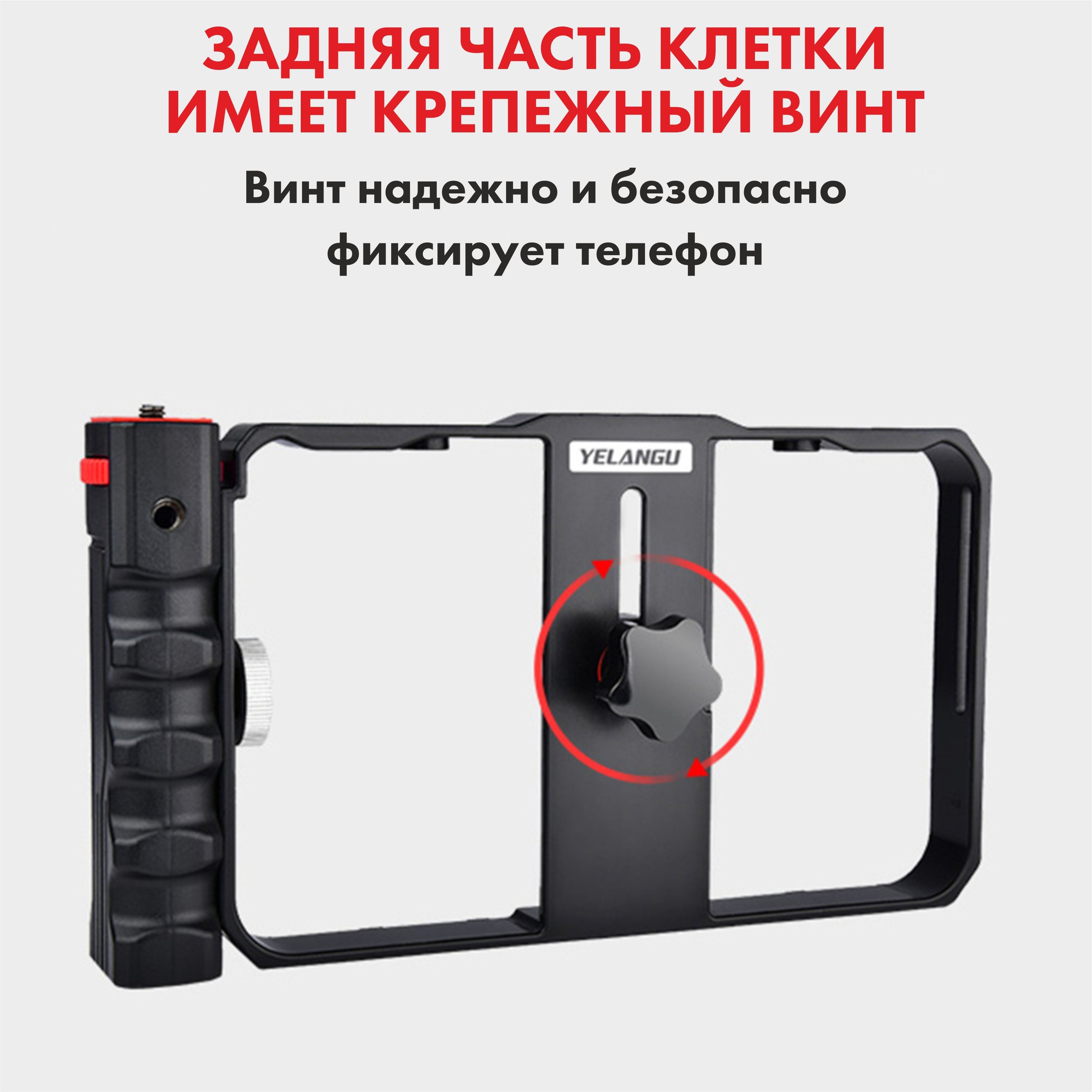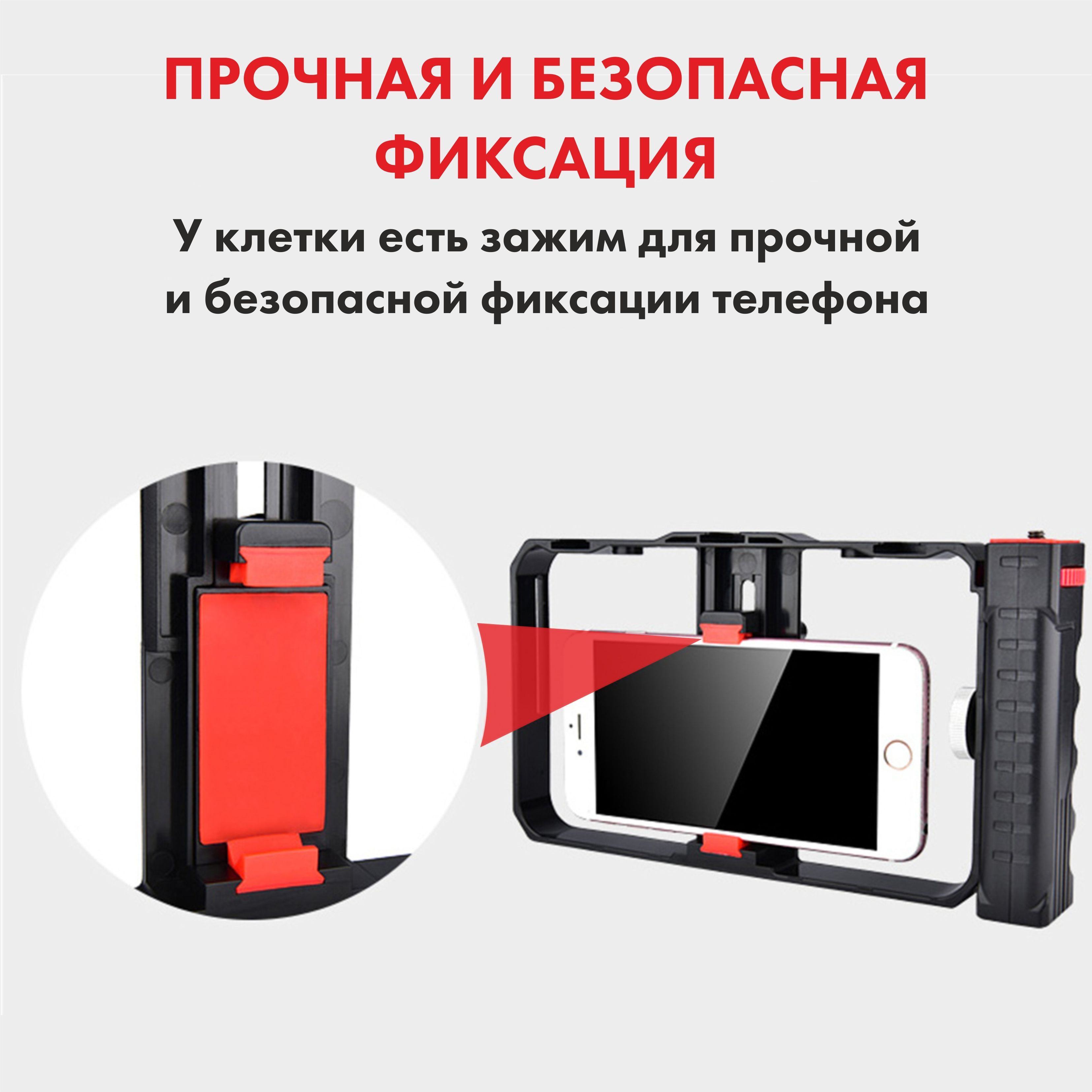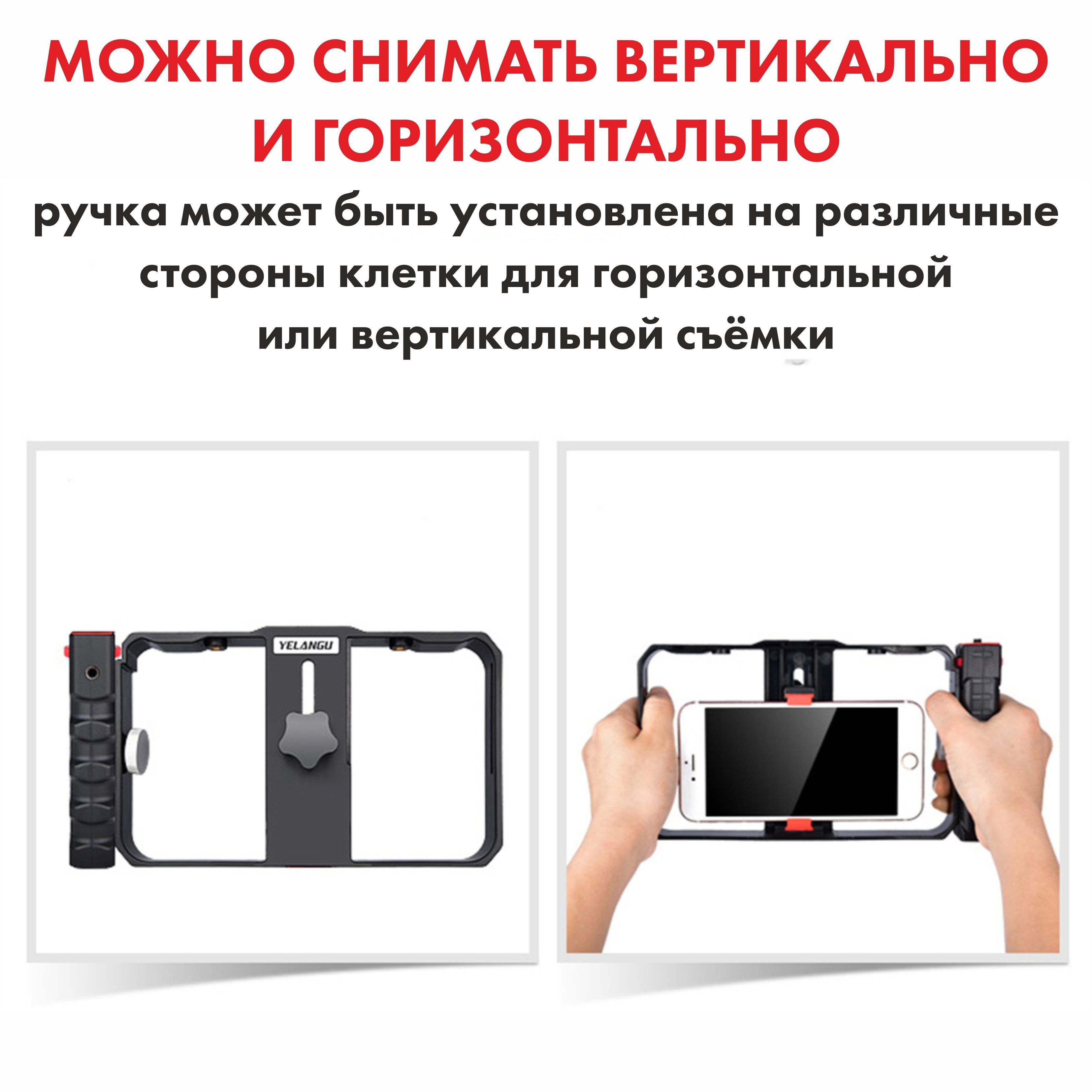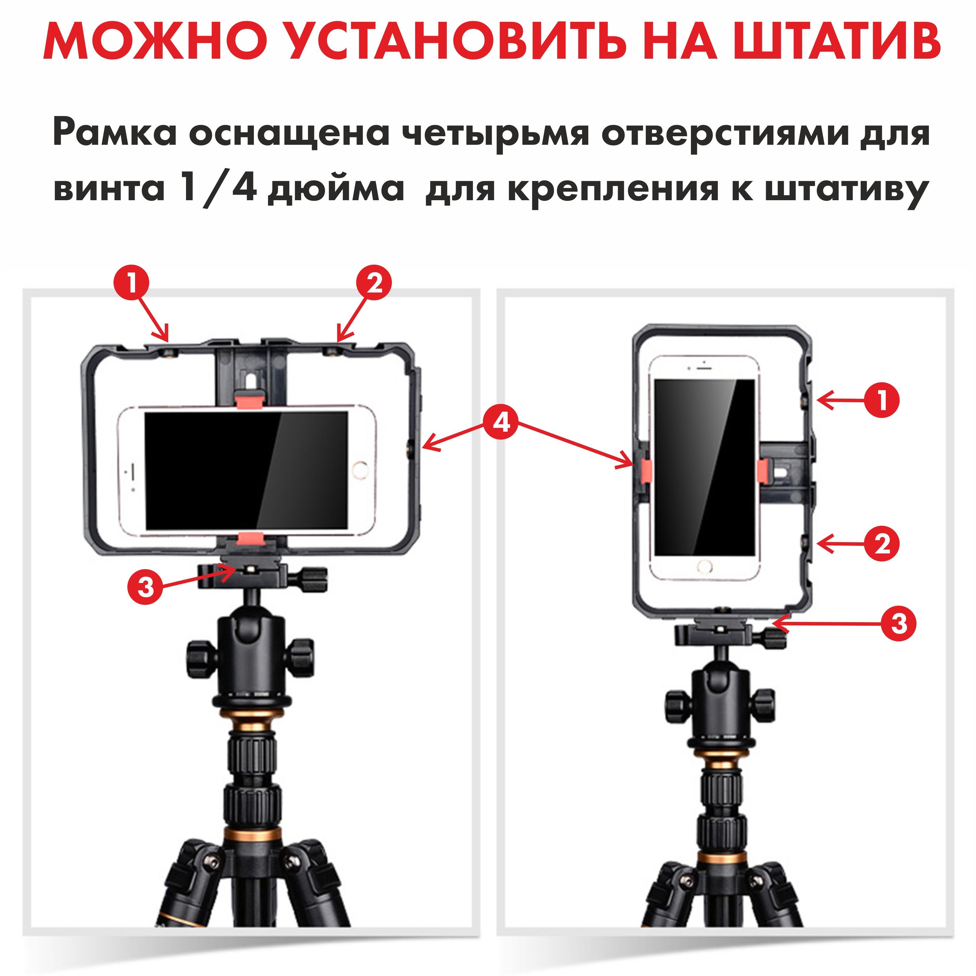 Обеспечивает плавную съемку без лишних вибрацийРамка-держатель для мобильного телефонаНезаменимый аксессуар, предназначенный для комфортной и стабильной съемки! Наша клетка идеально подходит для работы с любым смартфоном шириной от 55 до 86 мм, позволяя вам в полной мере раскрыть свой творческий потенциал.Оснащенный четырьмя разъемами с резьбой 1/4 дюйма, этот держатель обеспечивает невероятную гибкость в использовании аксессуаров для съемки. Вы можете одновременно закрепить микрофон, вспышку и другие дополнительные аксессуары и установить эту конструкцию на универсальный напольный штатив, чтобы создать еще более профессиональные и качественные фото и видео.Благодаря возможности крепления телефона в этом держателе на монопод трипод или штатив, клетка обеспечивает стабильность при съемке, что особенно полезно при создании видео или работы в условиях низкого освещения. Теперь ваш штатиф трипод для телефона, фотоаппарата или камеры может быть идеальным аксессуаром, помогающим вам получить снимки высокого качества без каких-либо неудобств.С этой клеткой вы можете смело экспериментировать с различными углами съемки. Вам доступны как горизонтальное, так и вертикальное положение телефона, а если еще ваш штатив оснащен пультом и есть шаровая головка, то это все открывает перед вами практически безграничные возможности при съемке различных предметов.Независимо от того, являетесь ли вы профессиональным фотографом или просто любителем съемок, клетка держатель для телефона будет идеальным решением для вас. Она удовлетворит все ваши потребности и подойдет как для фотографии, так и для видеосъемки.Получите непревзойденную стабильность и полный контроль над процессом съемки, используя нашу клетку держателя для телефона. Позвольте своей творческой волне развернуться и никогда больше не пропускайте важные моменты из-за неустойчивых съемок. Выберите нашу клетку держателя для телефона и повысьте уровень своих съемок на новую высоту!