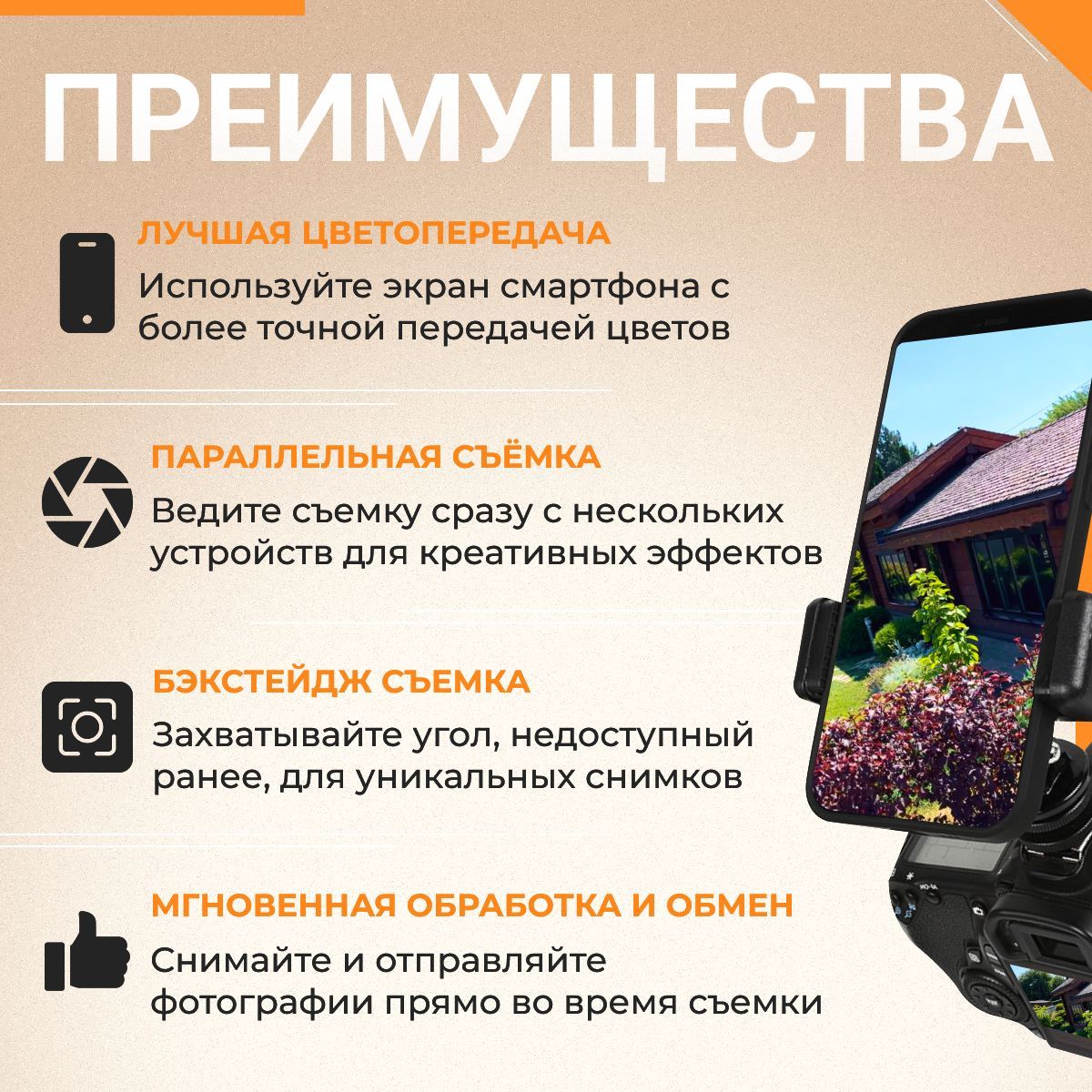 Описание: Держатель, позволяющий легко и удобно присоединять смартфон к фотоаппарату. Преимущества крепления можно разбить на следующие пункты: